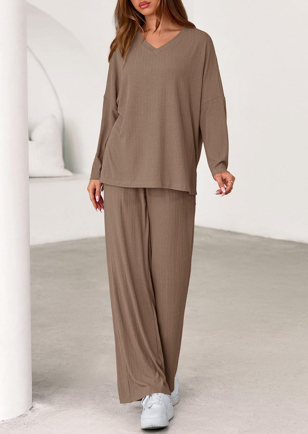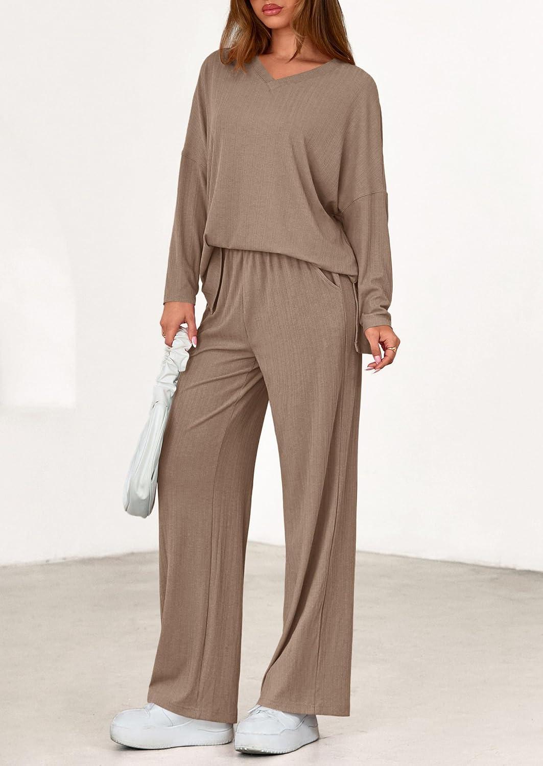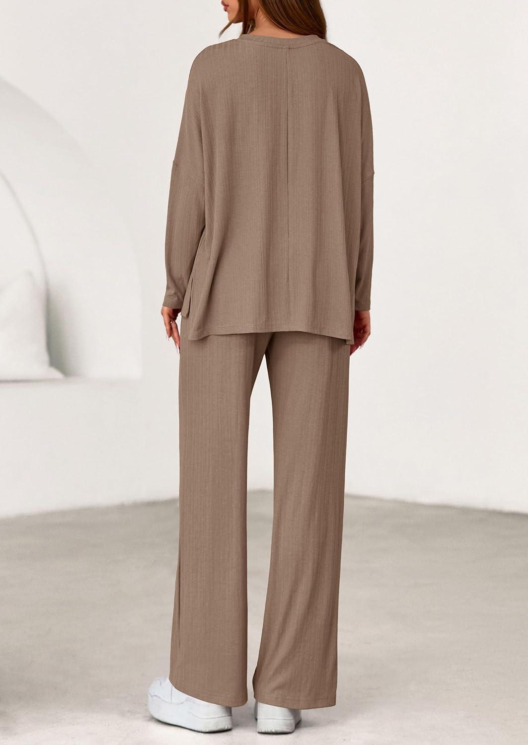 PRETTYGARDEN 2 Piece Lounge Sets for Women Fall Outfits 2025 Casual Loose Long Sleeve Tops Wide Leg Pants Matching Pajama Set(Khaki)