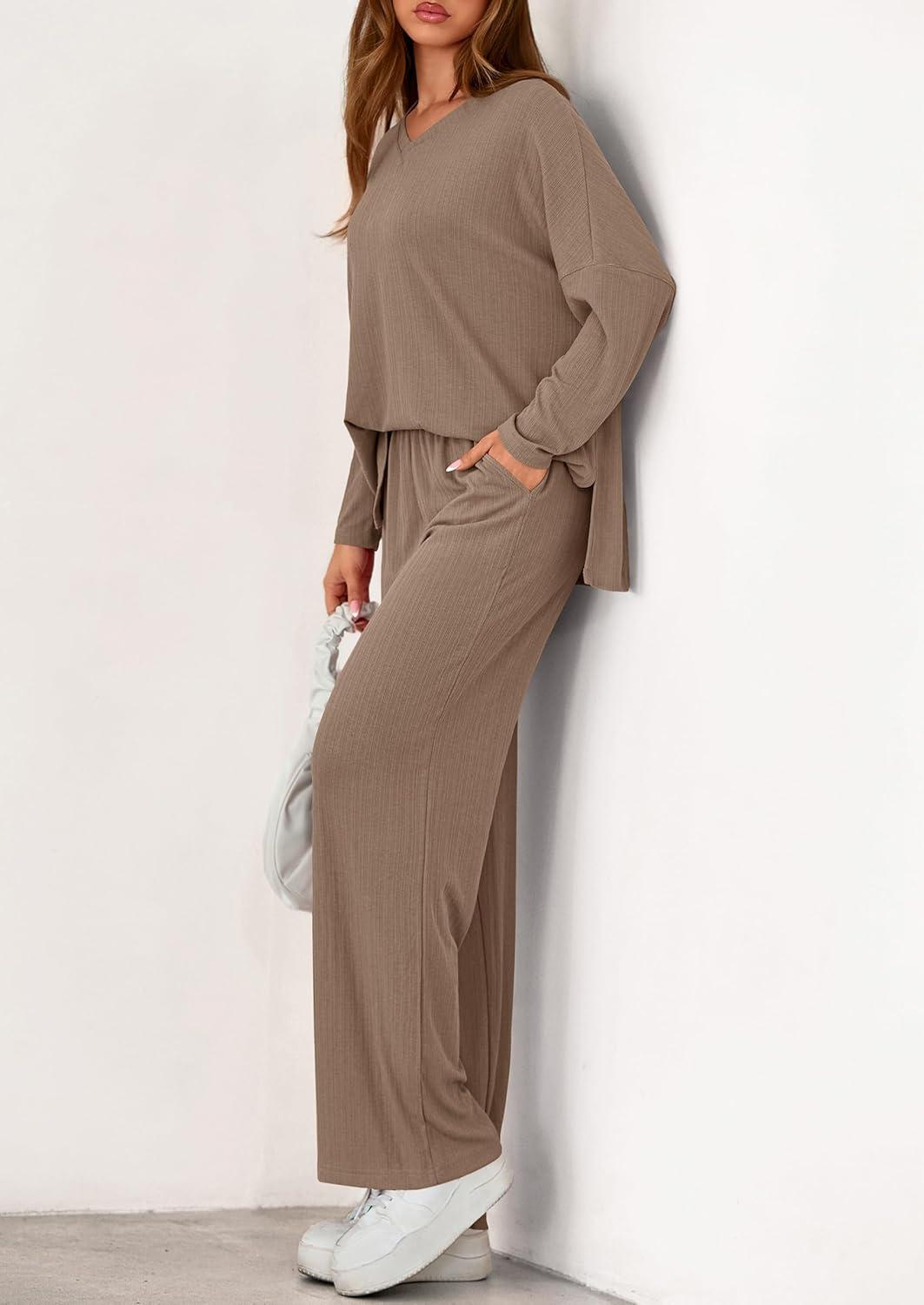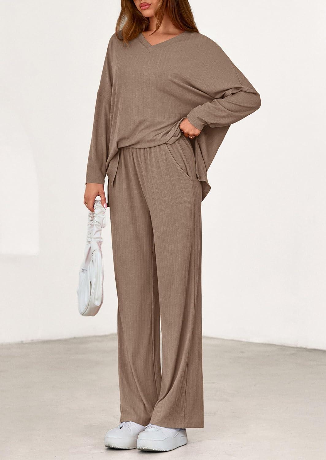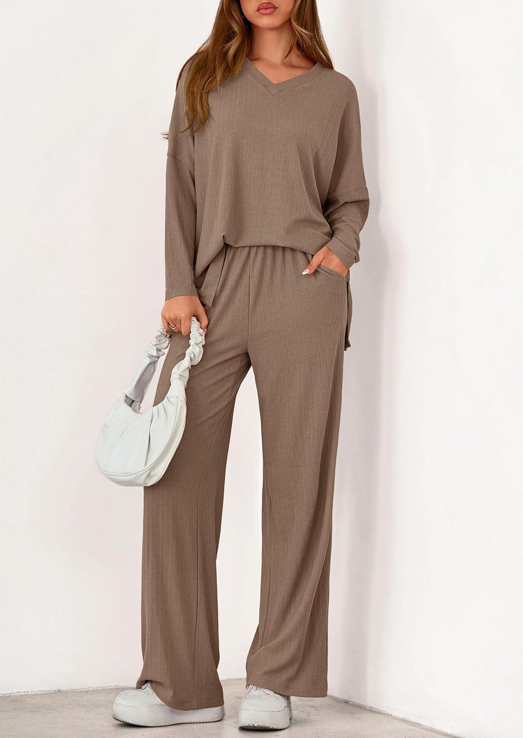 PRETTYGARDEN 2 Piece Lounge Sets for Women Fall Outfits 2025 Casual Loose Long Sleeve Tops Wide Leg Pants Matching Pajama Set(Khaki)