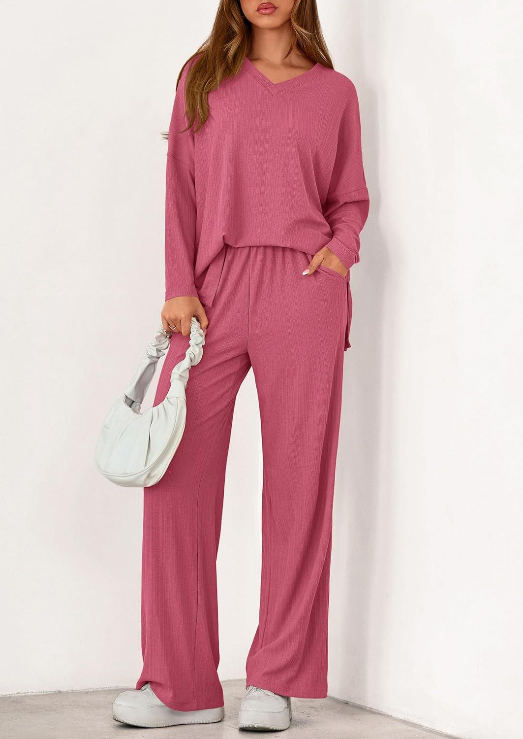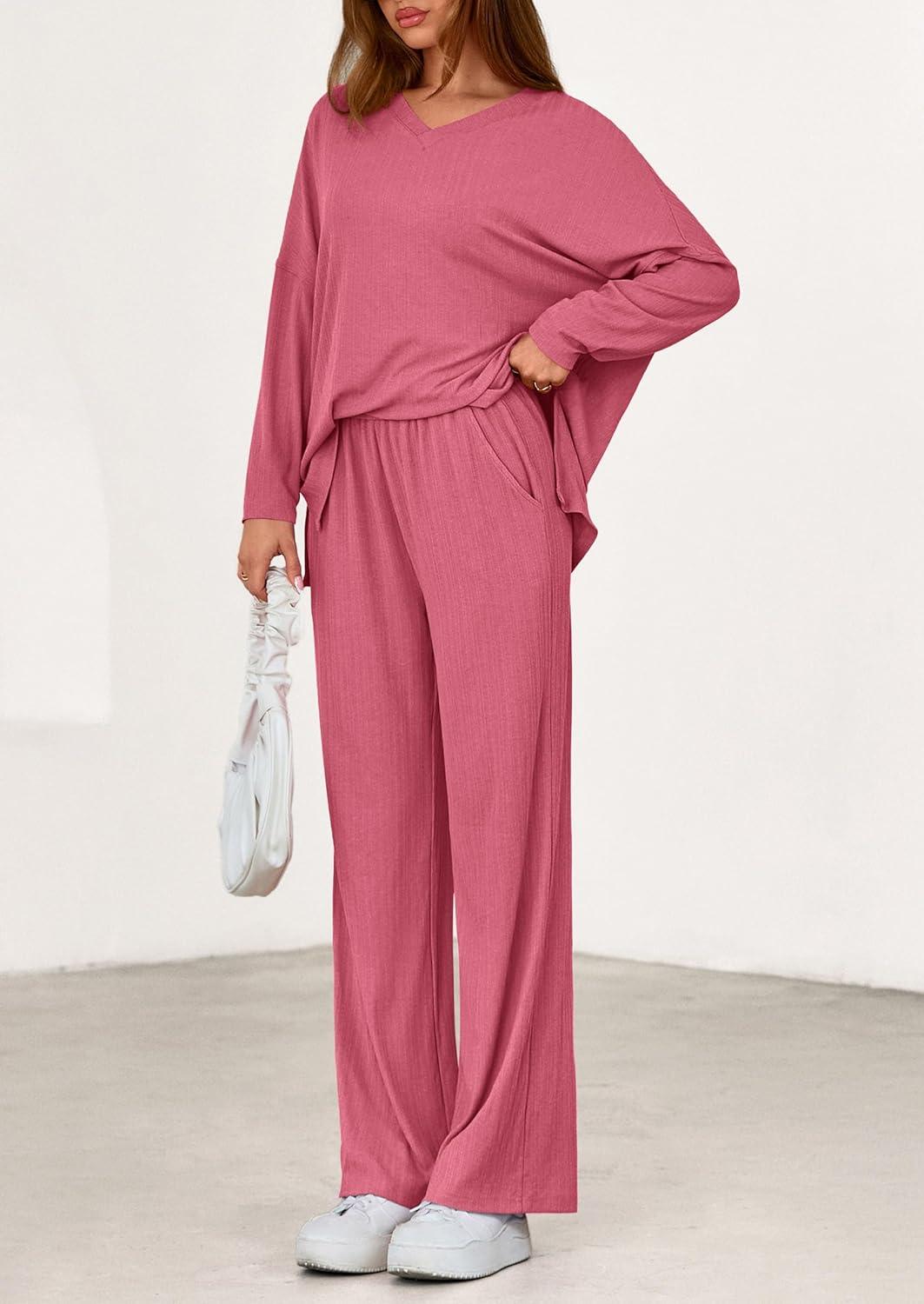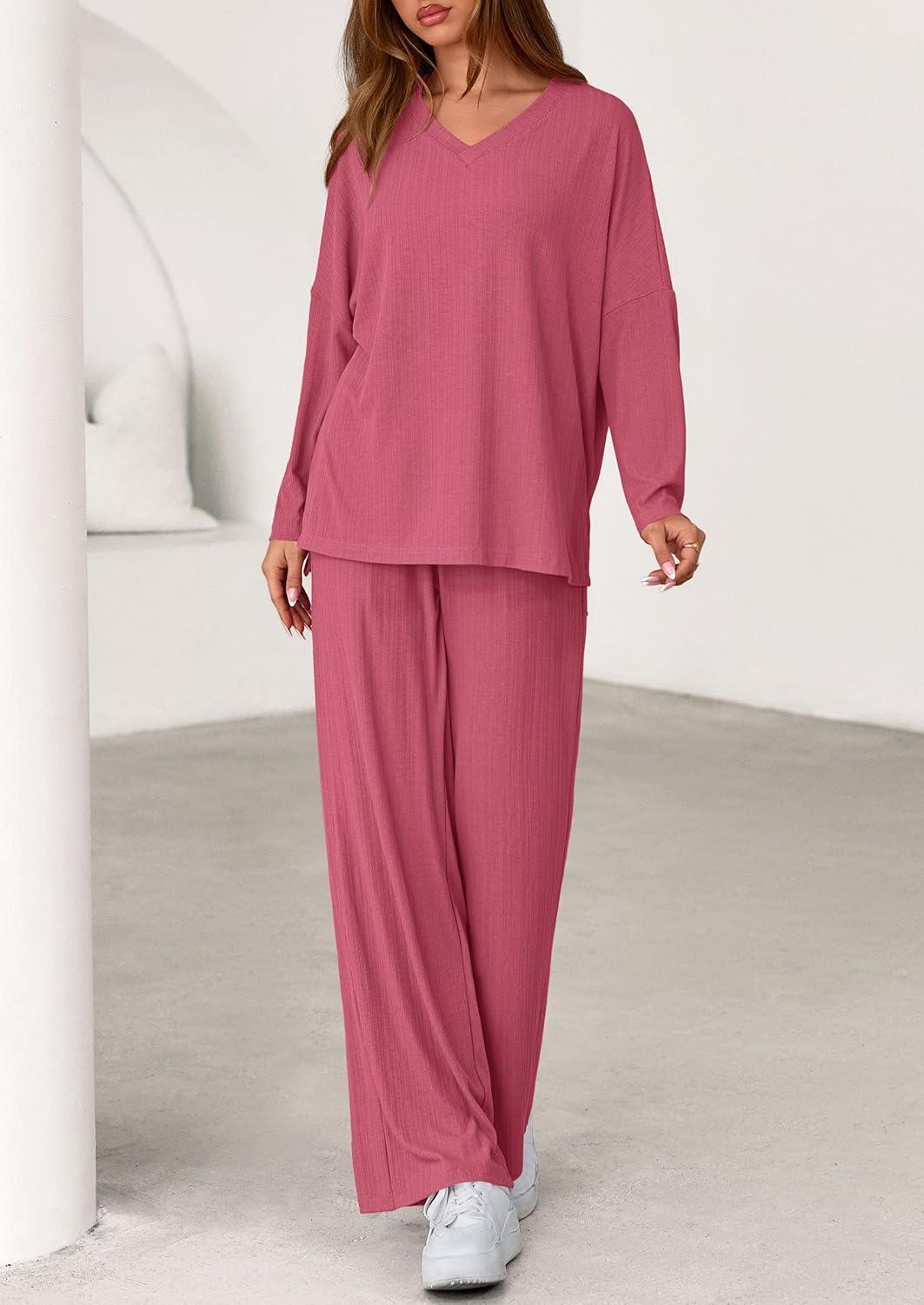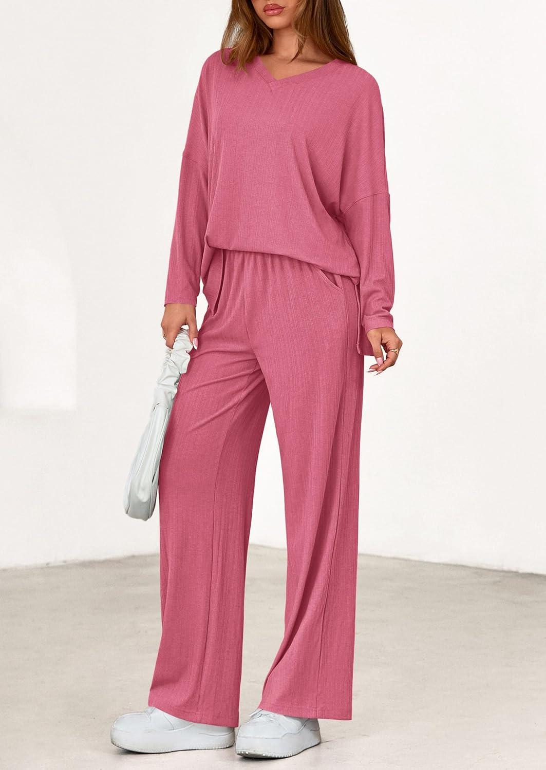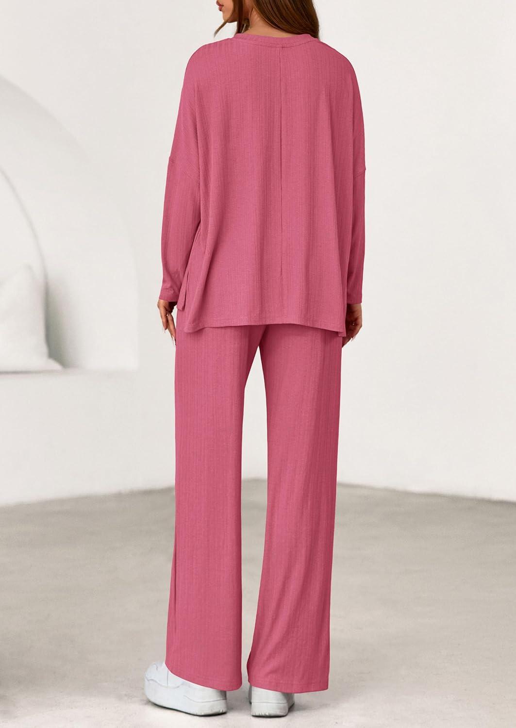 PRETTYGARDEN 2 Piece Lounge Sets for Women Fall Outfits 2025 Casual Loose Long Sleeve Tops Wide Leg Pants Matching Pajama Set(Pink)