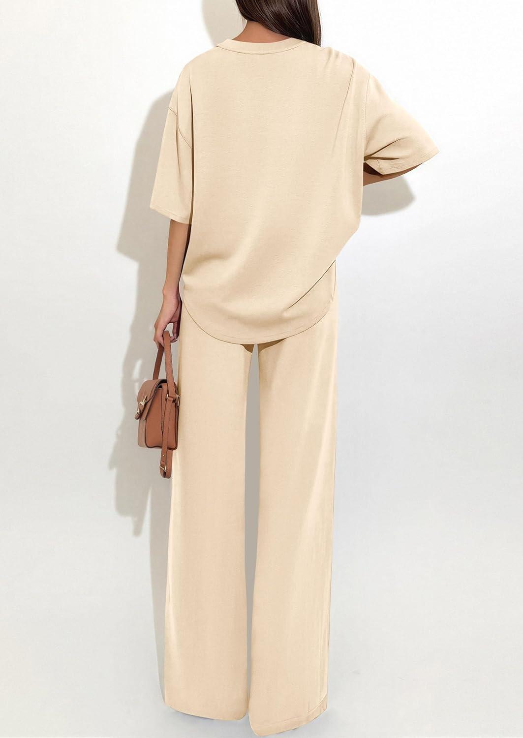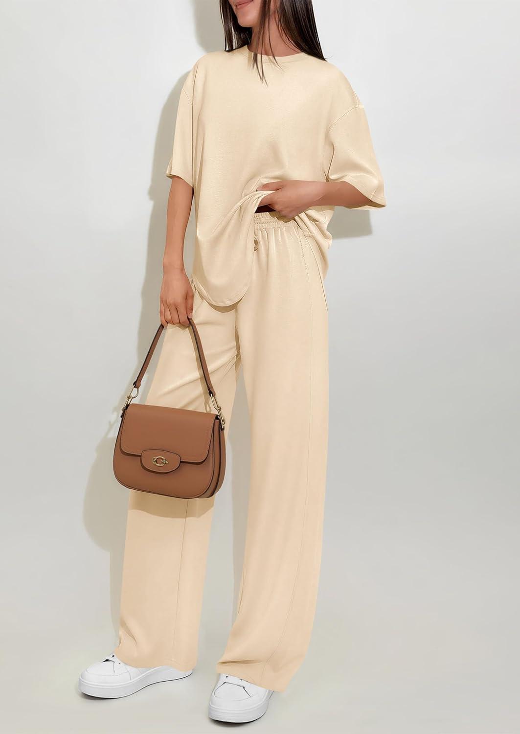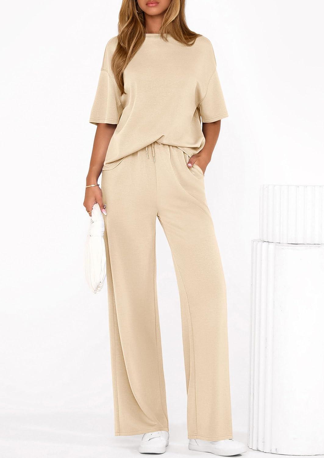 PRETTYGARDEN 2 Piece Lounge Sets for Women Summer 2026 Short Sleeve Matching Airport Travel Outfits Casual Spring Clothes(Beige)