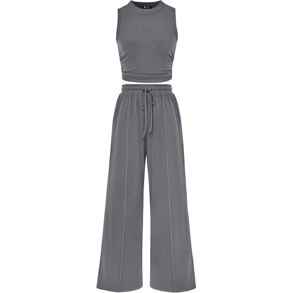 PRETTYGARDEN 2 Piece Sets for Women 2025 Summer Sleeveless Tank Ribbed Travel Beach Vacation Spring Lounge Wear Outfits(Grey)