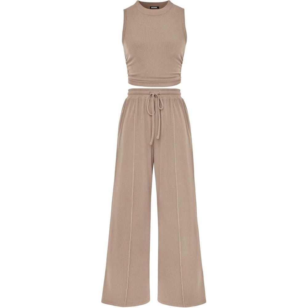 PRETTYGARDEN 2 Piece Sets for Women 2025 Summer Sleeveless Tank Ribbed Travel Beach Vacation Spring Lounge Wear Outfits(Khaki)