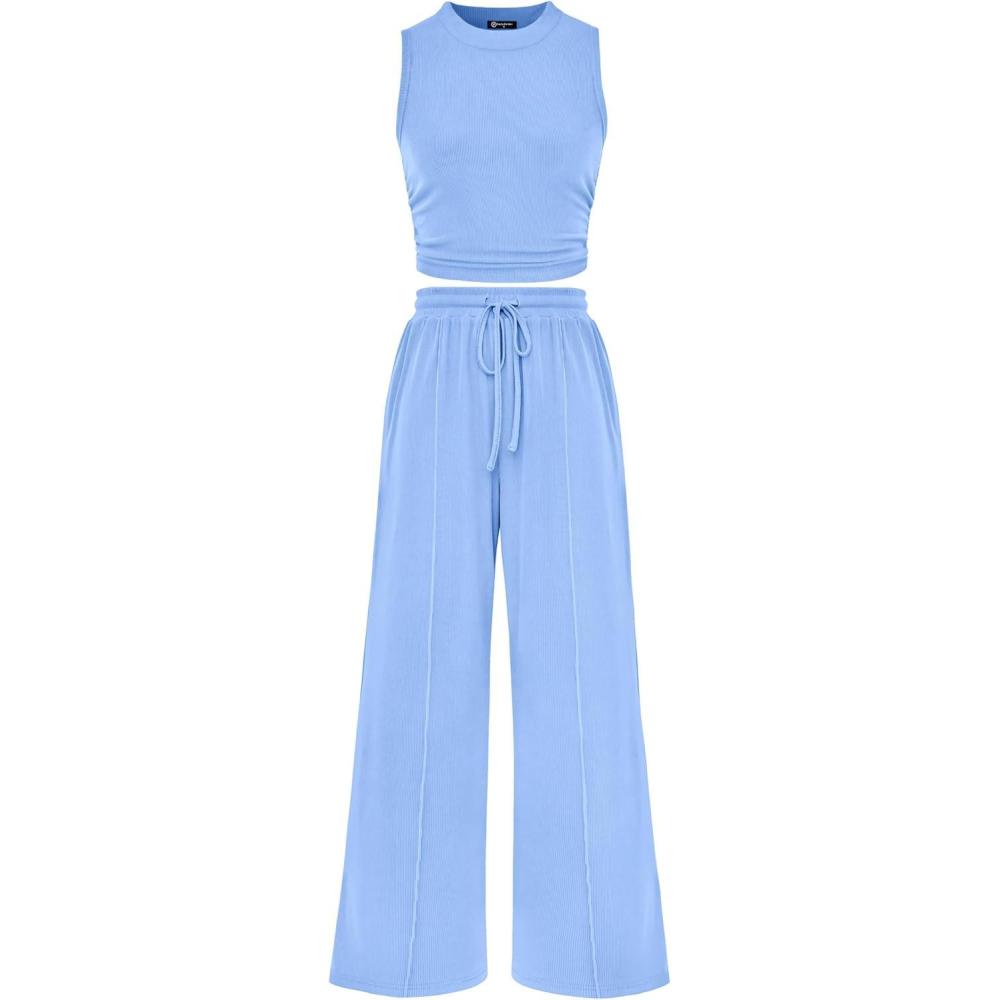 PRETTYGARDEN 2 Piece Sets for Women 2025 Summer Sleeveless Tank Ribbed Travel Beach Vacation Spring Lounge Wear Outfits(Light Blue)