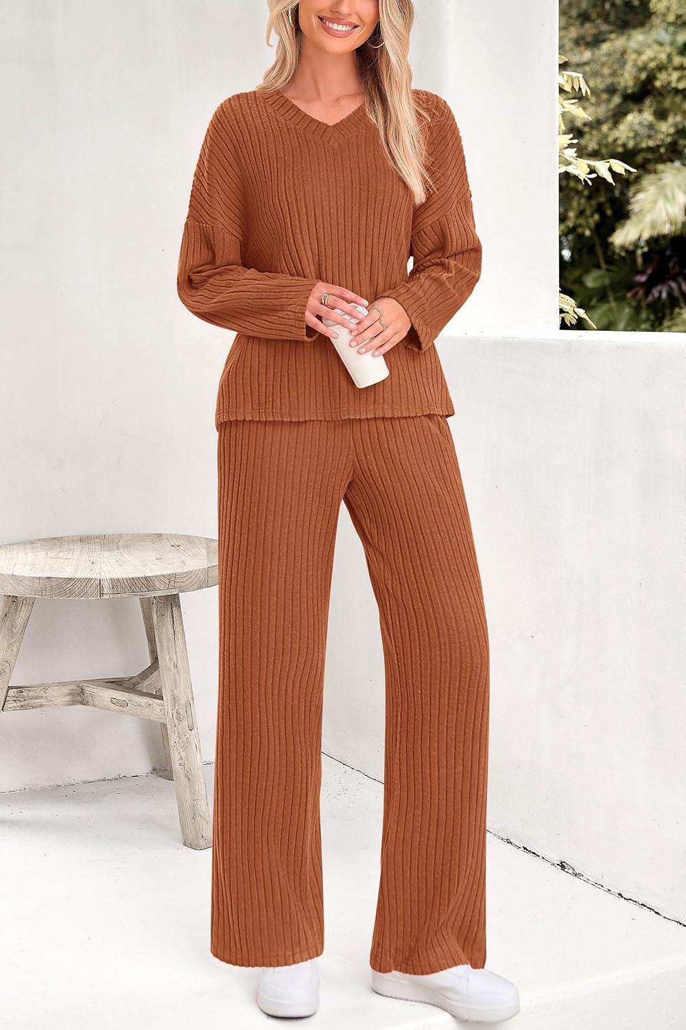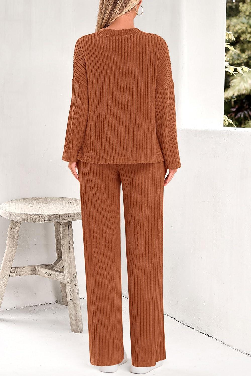 PRETTYGARDEN 2 Piece Sets for Women Fall 2025 Soft Comfy Lounge Long Sleeve Pajamas Set Knit Postpartum Pj Outfits Clothing(Yellow Brown)