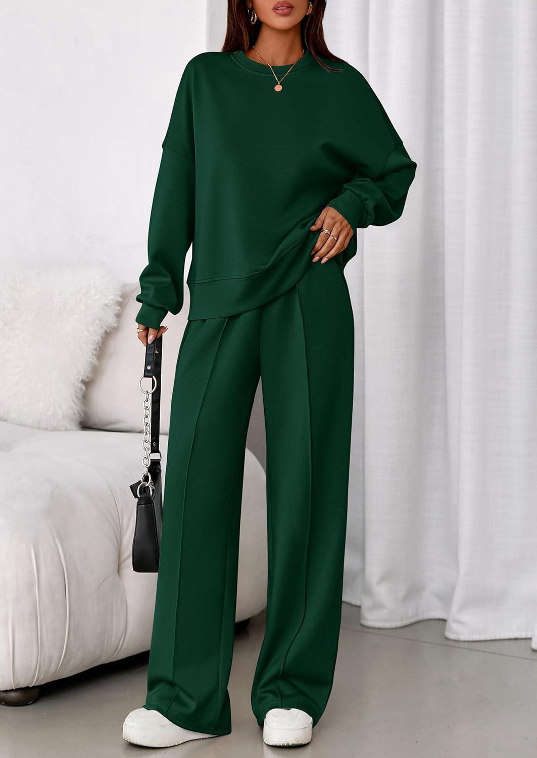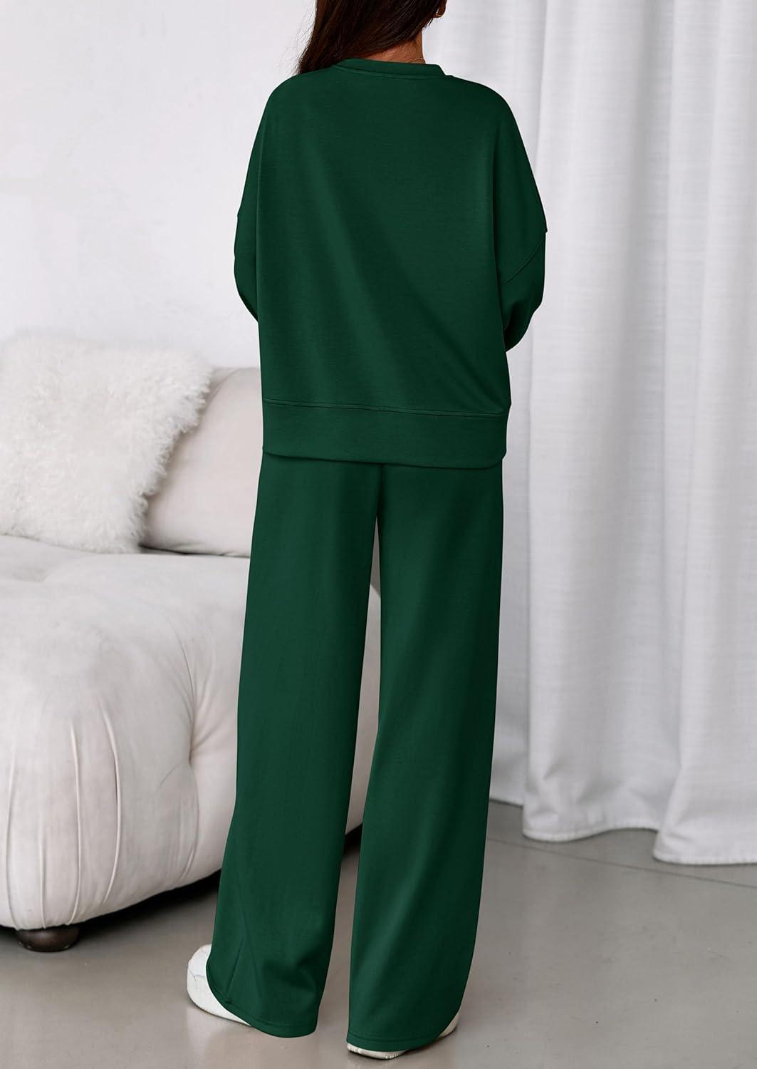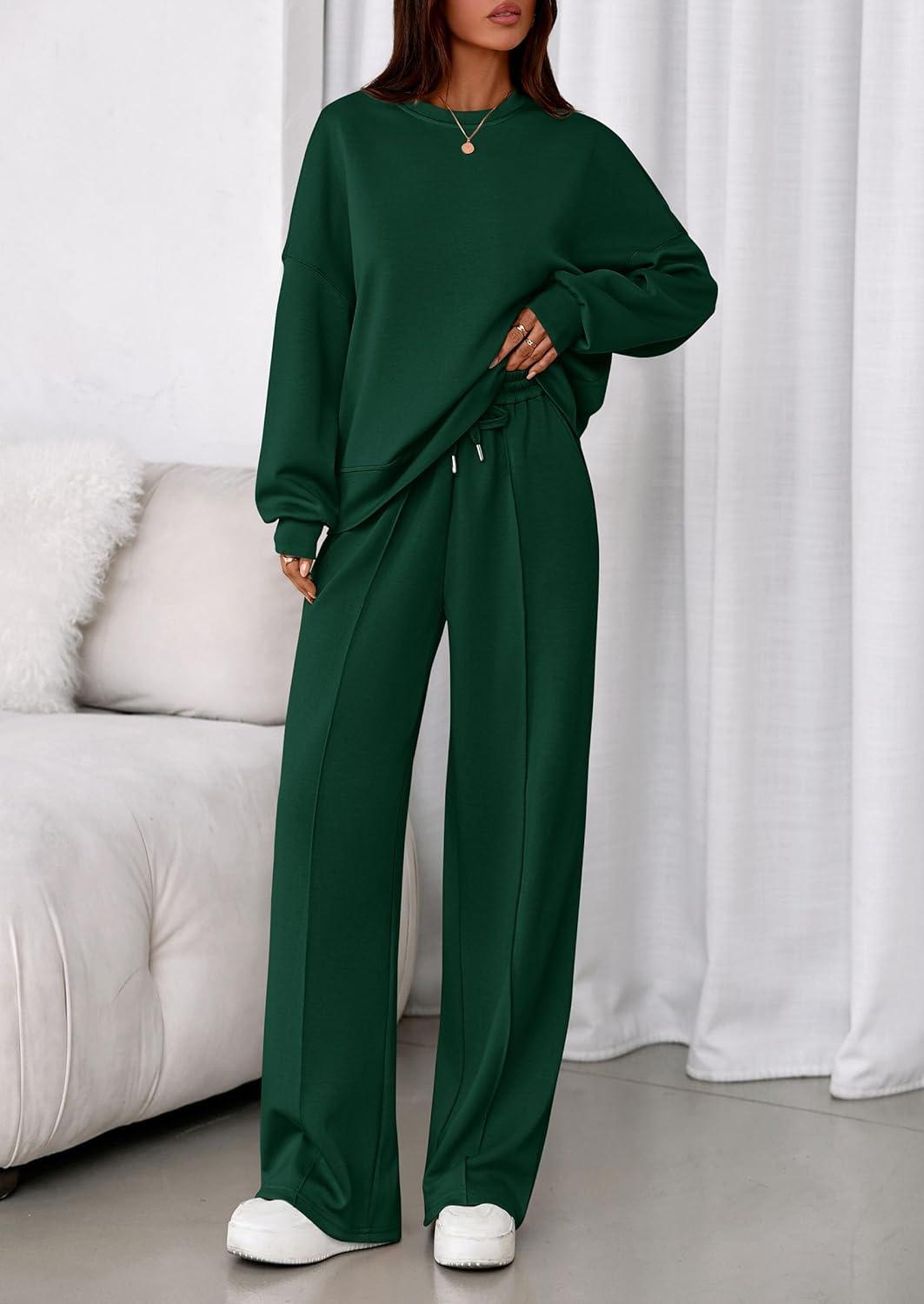 PRETTYGARDEN 2 Piece Sets For Women Fall Trendy Long Sleeve Sweatshirt Wide Leg Pants Loungewear Set Matching Sweatsuit(Dark Green)