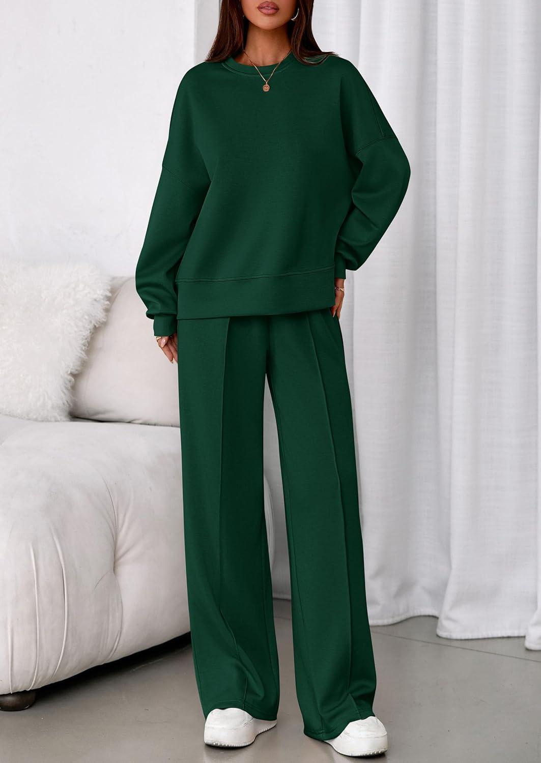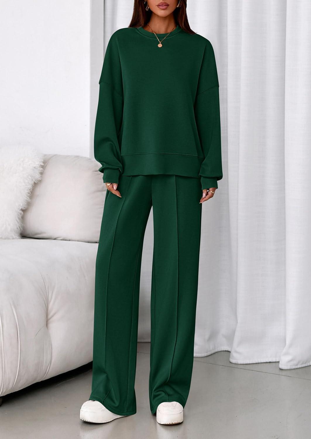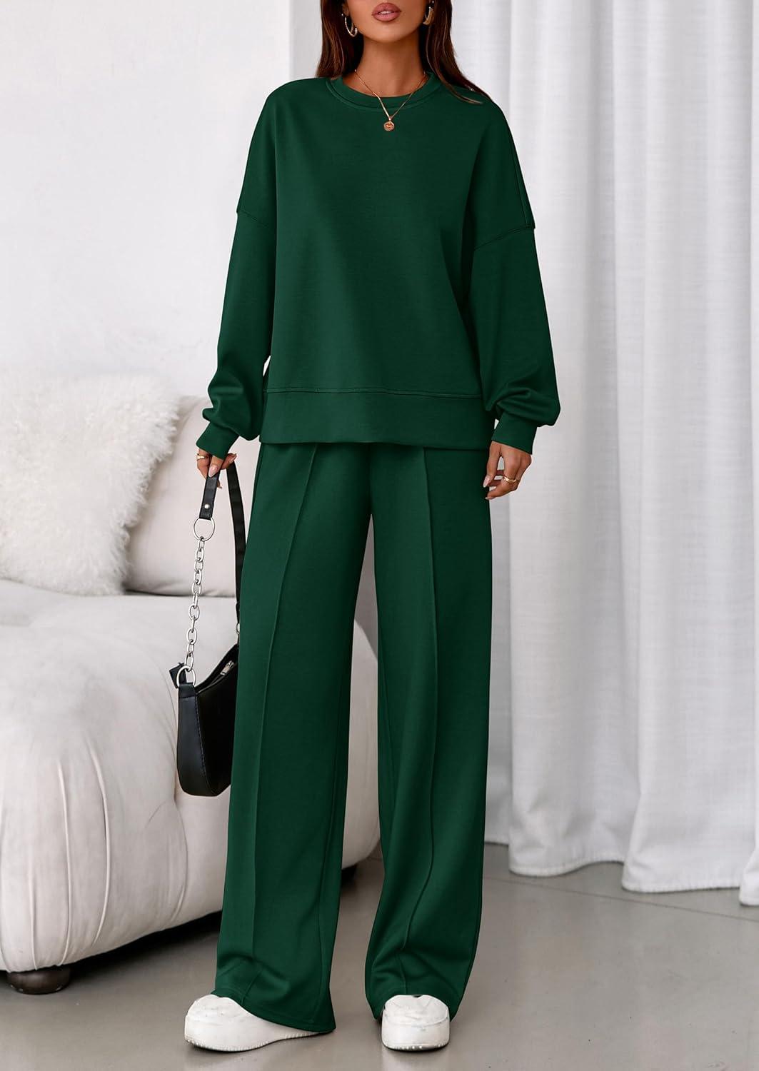 PRETTYGARDEN 2 Piece Sets For Women Fall Trendy Long Sleeve Sweatshirt Wide Leg Pants Loungewear Set Matching Sweatsuit(Dark Green)