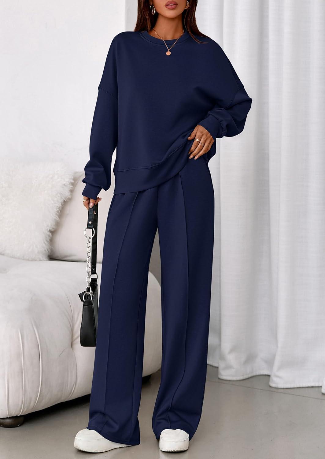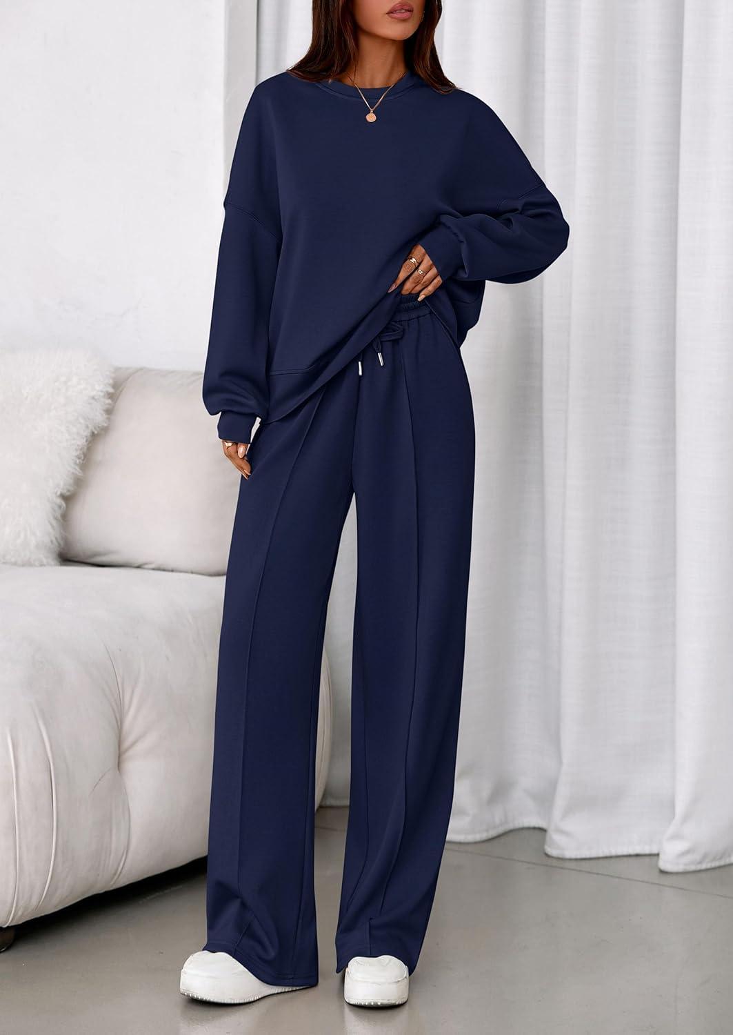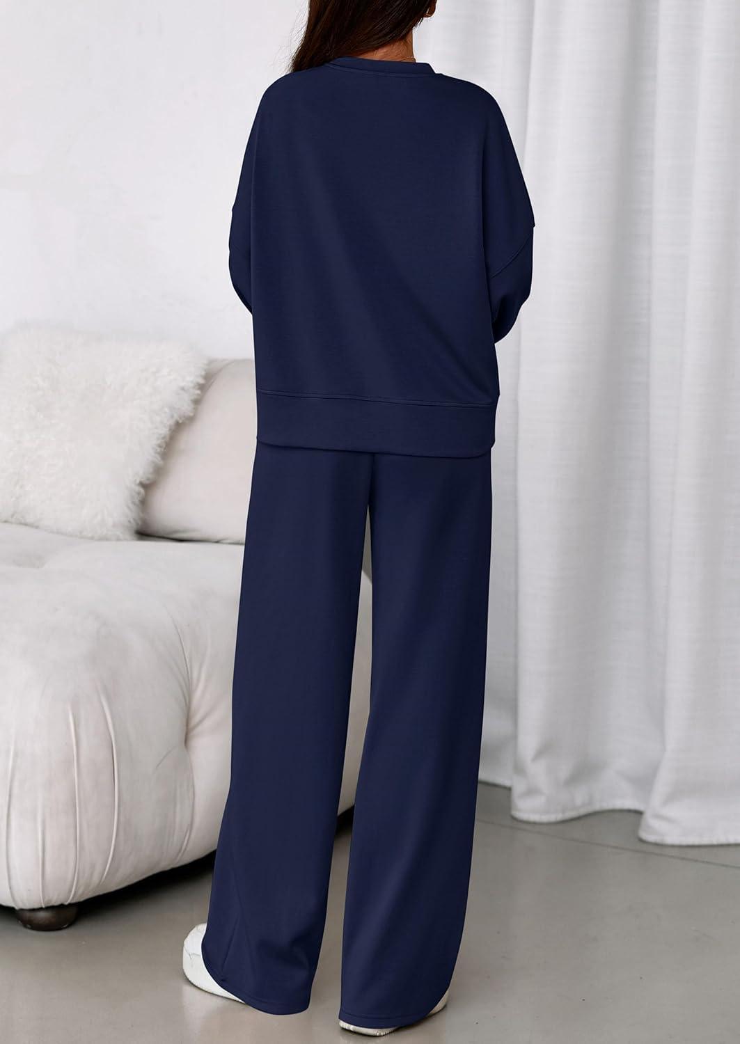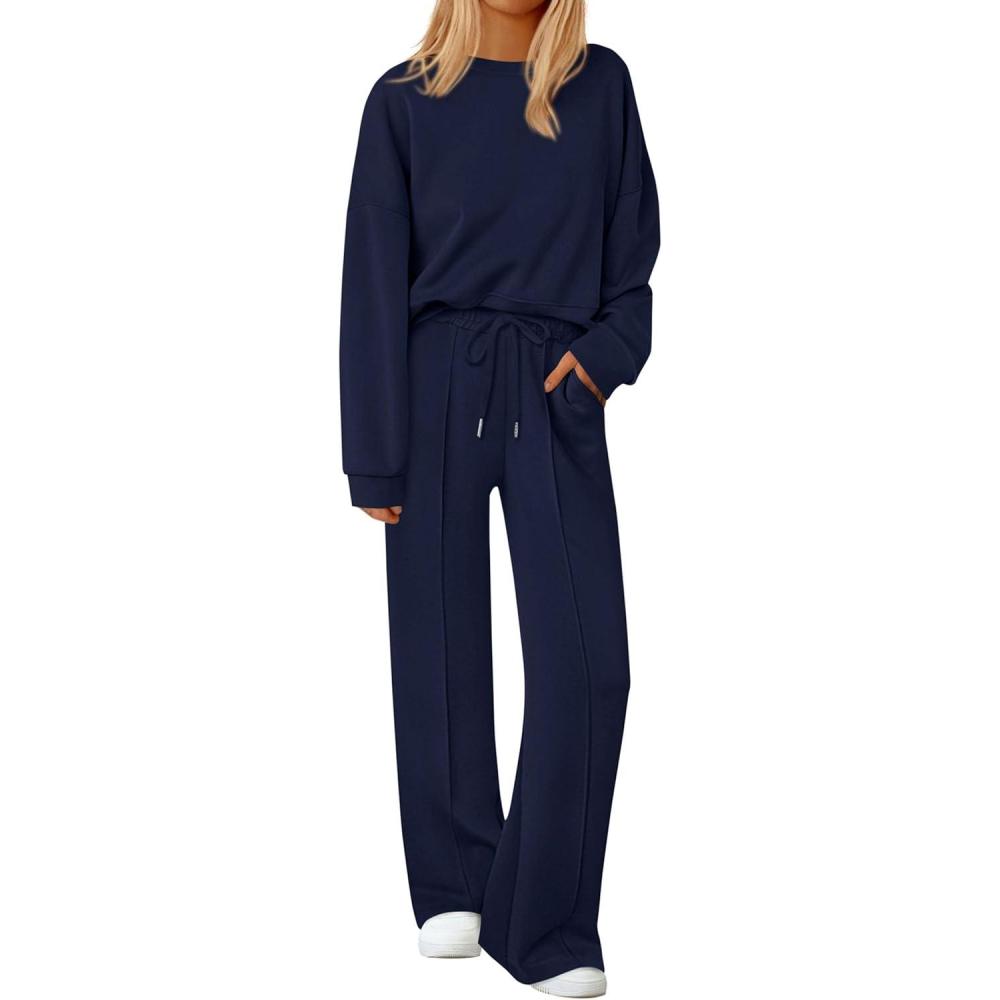 PRETTYGARDEN 2 Piece Sets For Women Fall Trendy Long Sleeve Sweatshirt Wide Leg Pants Loungewear Set Matching Sweatsuit(Navy)