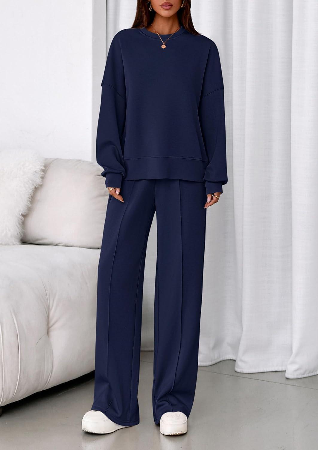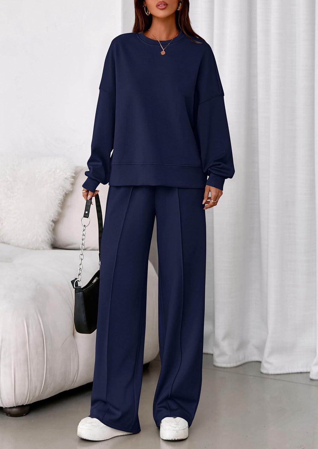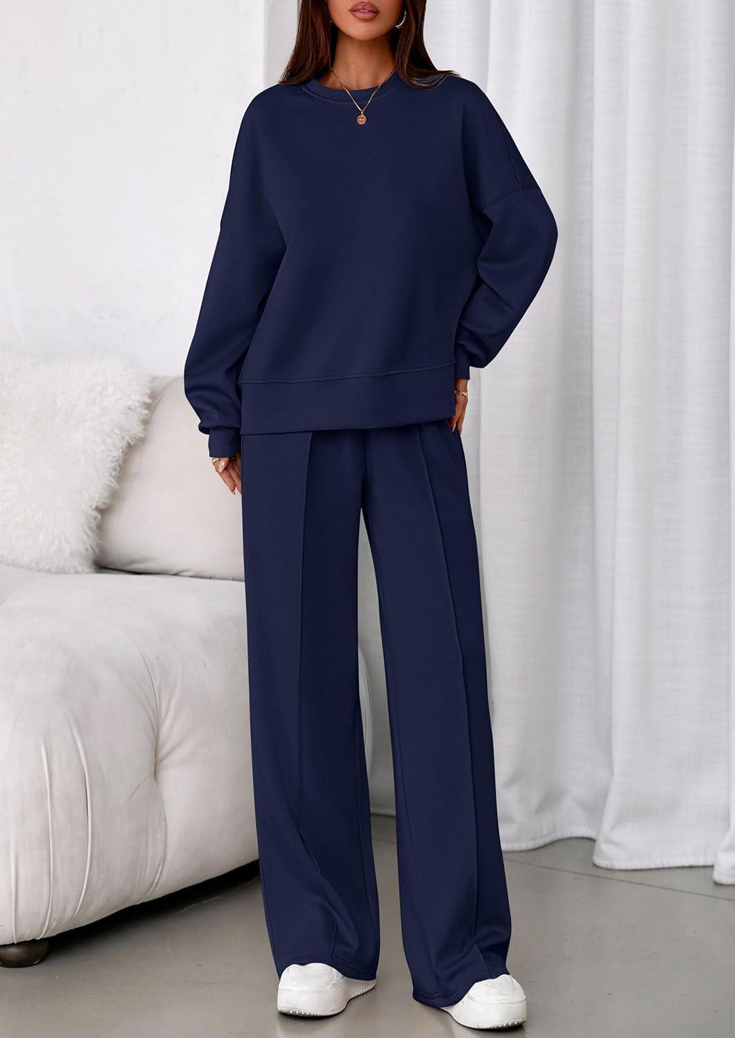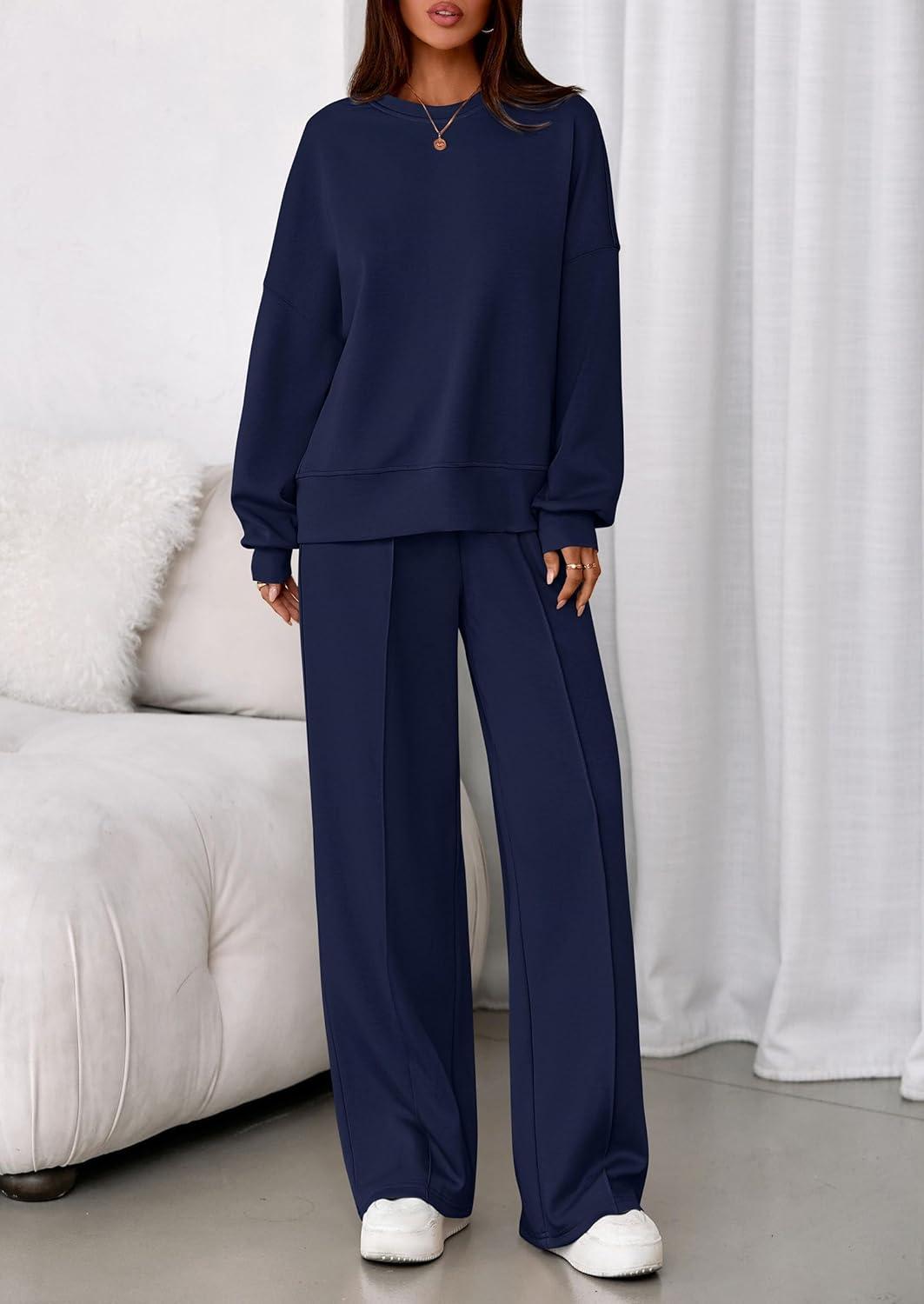 PRETTYGARDEN 2 Piece Sets For Women Fall Trendy Long Sleeve Sweatshirt Wide Leg Pants Loungewear Set Matching Sweatsuit(Navy)