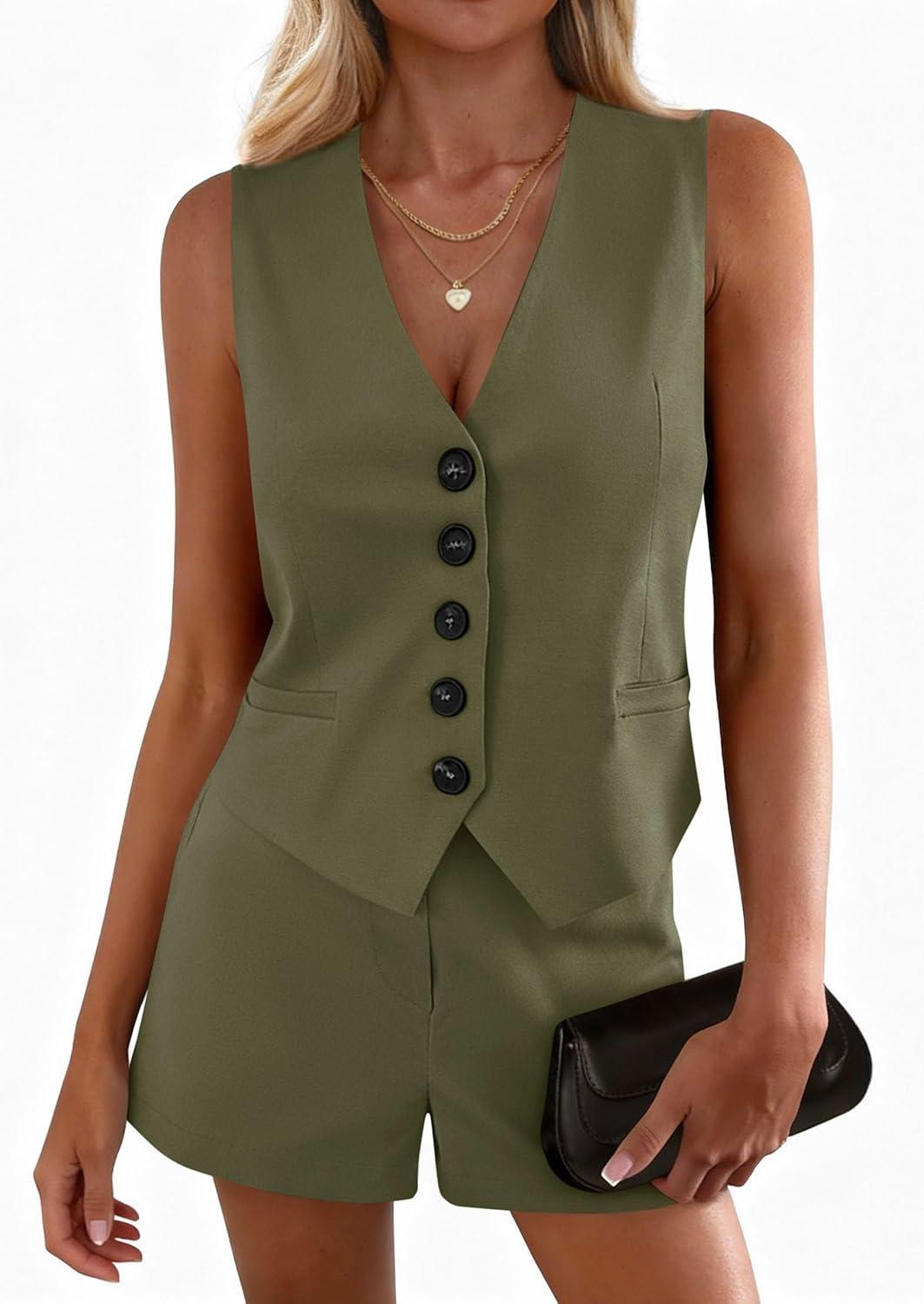 PRETTYGARDEN 2 Piece Sets for Women Spring Fashion 2026 Button Vest Tops High Waist Shorts Summer Business Casual Outfits(Army Green)