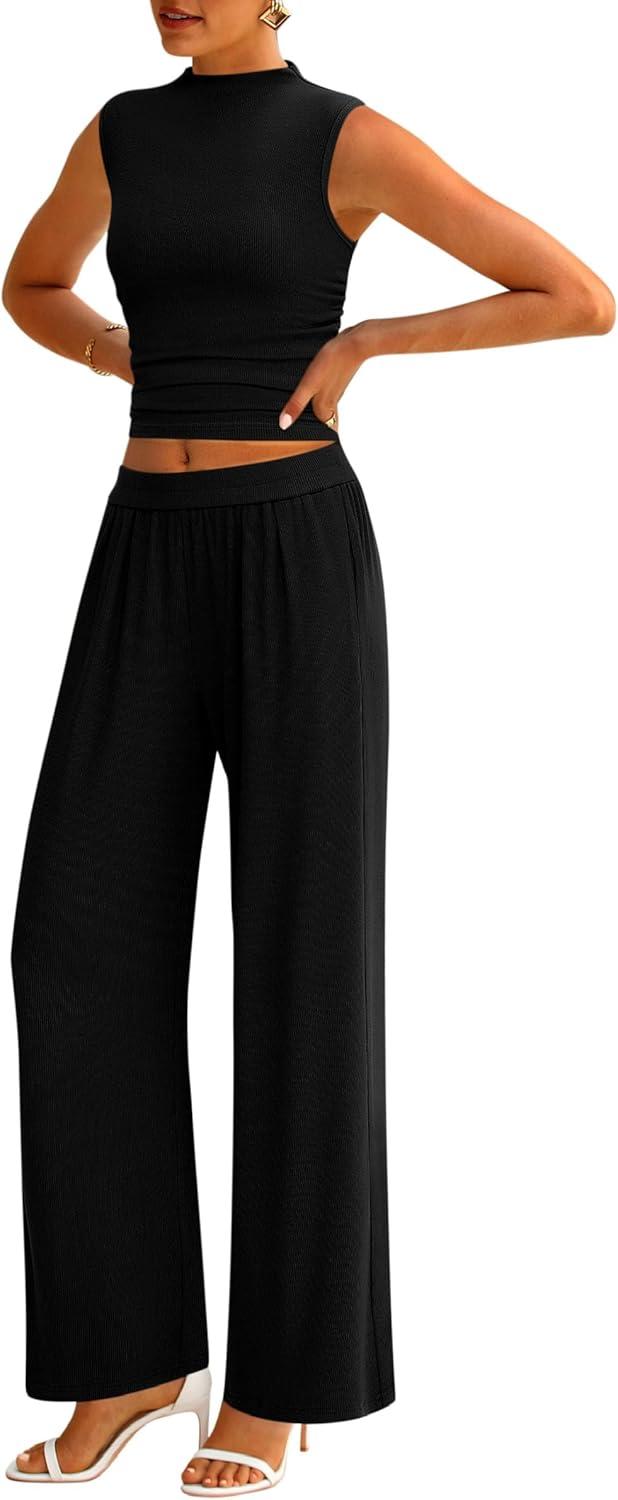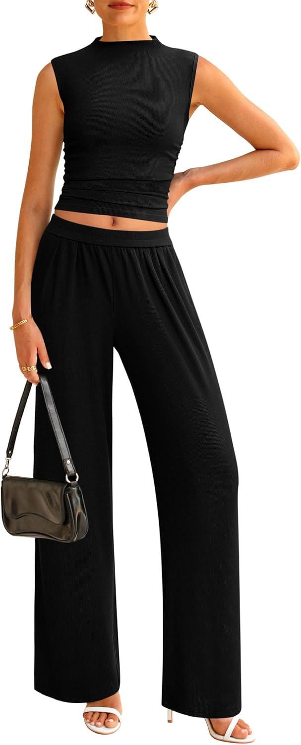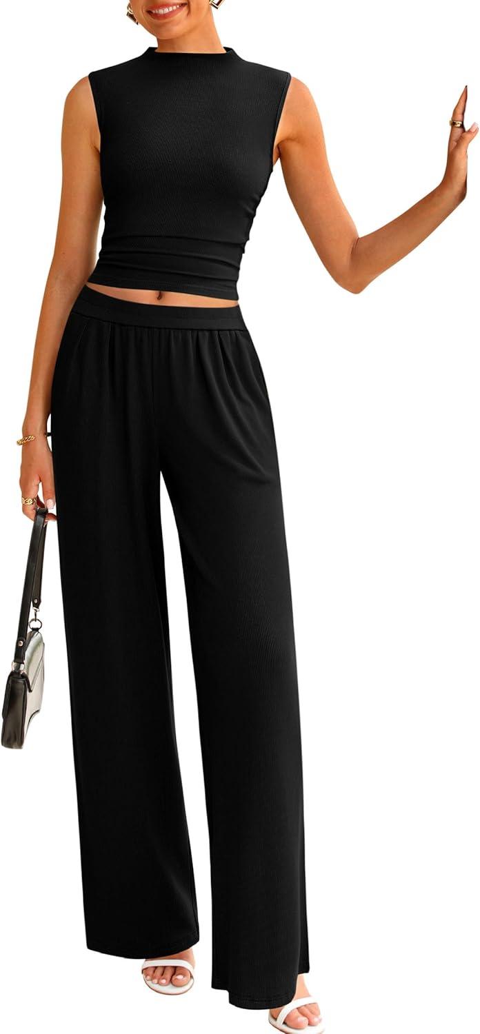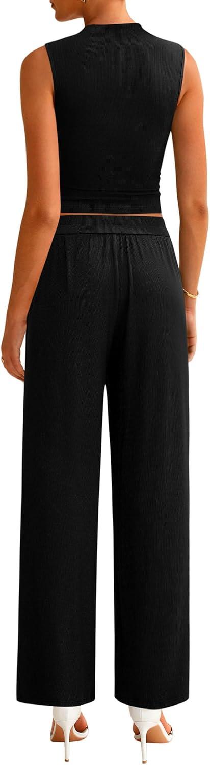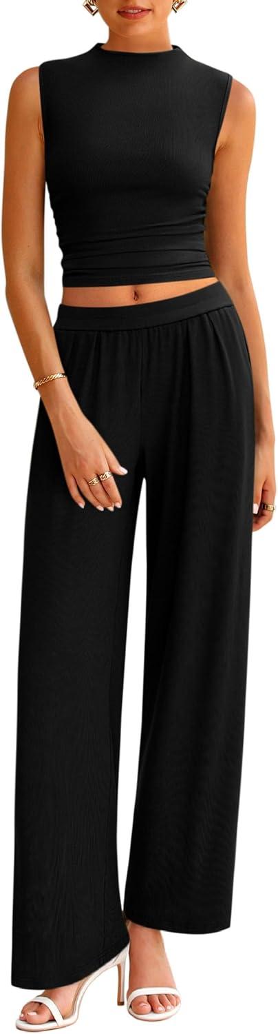 PRETTYGARDEN 2 Piece Sets for Women Summer 2025 Airport Travel Outfits Crop Tank Tops Wide Leg Pants Matching Lounge Sets(Black)