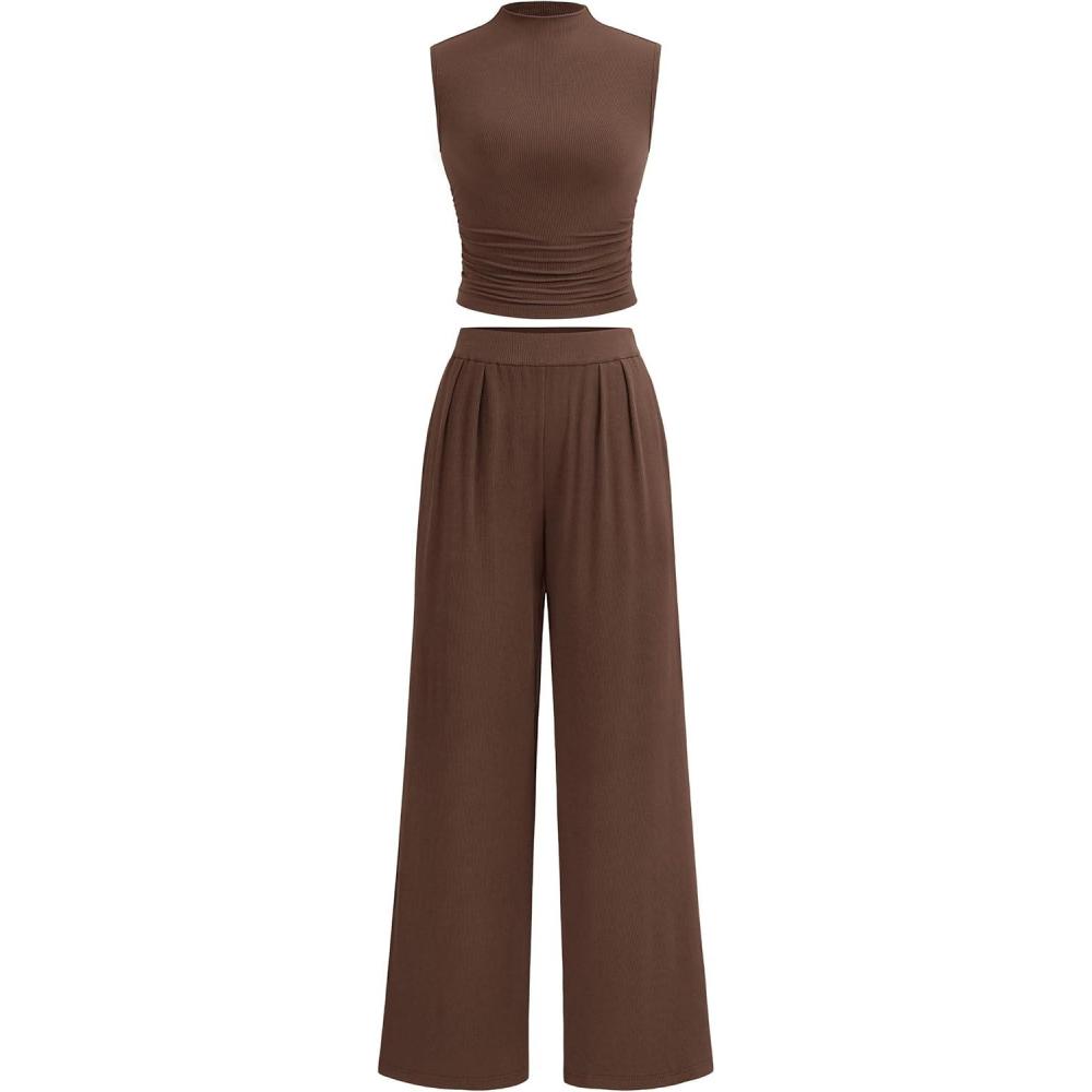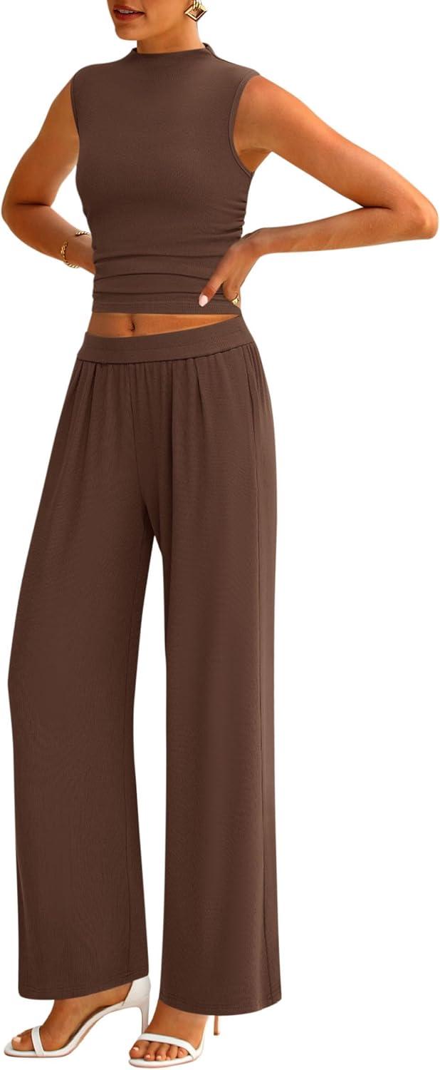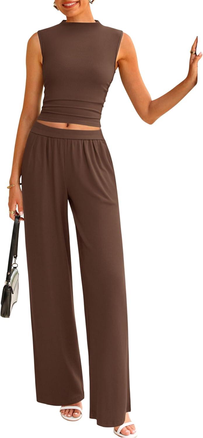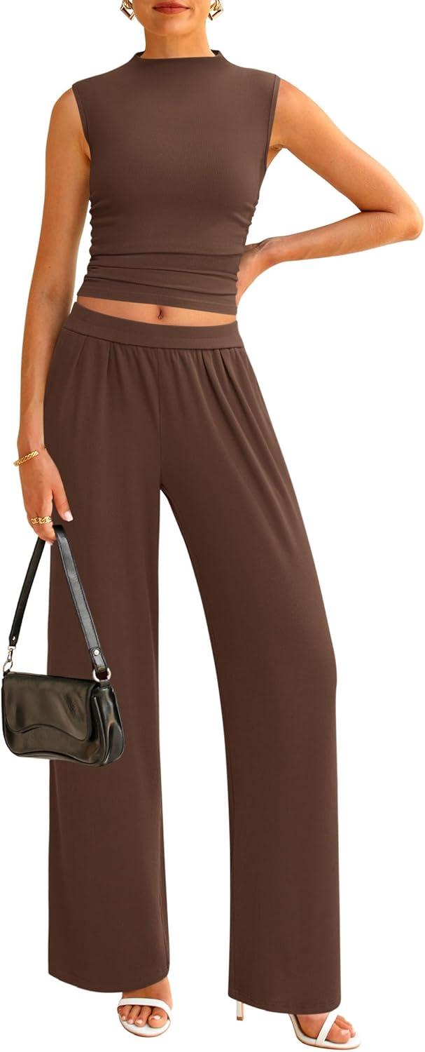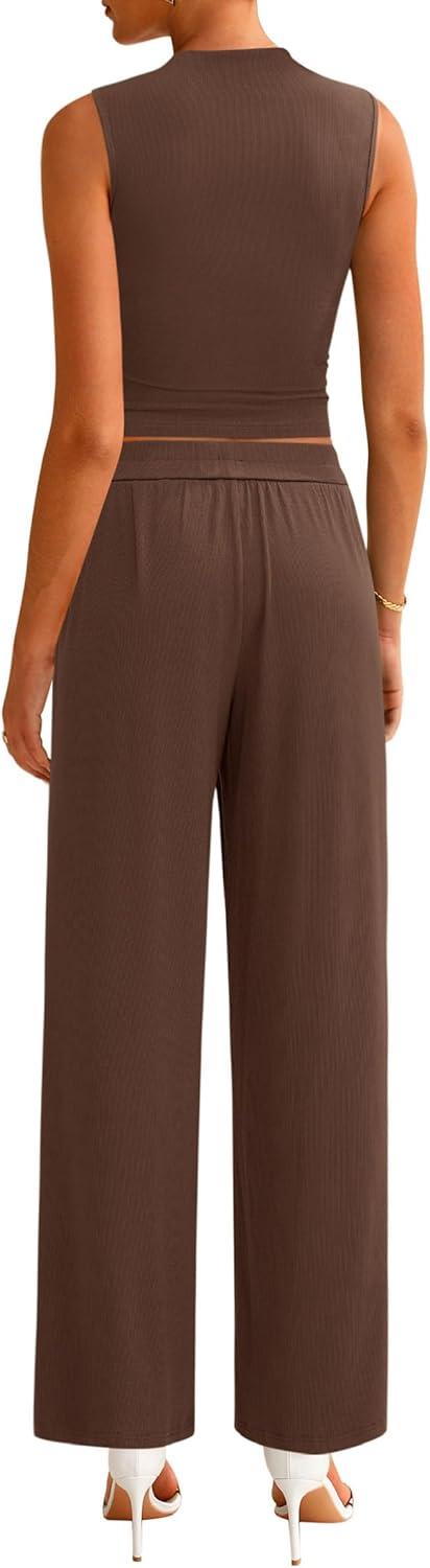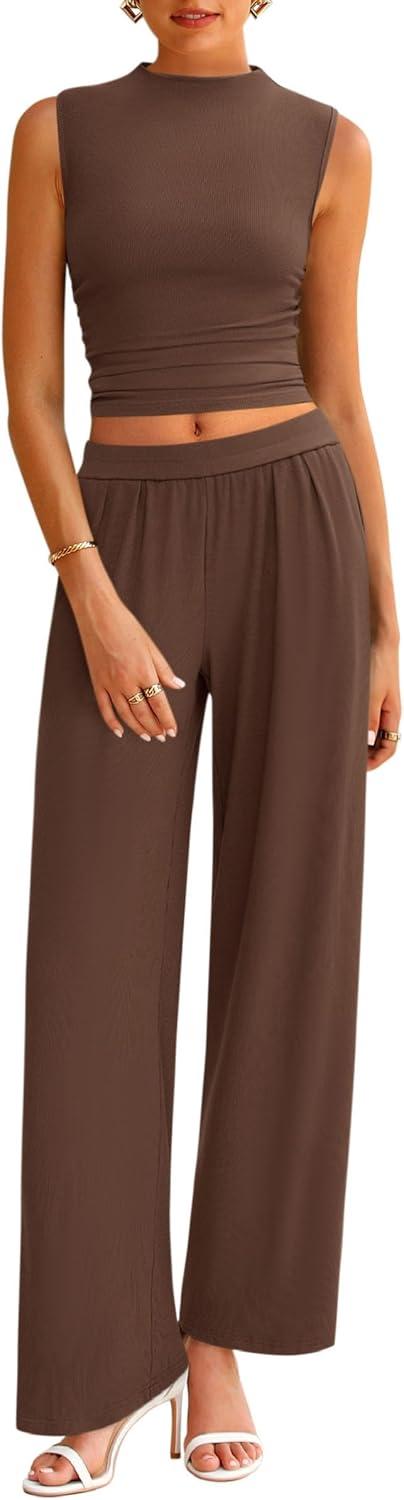 PRETTYGARDEN 2 Piece Sets for Women Summer 2025 Airport Travel Outfits Crop Tank Tops Wide Leg Pants Matching Lounge Sets(Coffee)