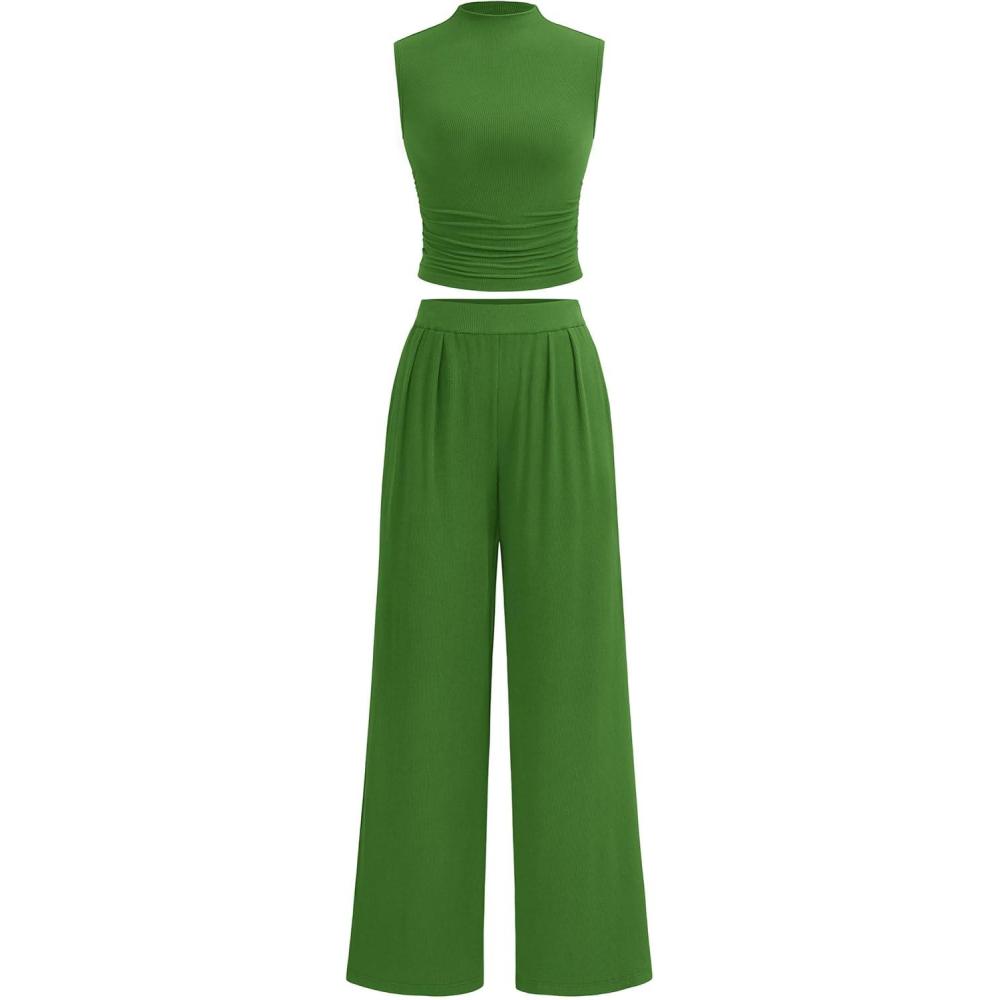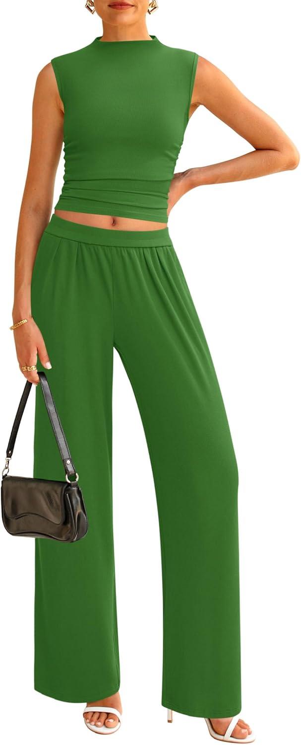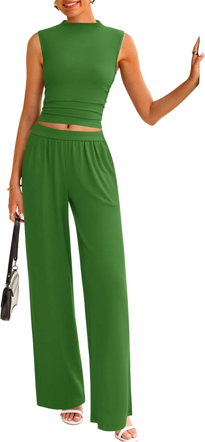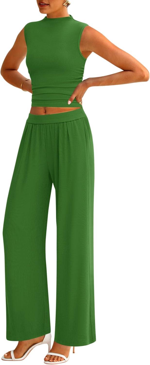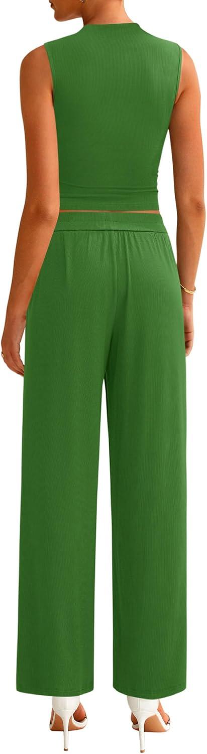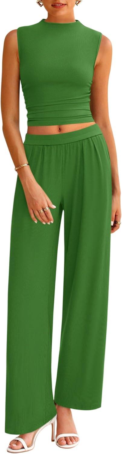 PRETTYGARDEN 2 Piece Sets for Women Summer 2025 Airport Travel Outfits Crop Tank Tops Wide Leg Pants Matching Lounge Sets(Green)