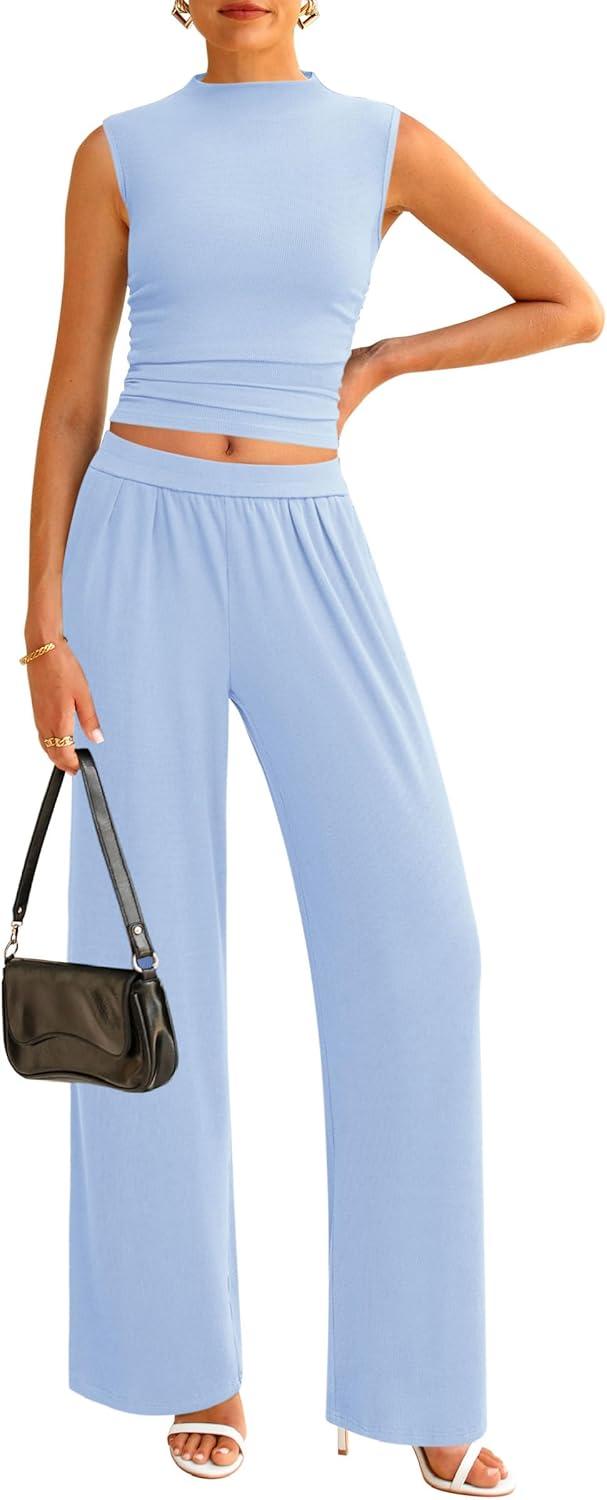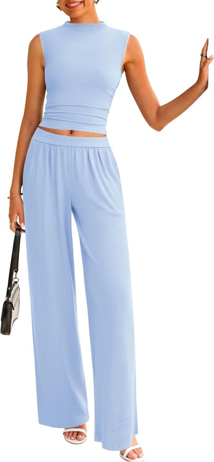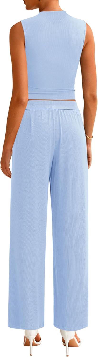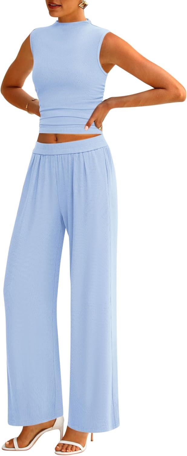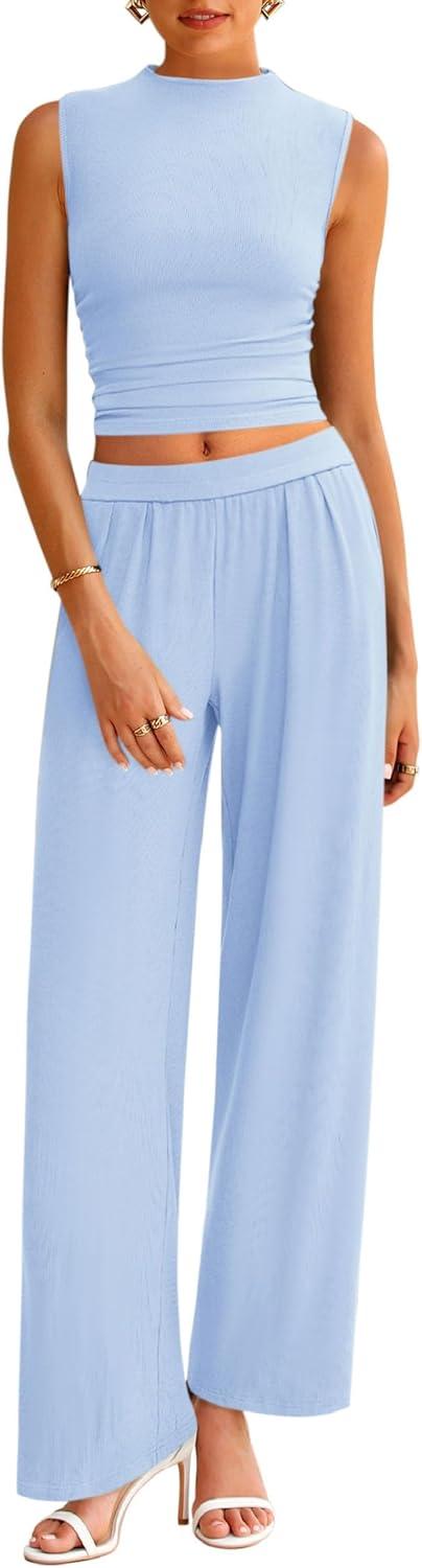 PRETTYGARDEN 2 Piece Sets for Women Summer 2025 Airport Travel Outfits Crop Tank Tops Wide Leg Pants Matching Lounge Sets(Light Blue)
