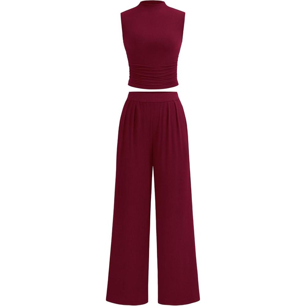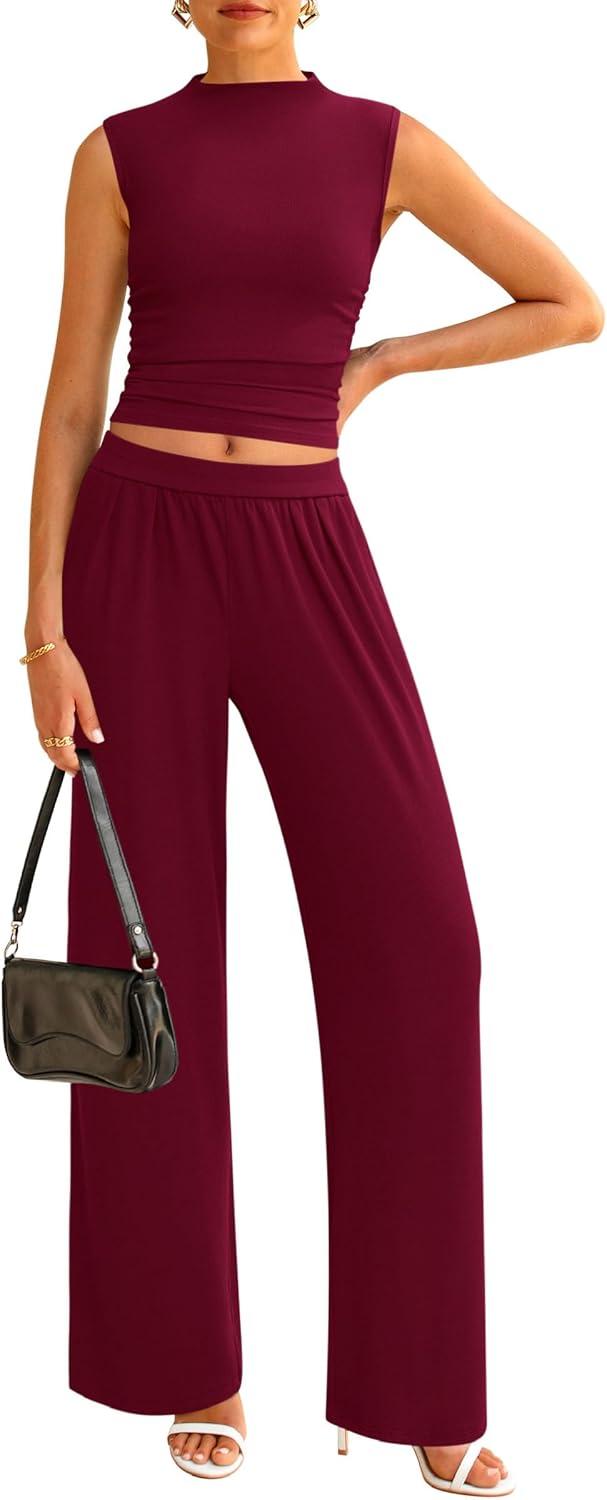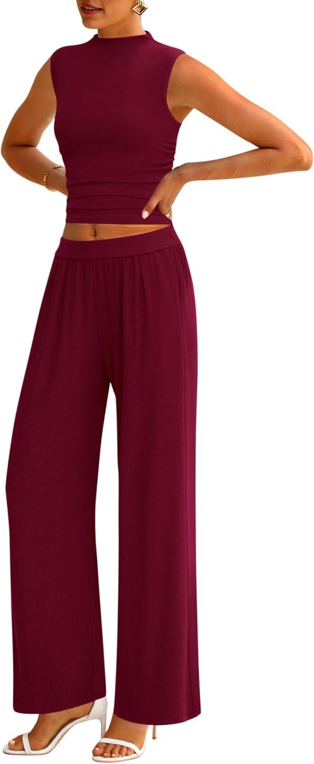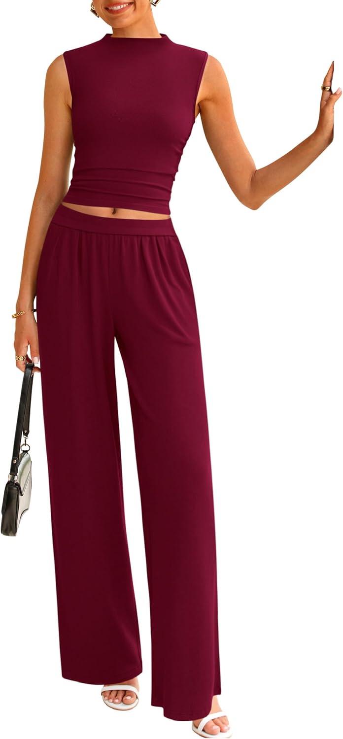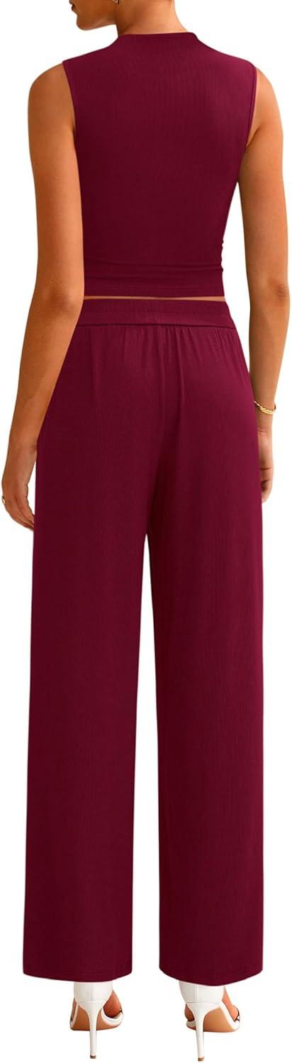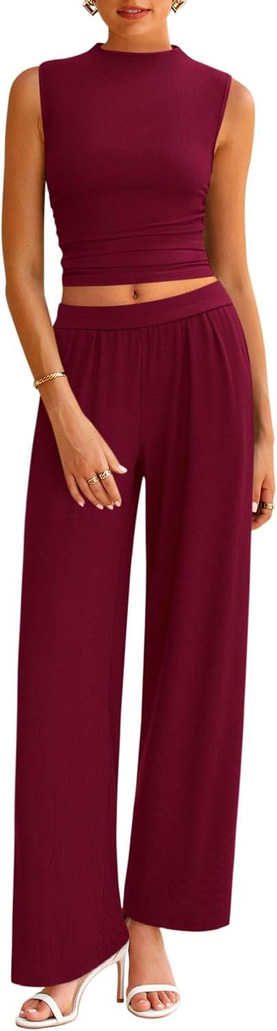 PRETTYGARDEN 2 Piece Sets for Women Summer 2025 Airport Travel Outfits Crop Tank Tops Wide Leg Pants Matching Lounge Sets(Wine Red)