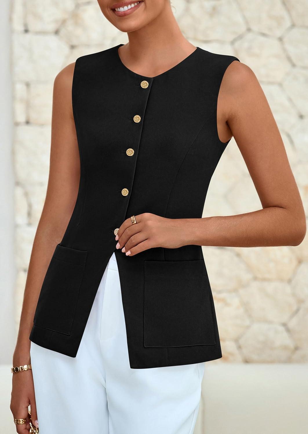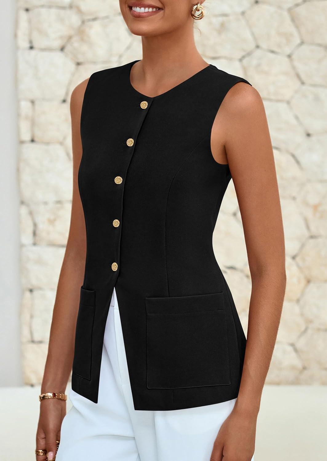 PRETTYGARDEN Blazer Vest Tops for Women Sleeveless Button Down Business Casual Outfits Work Suit Vests Waistcoat(Black)
