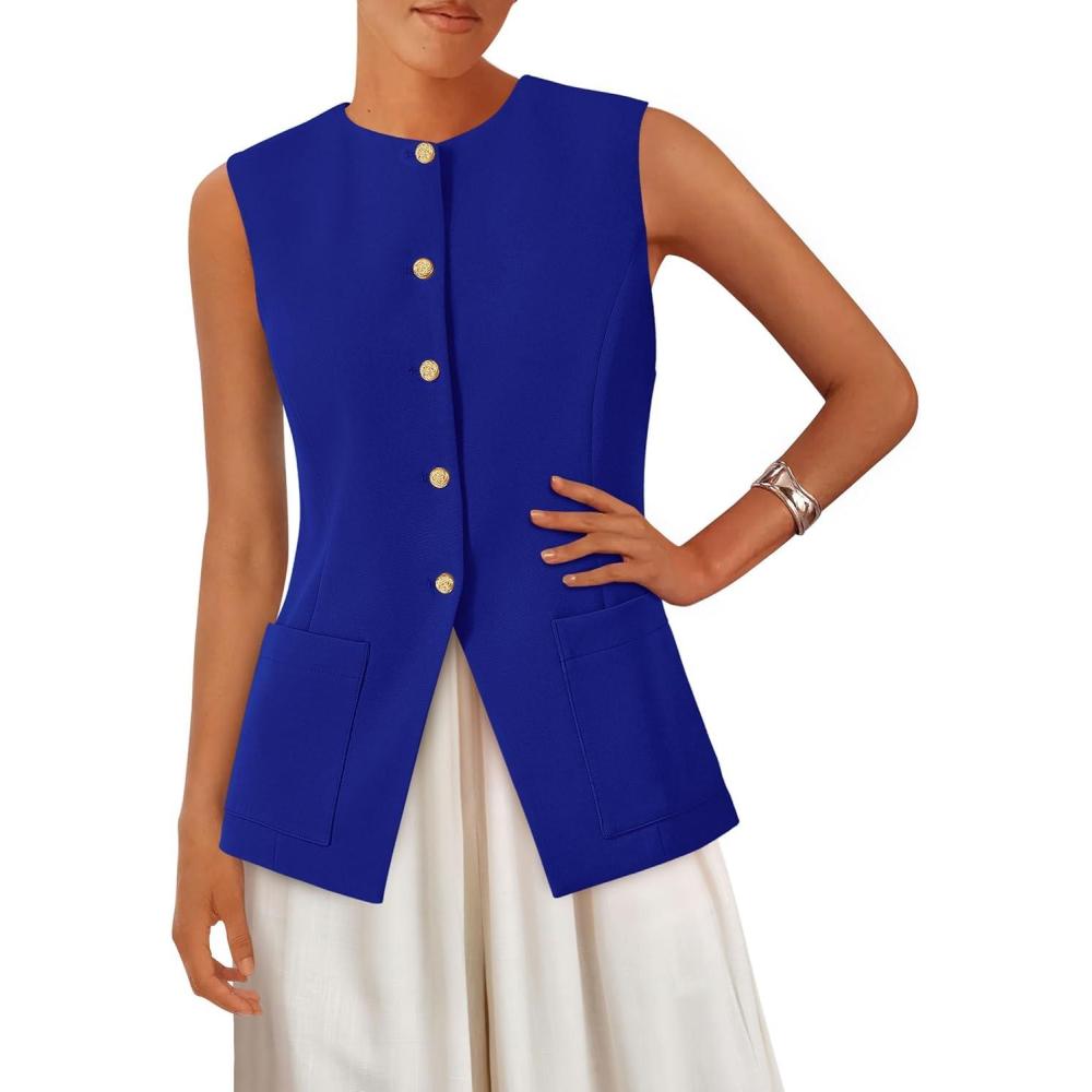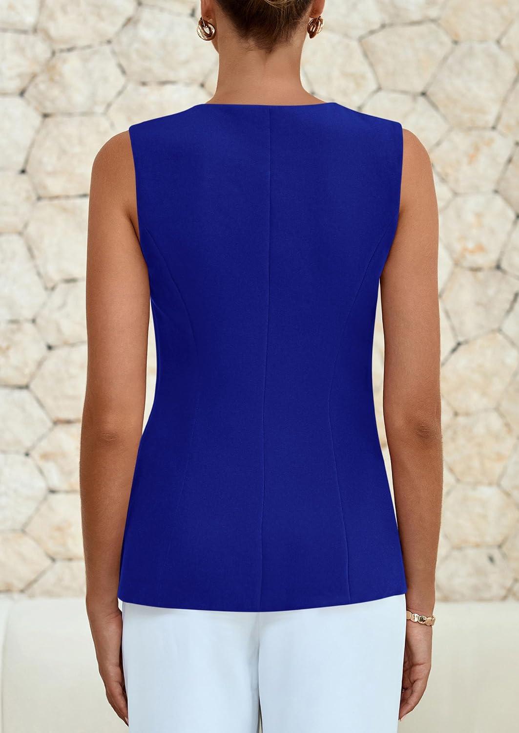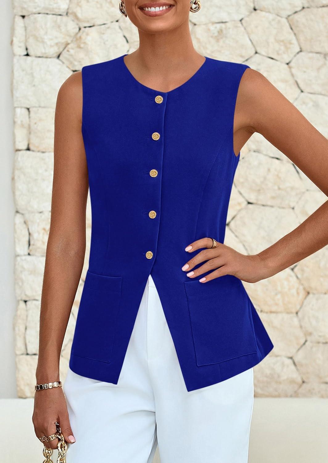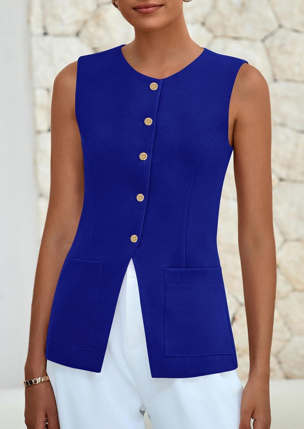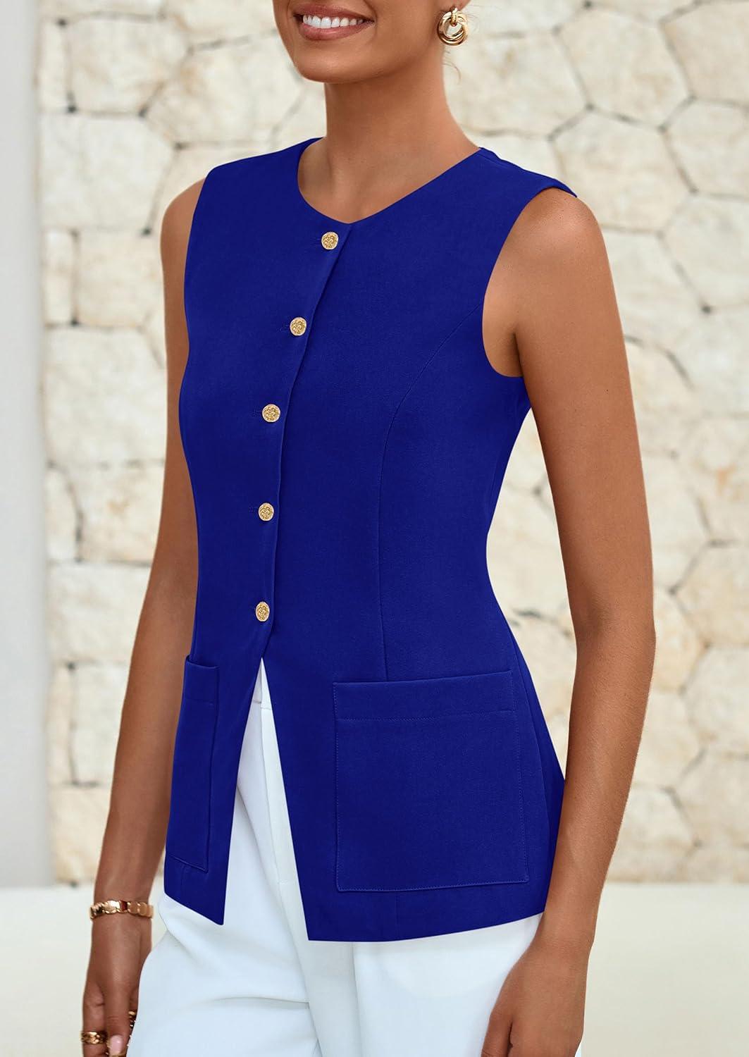 PRETTYGARDEN Blazer Vest Tops for Women Sleeveless Button Down Business Casual Outfits Work Suit Vests Waistcoat(Blue)