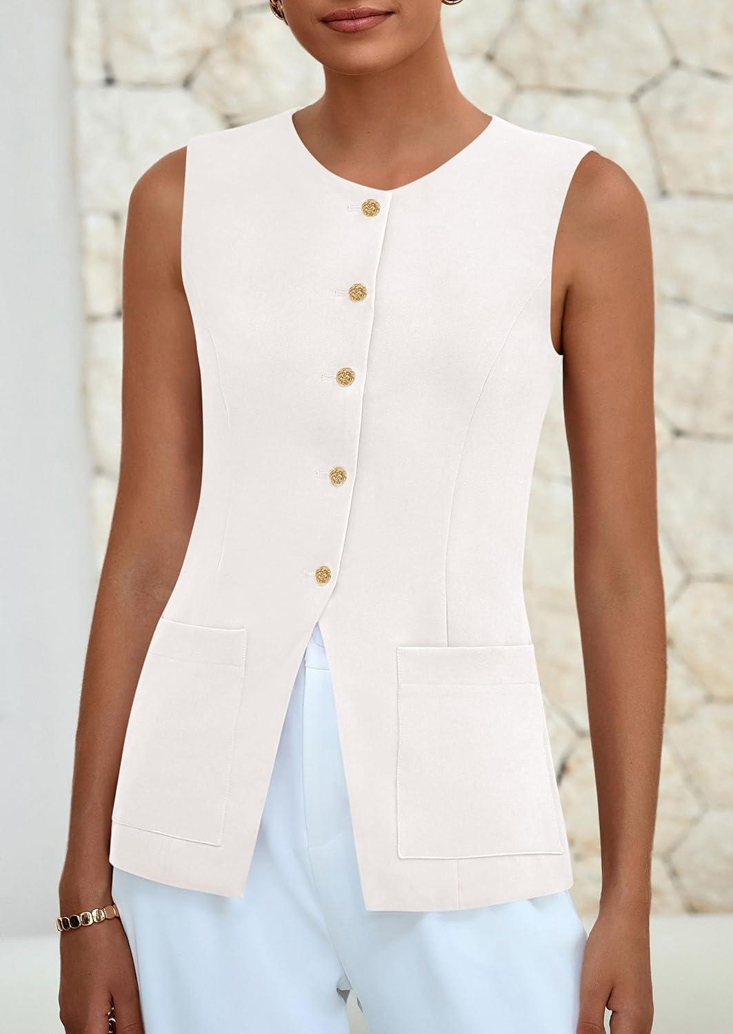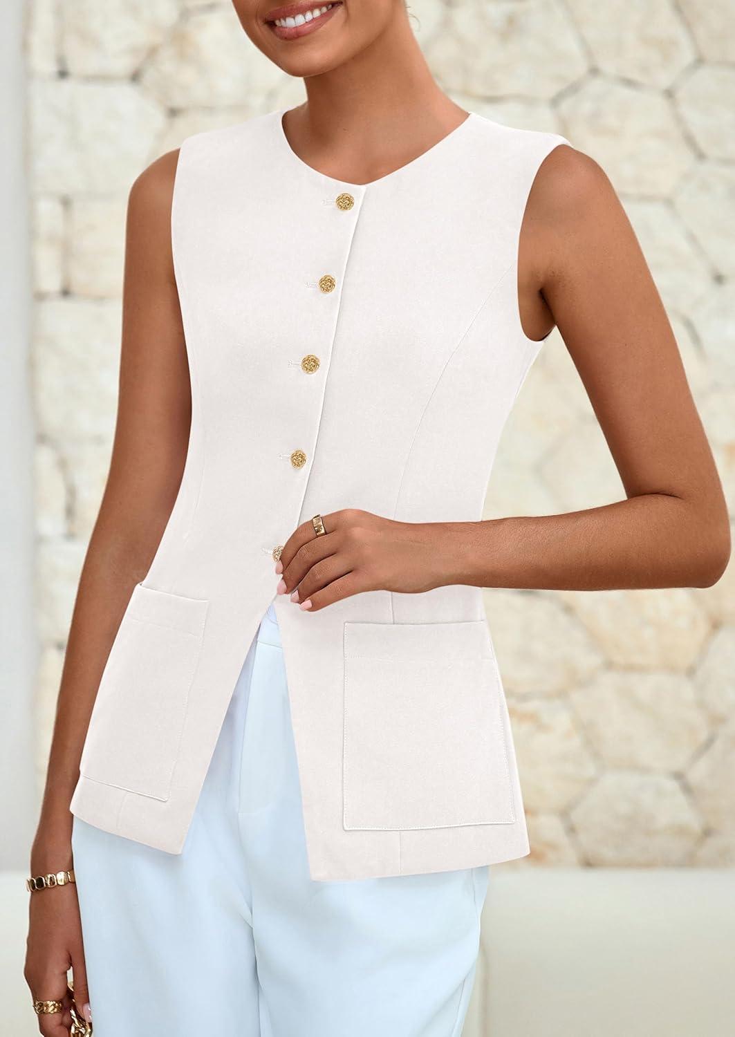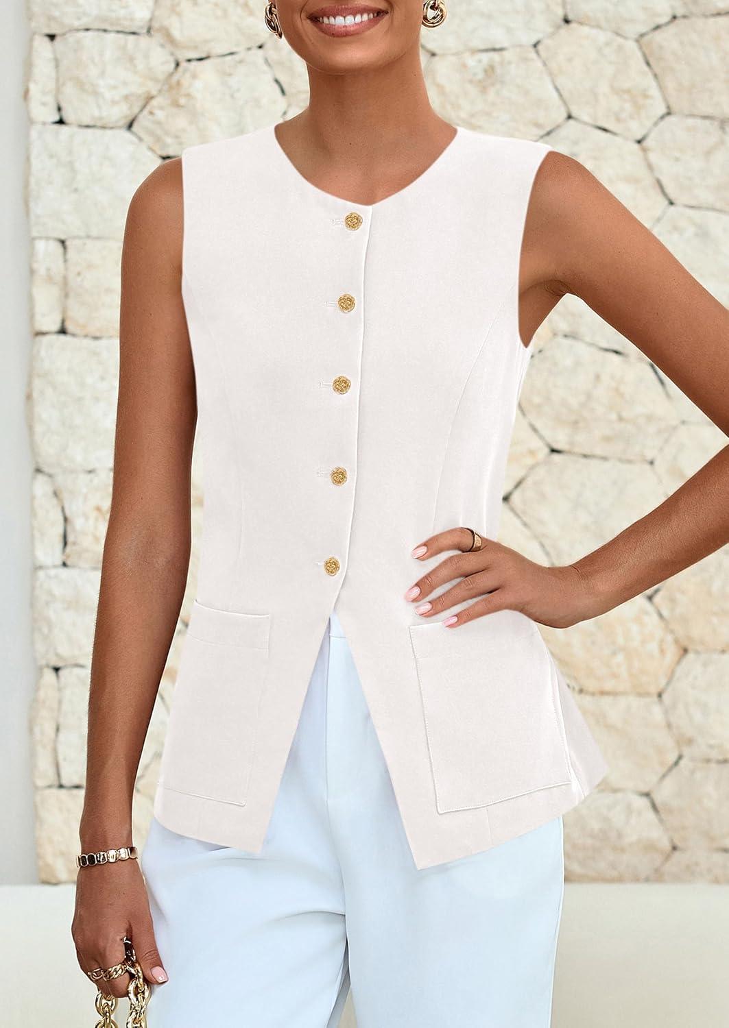 PRETTYGARDEN Blazer Vest Tops for Women Sleeveless Button Down Business Casual Outfits Work Suit Vests Waistcoat(White)