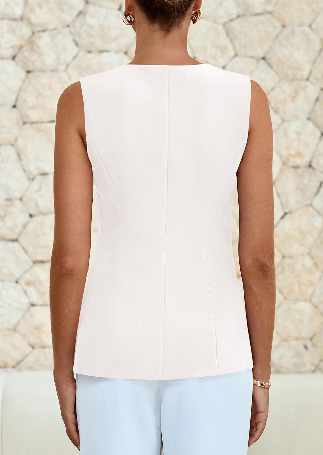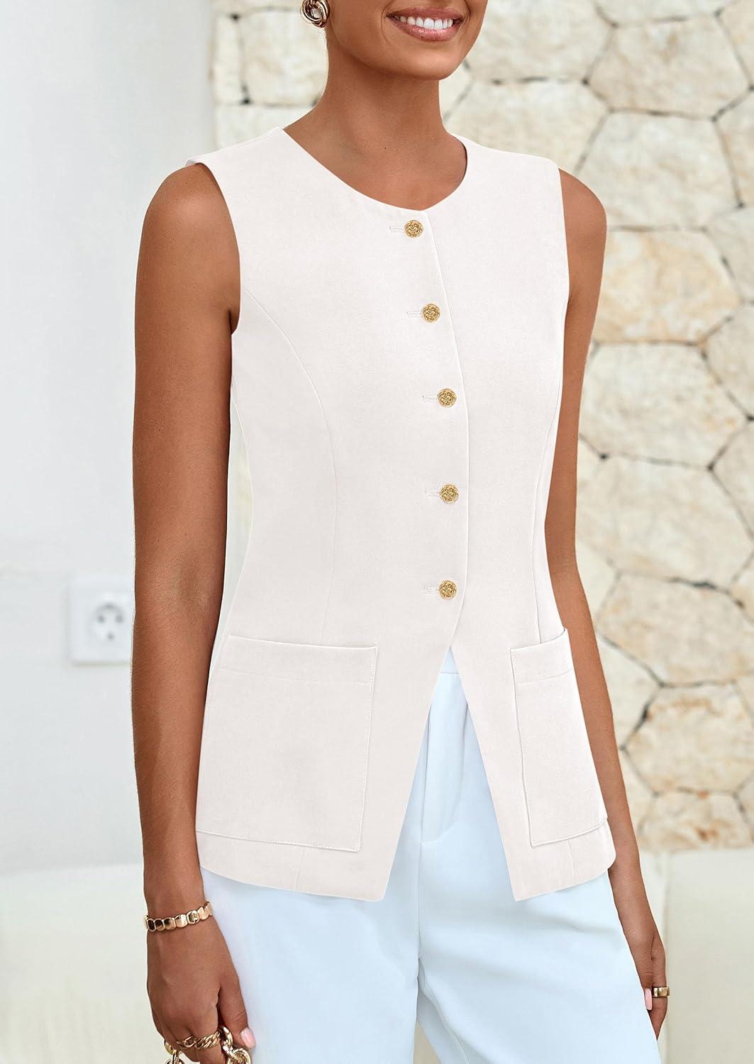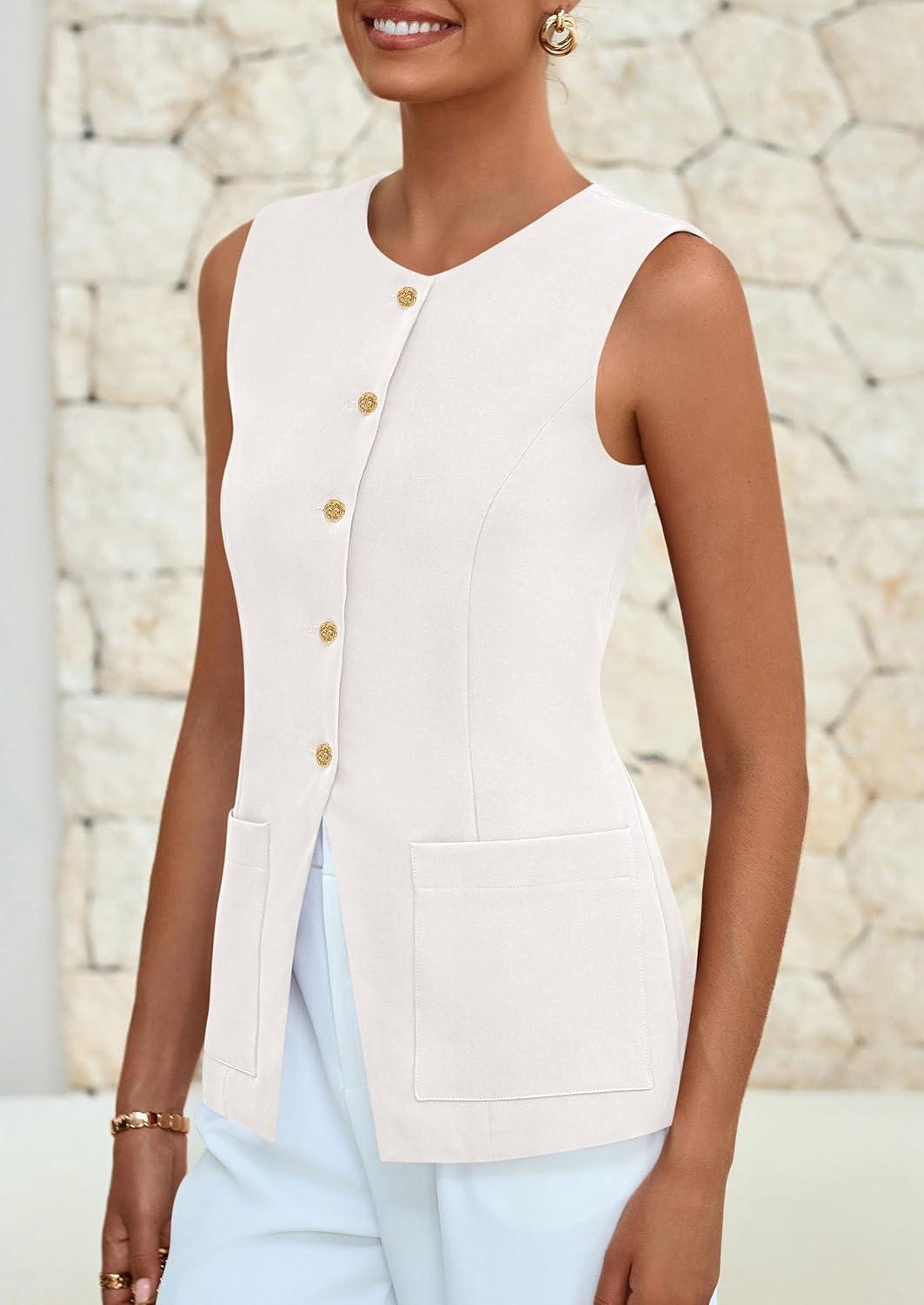 PRETTYGARDEN Blazer Vest Tops for Women Sleeveless Button Down Business Casual Outfits Work Suit Vests Waistcoat(White)
