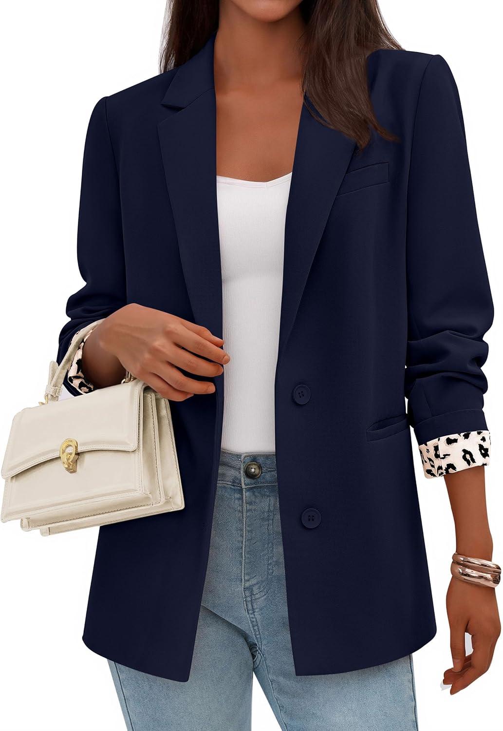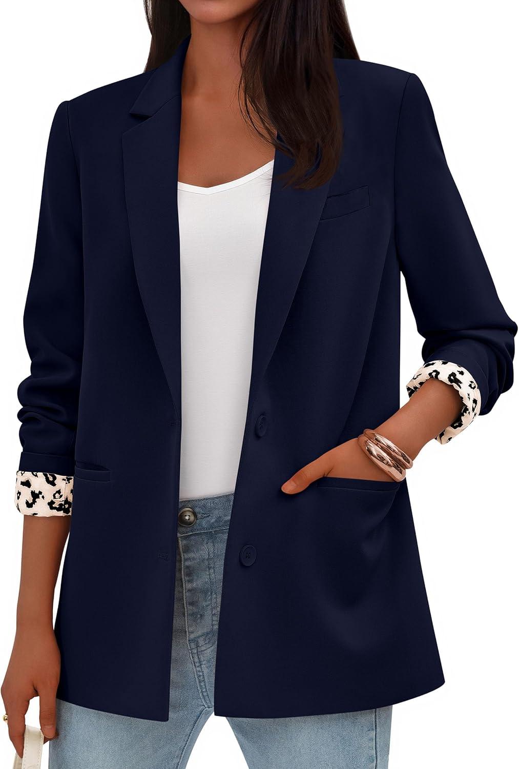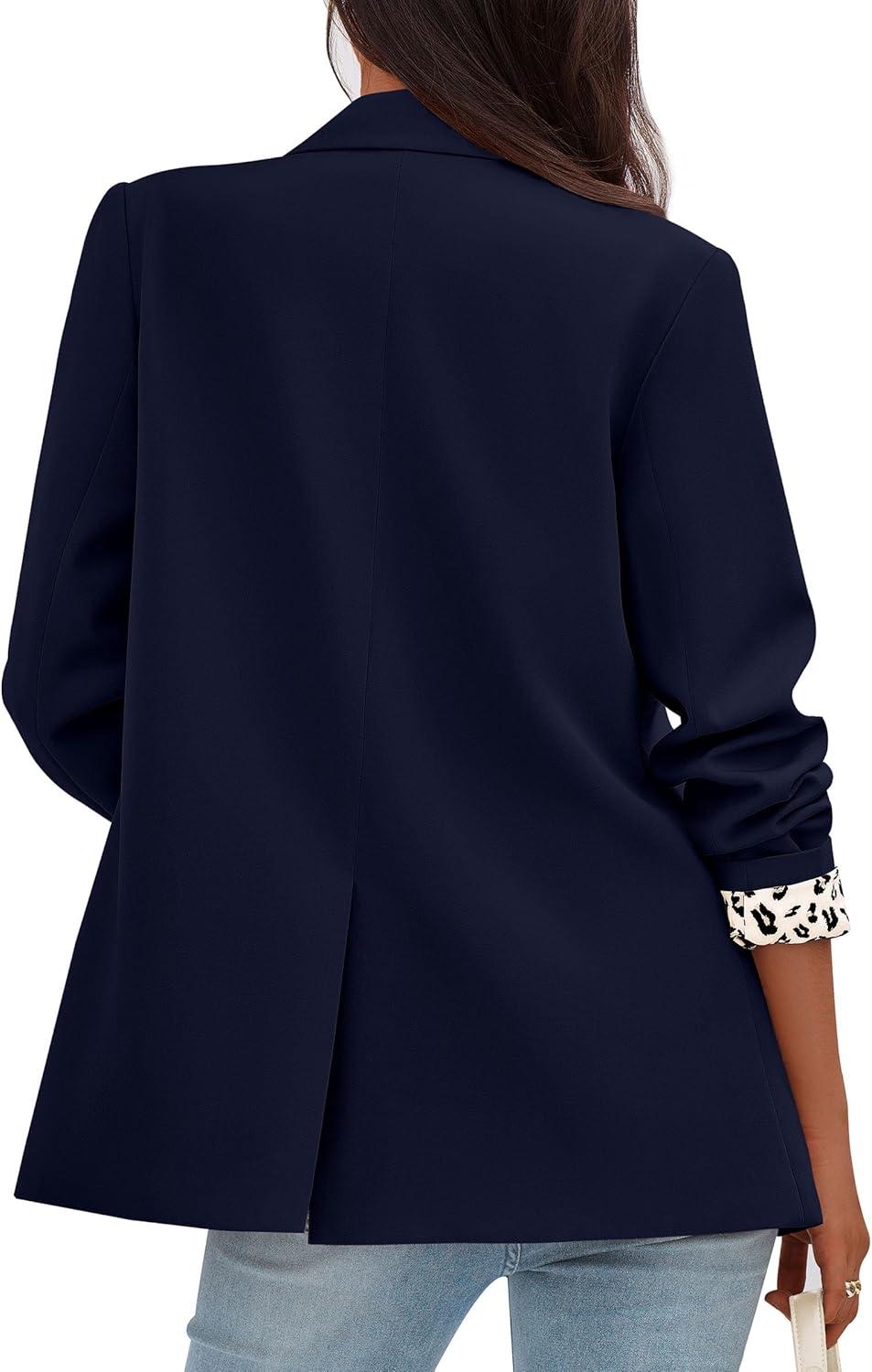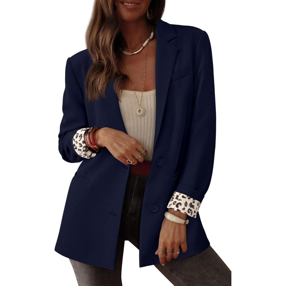 PRETTYGARDEN Blazers for Women 2025 Fall Work Office Suit Jackets Dressy Open Front Leopard Blazer Business Casual Outfits(Dark Blue)