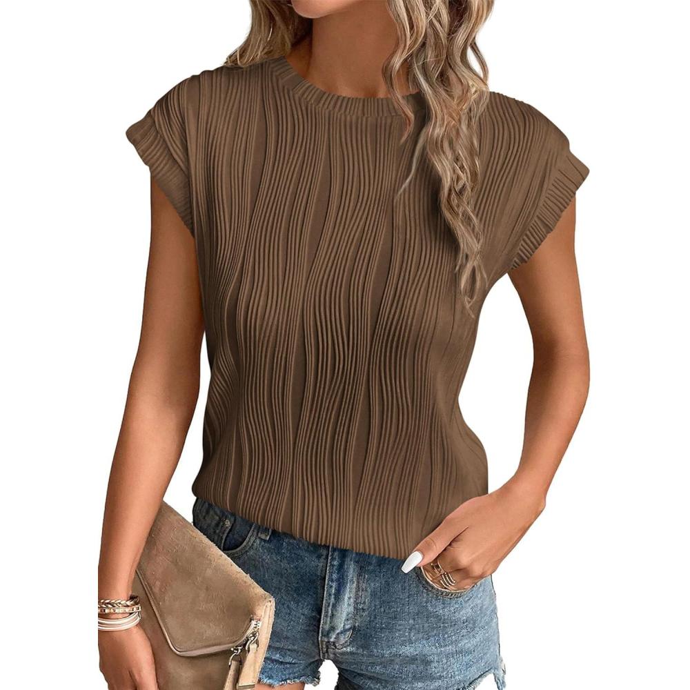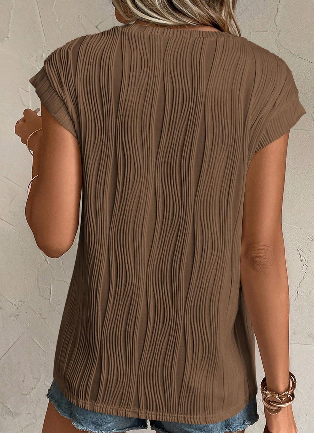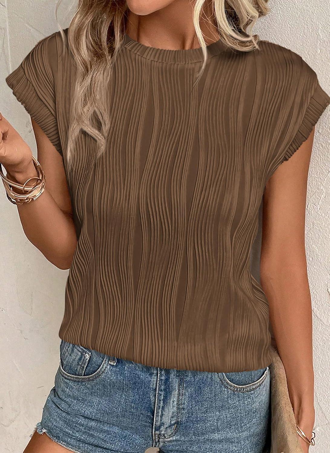 PRETTYGARDEN Blouses for Women Dressy Casual 2025 Spring Summer Business Office Tops Cap Sleeve Textured Cute Work Shirt(Coffee)