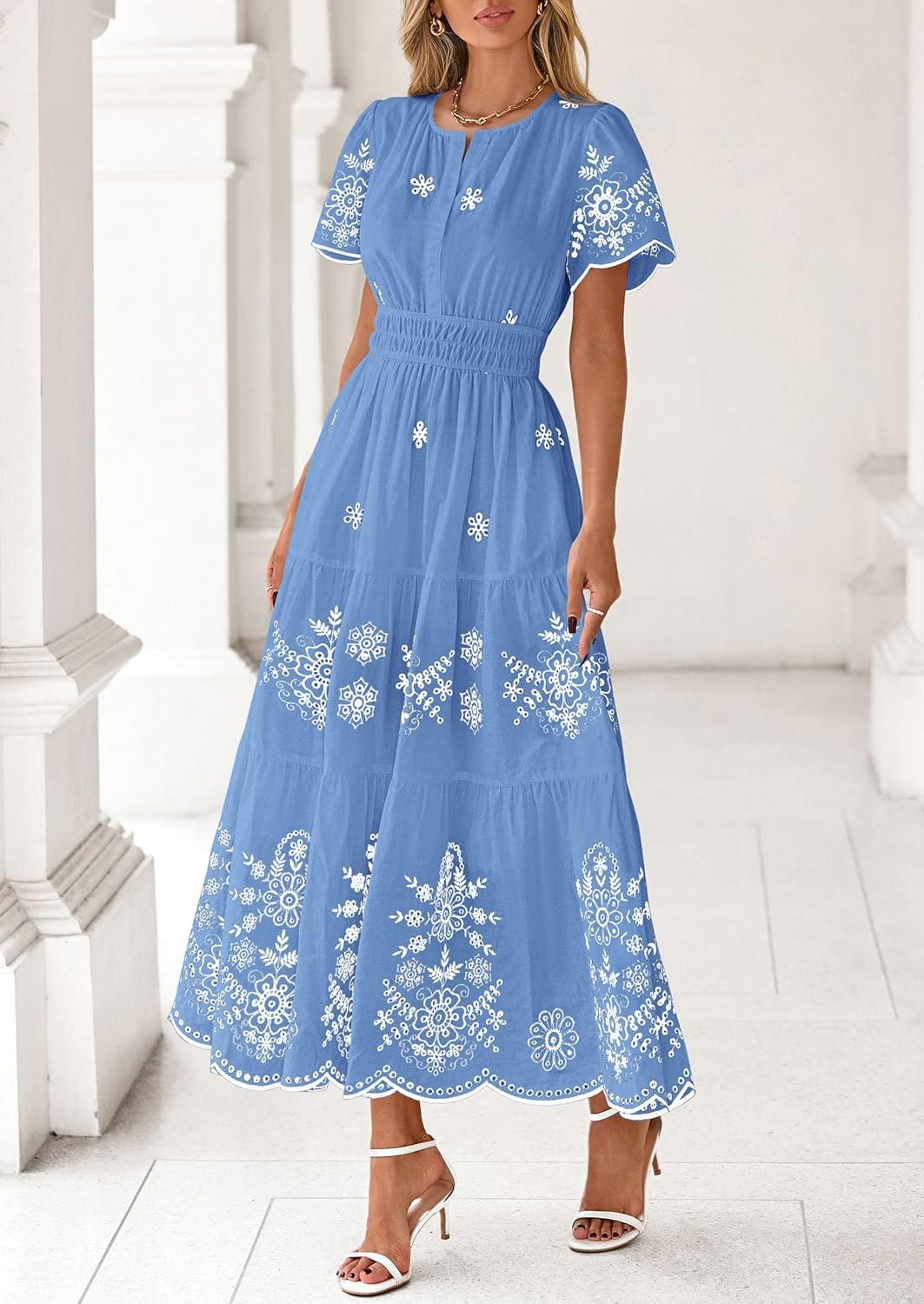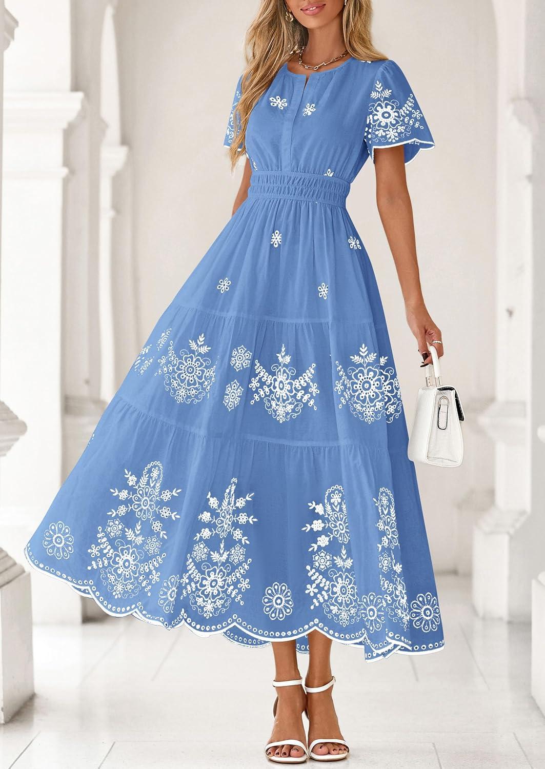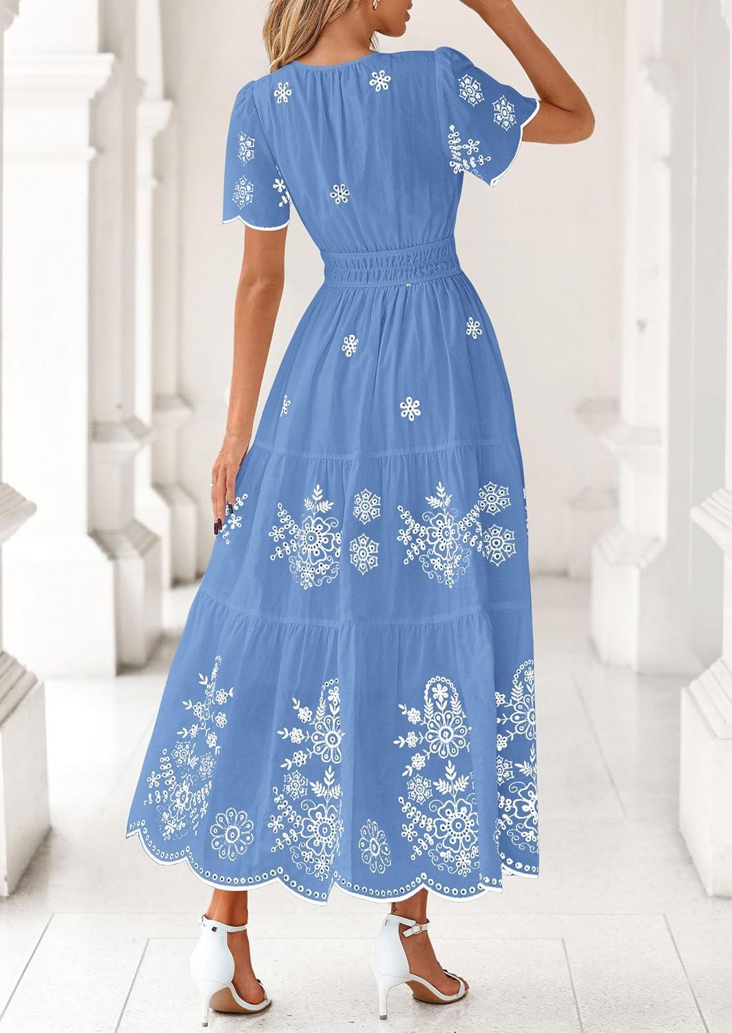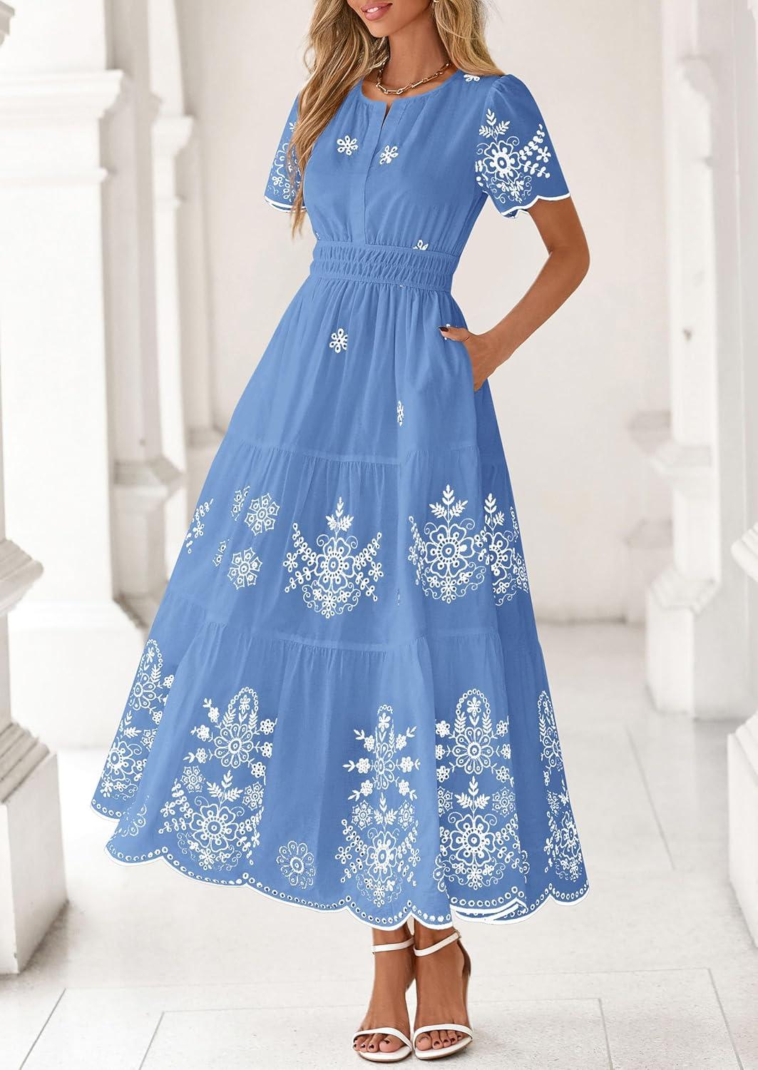 PRETTYGARDEN Boho Dresses for Women 2026 Summer Spring Casual Floral Short Sleeve V Neck Maxi Elastic Waist Dress Pockets(Light Blue White Flower)