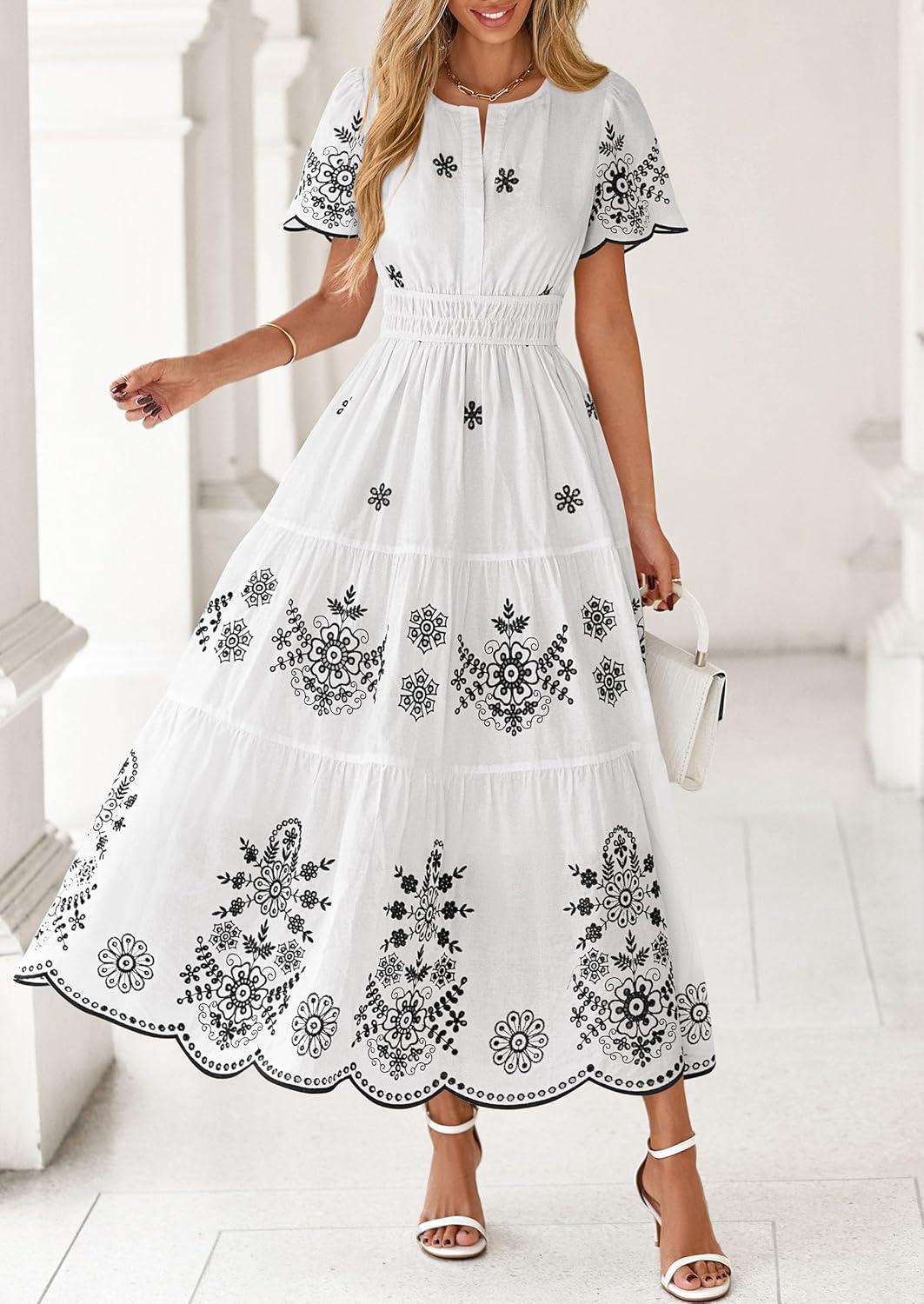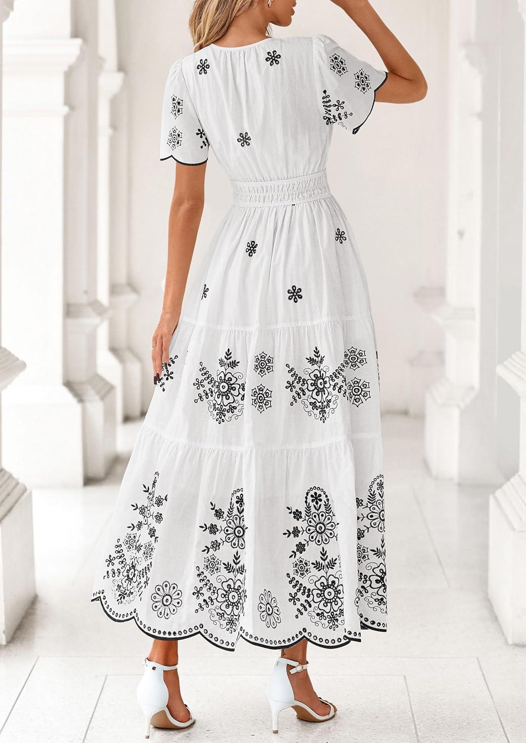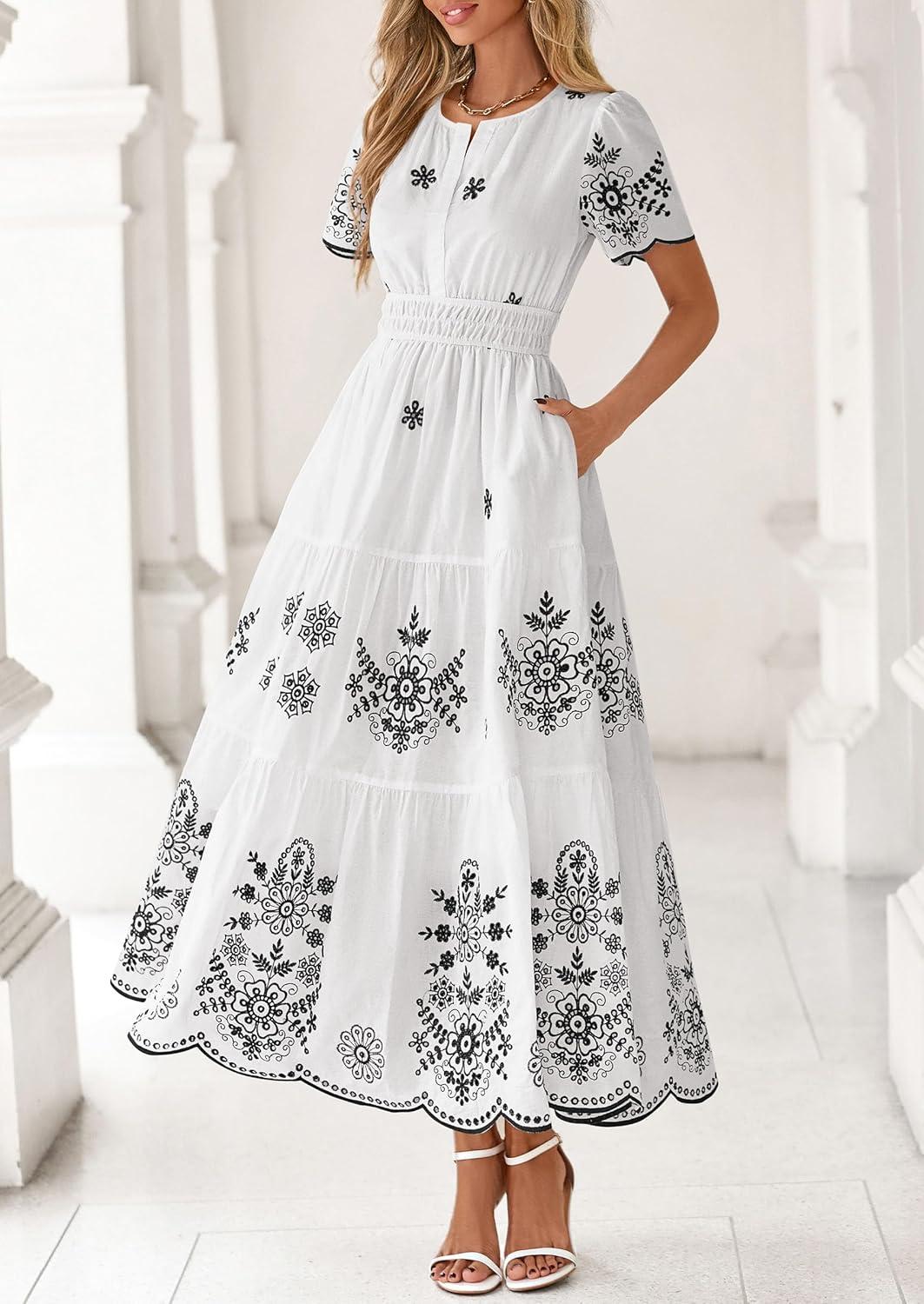 PRETTYGARDEN Boho Dresses for Women 2026 Summer Spring Casual Floral Short Sleeve V Neck Maxi Elastic Waist Dress Pockets(White Black Flower)