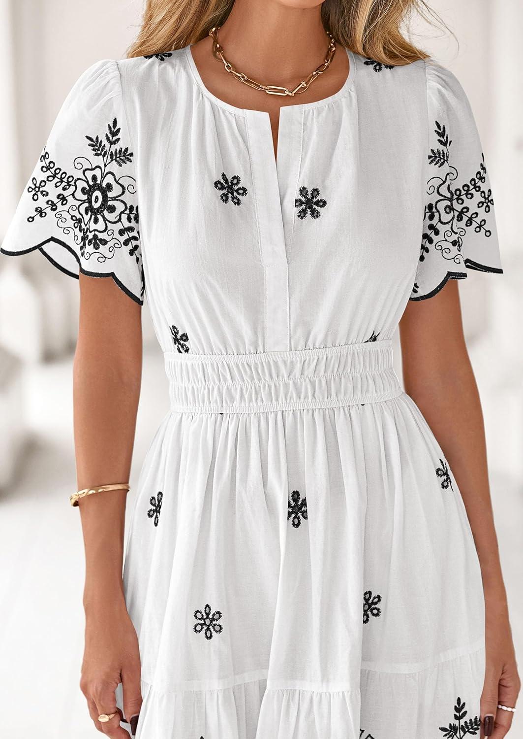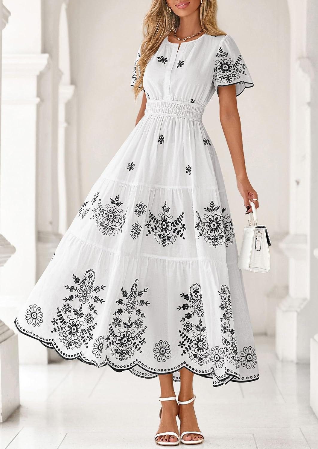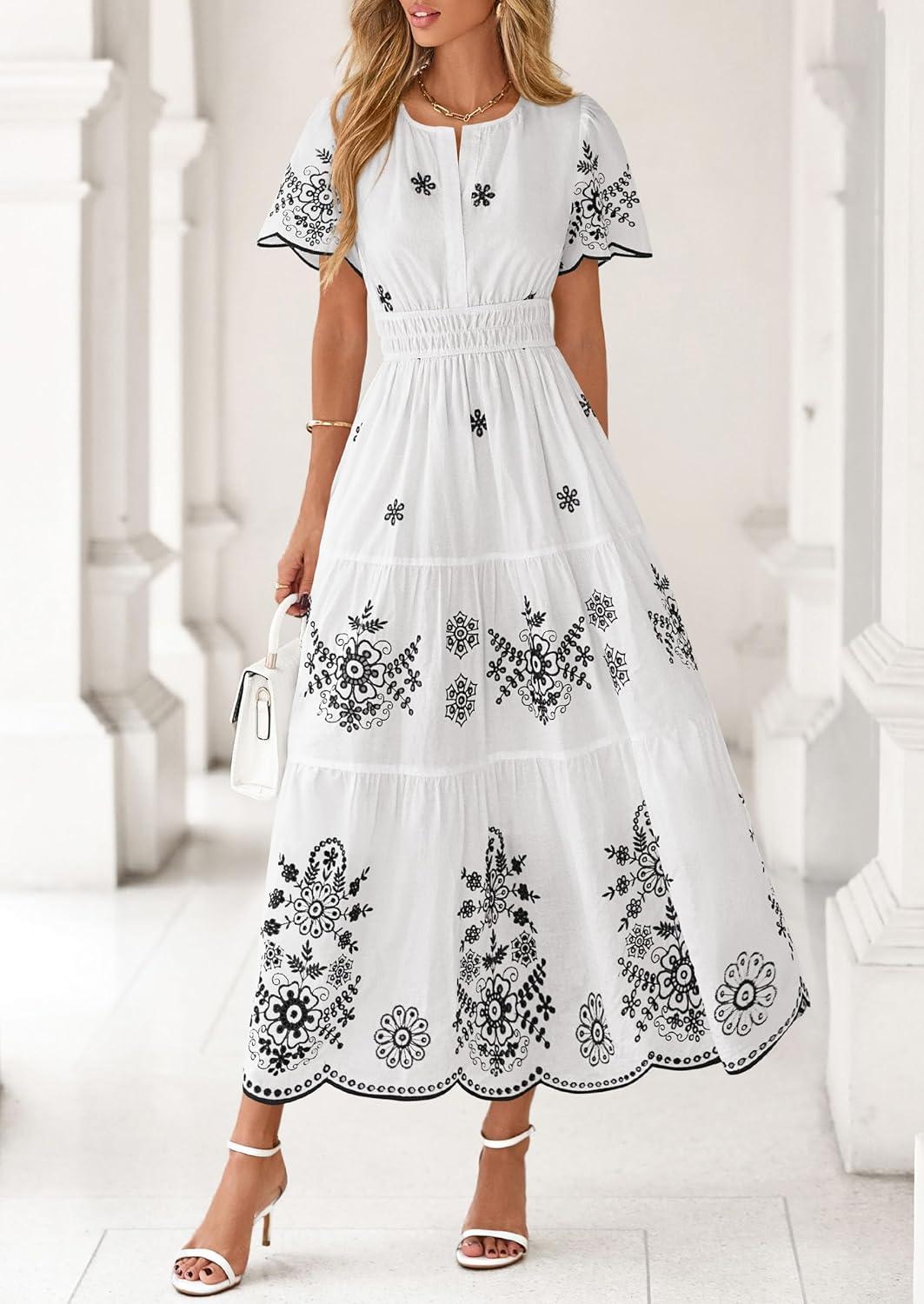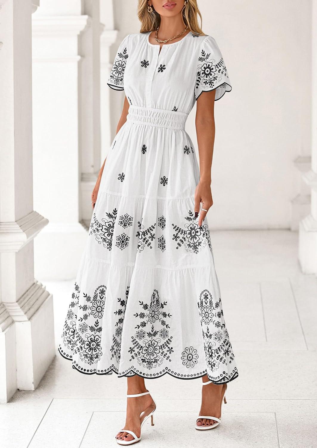PRETTYGARDEN Boho Dresses for Women 2026 Summer Spring Casual Floral Short Sleeve V Neck Maxi Elastic Waist Dress Pockets(White Black Flower)