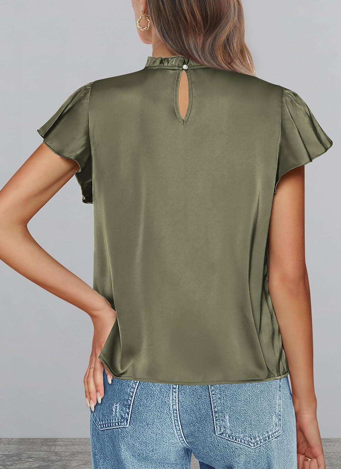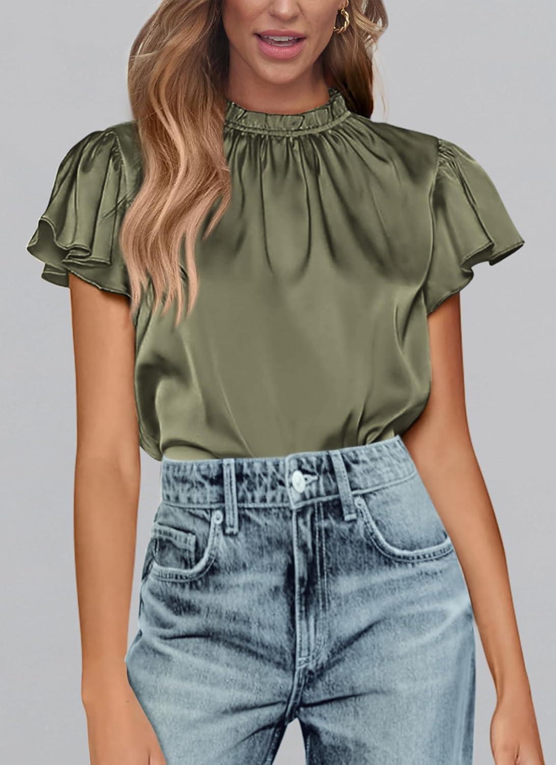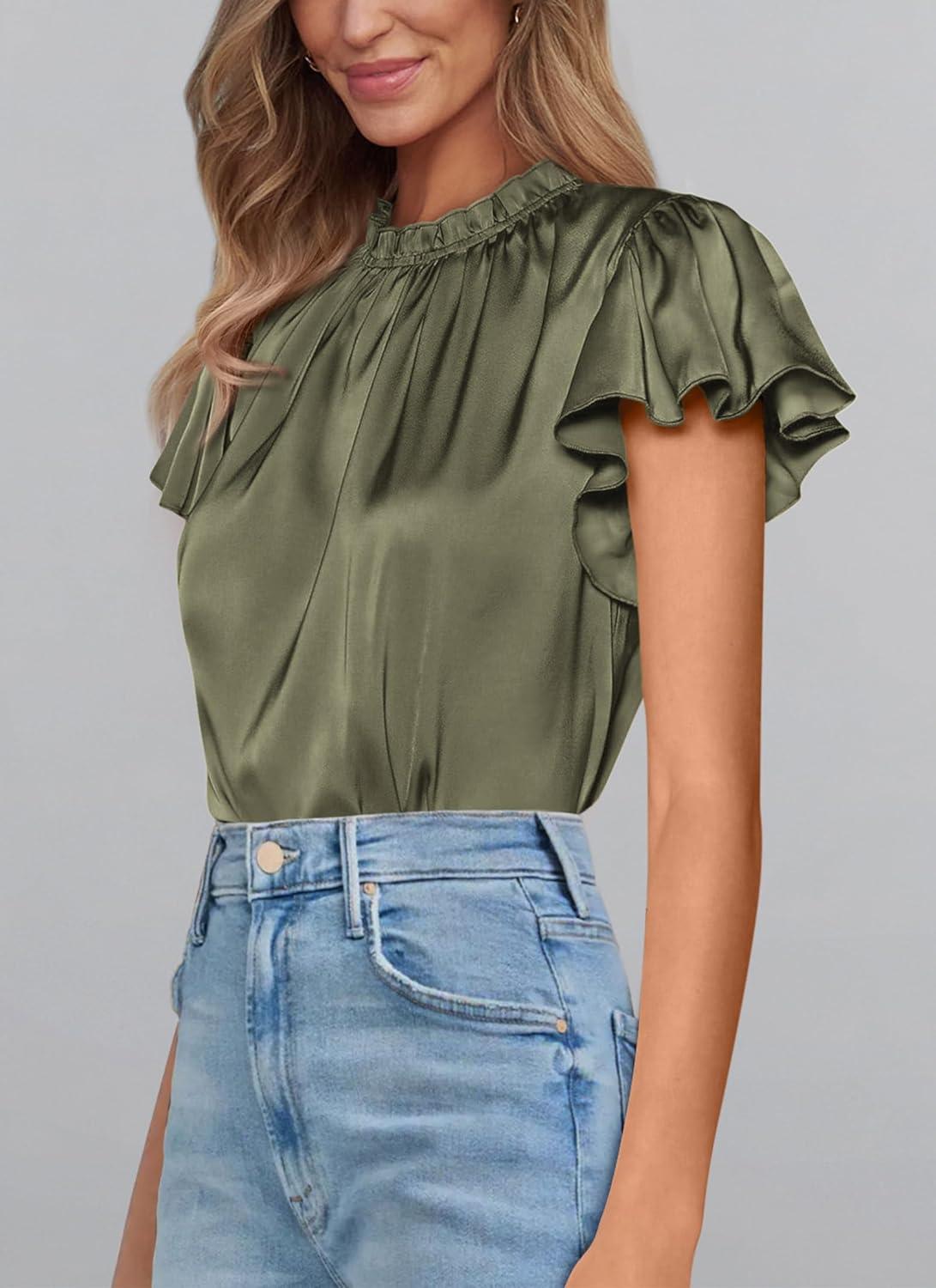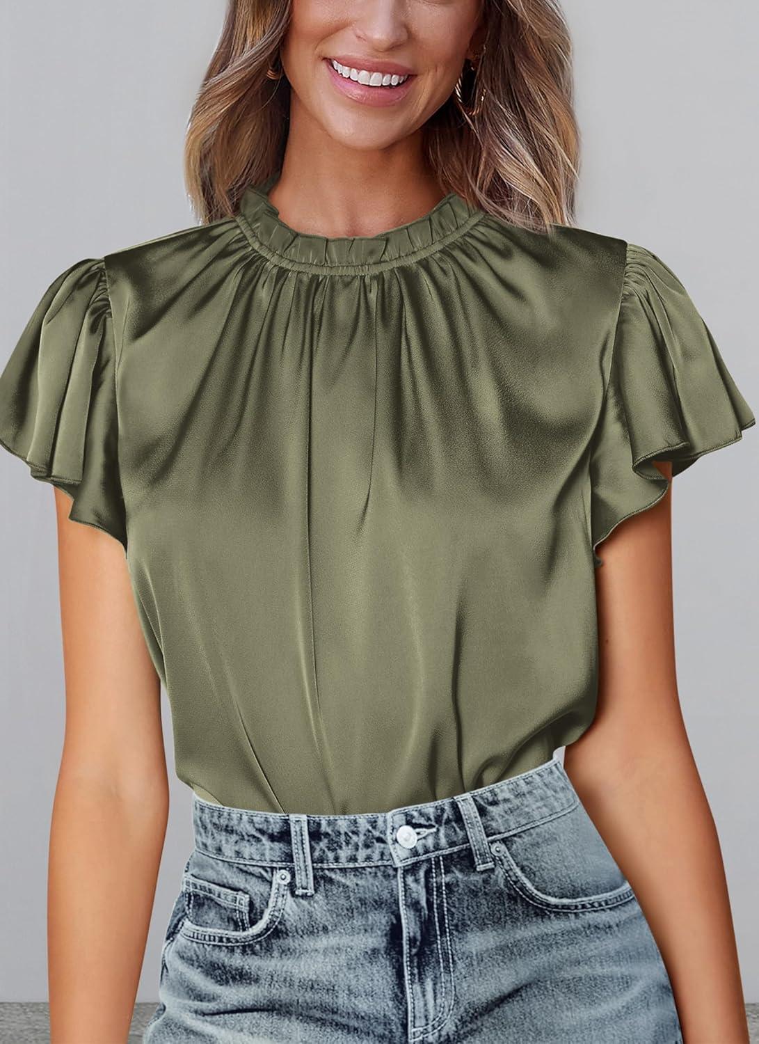 PRETTYGARDEN Business Casual Tops for Women Blouses Dressy 2025 Summer Short Sleeve Ruffle Satin Work Office Attire(Army Green)