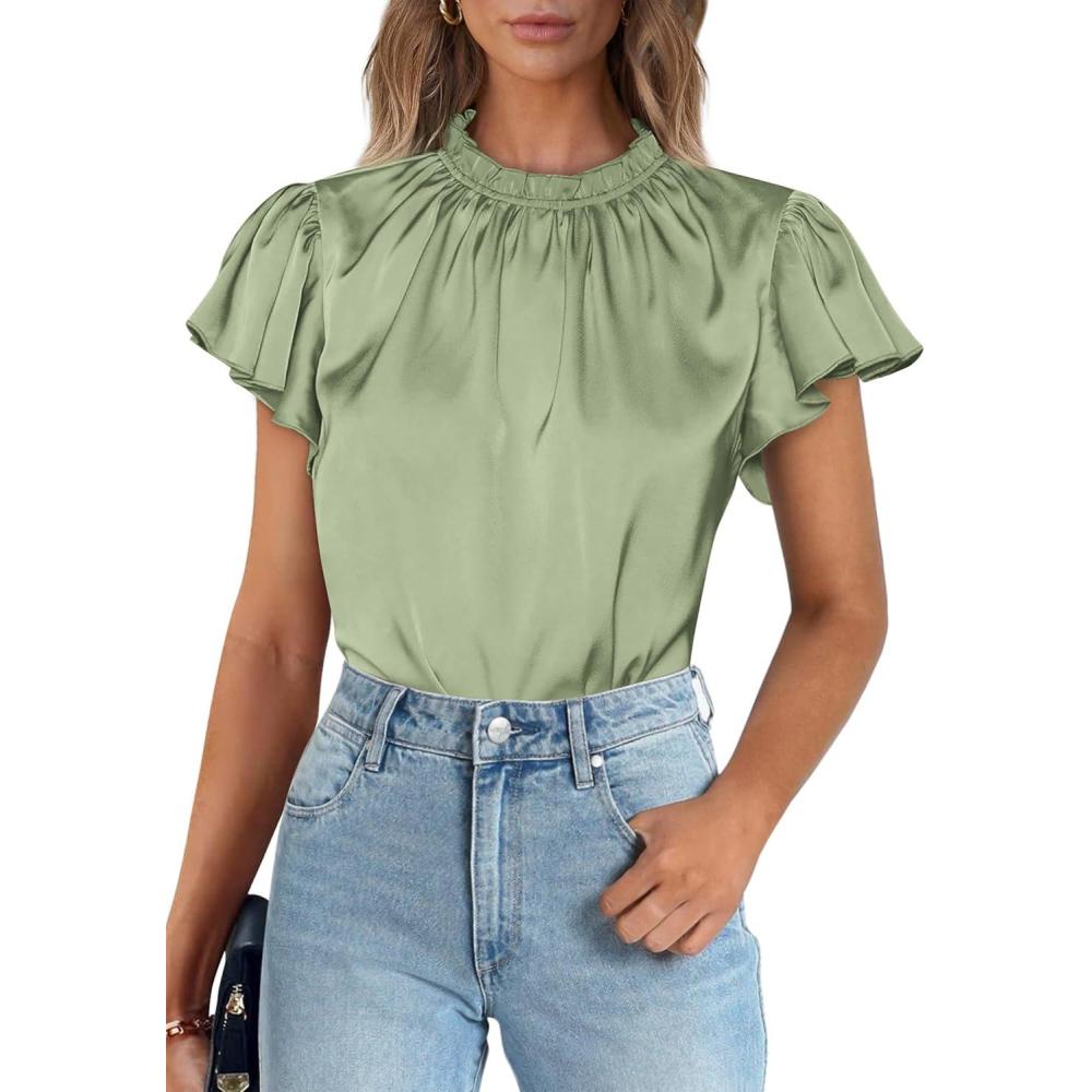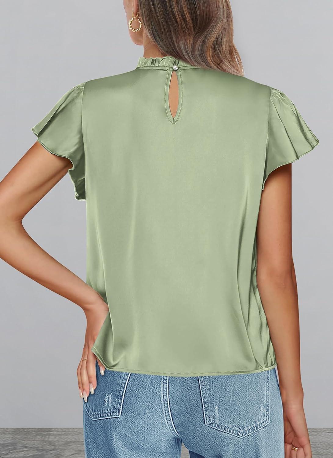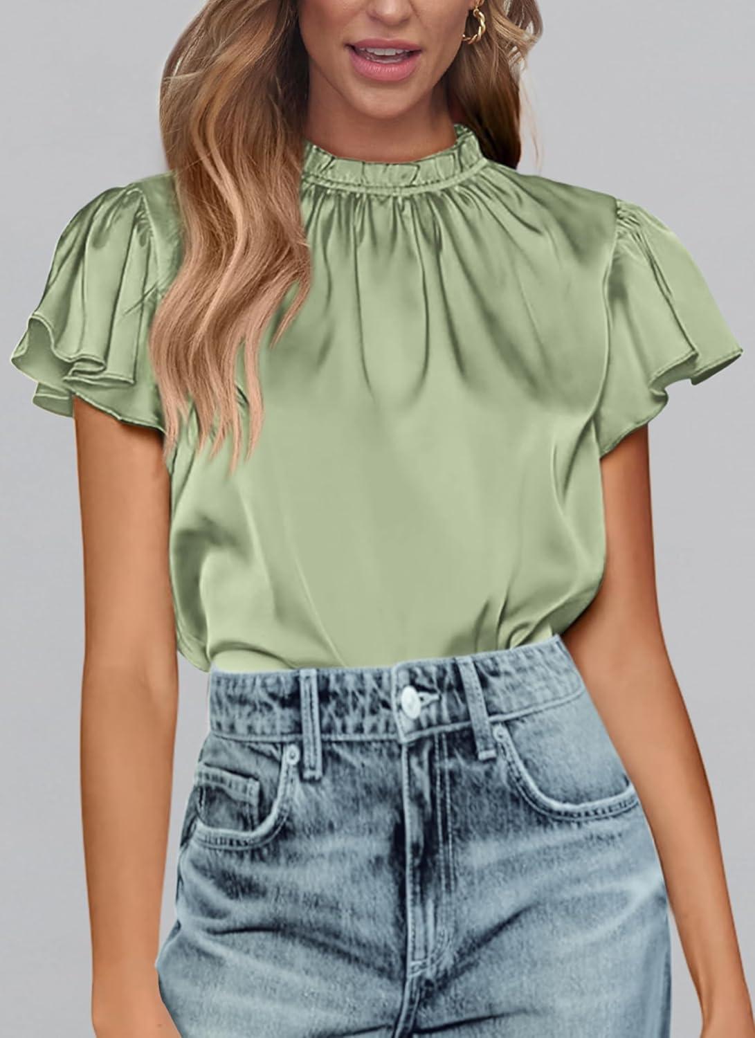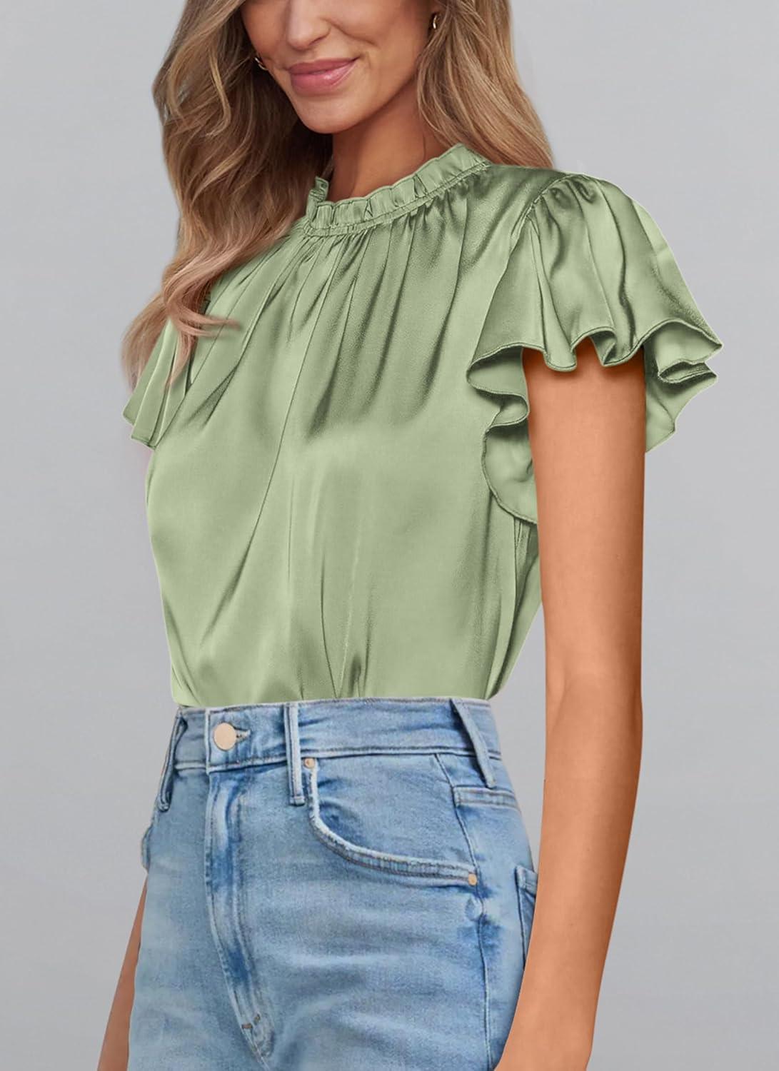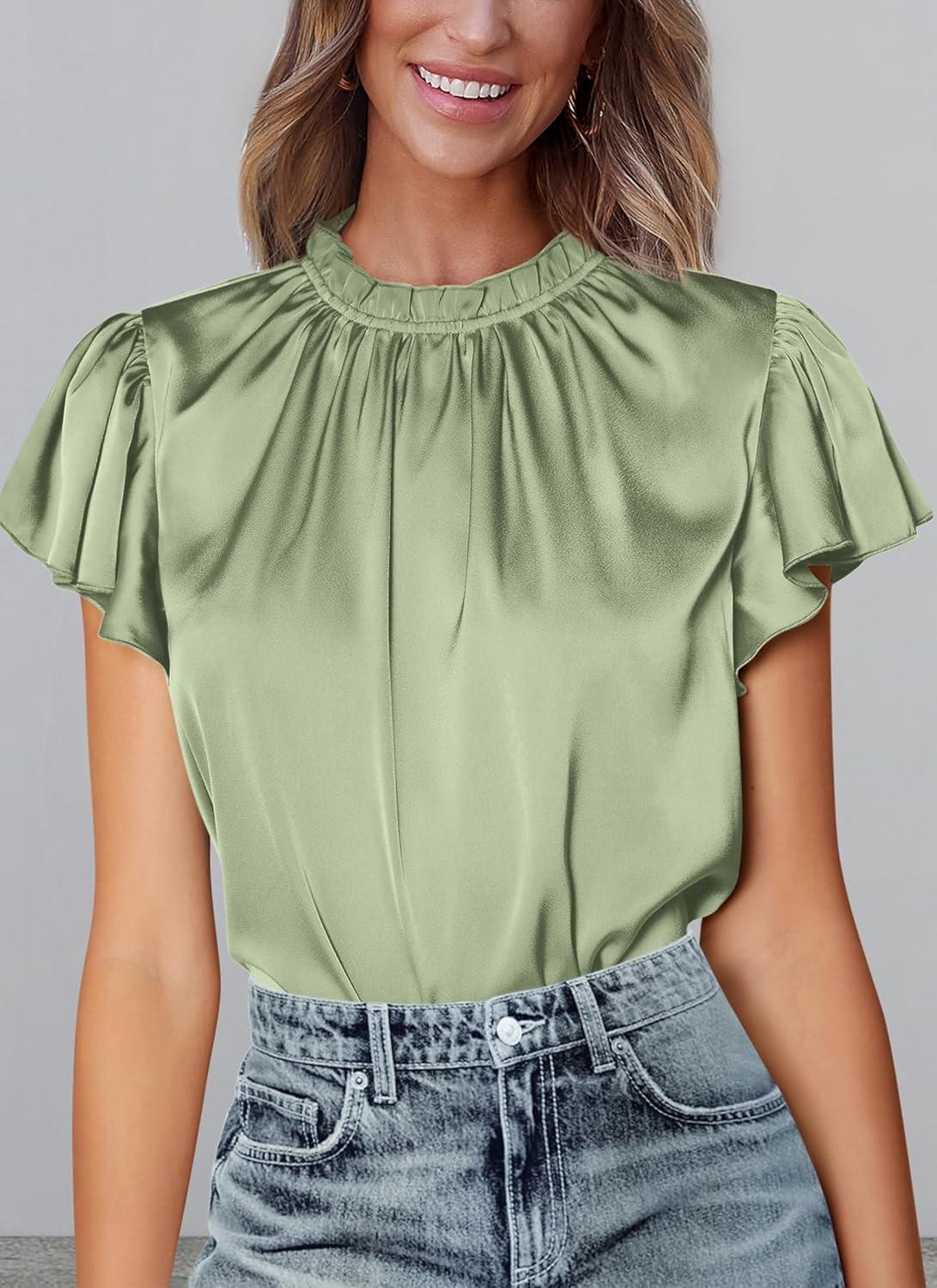 PRETTYGARDEN Business Casual Tops for Women Blouses Dressy 2025 Summer Short Sleeve Ruffle Satin Work Office Attire(Mint Green)