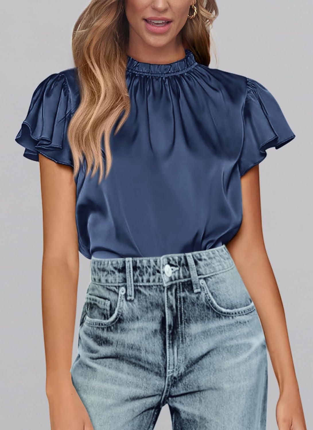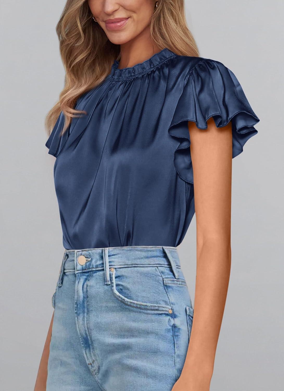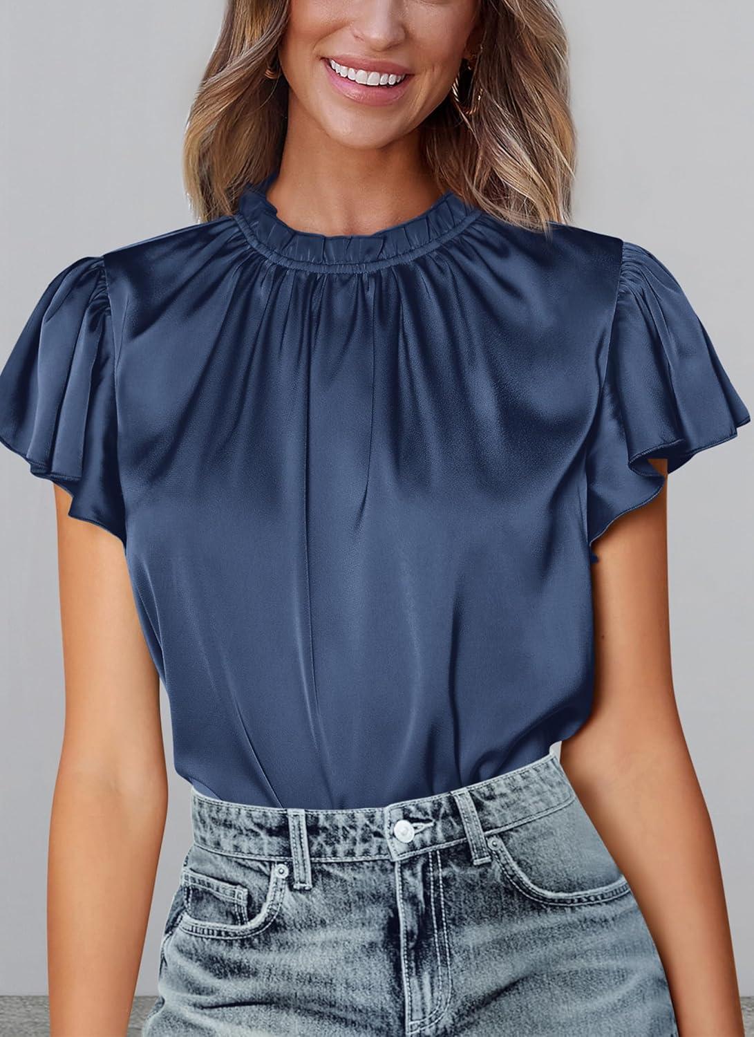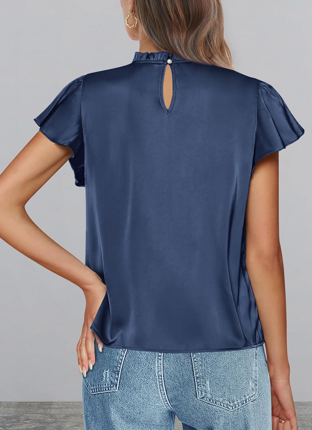 PRETTYGARDEN Business Casual Tops for Women Blouses Dressy 2025 Summer Short Sleeve Ruffle Satin Work Office Attire(Navy)