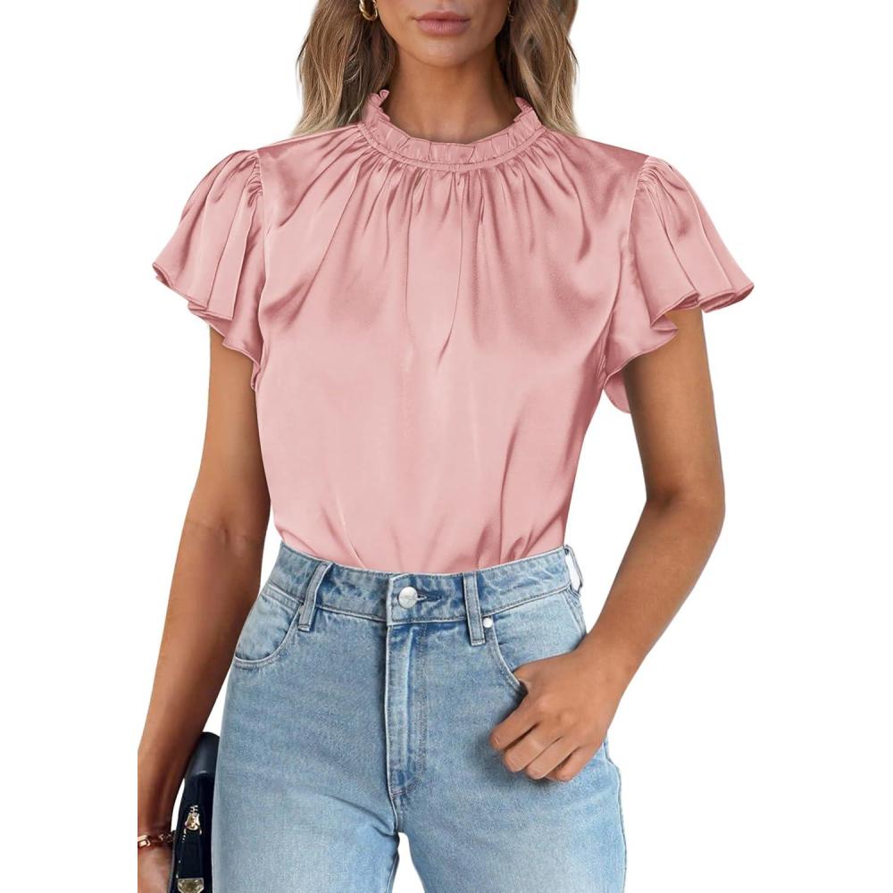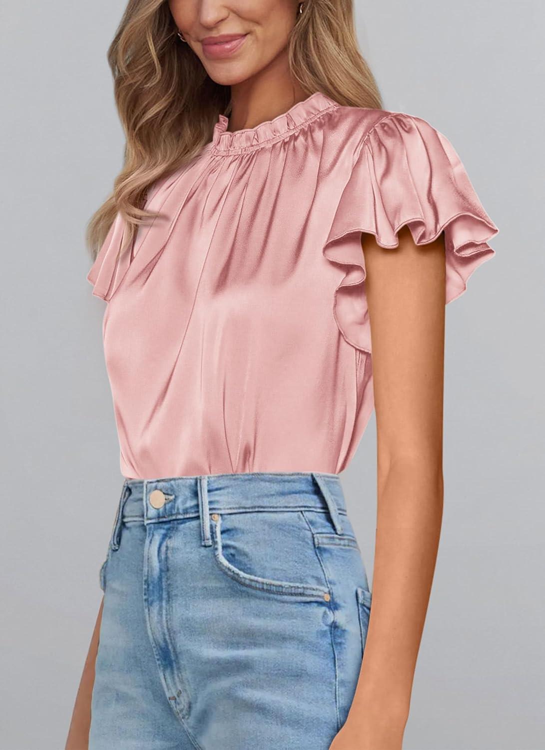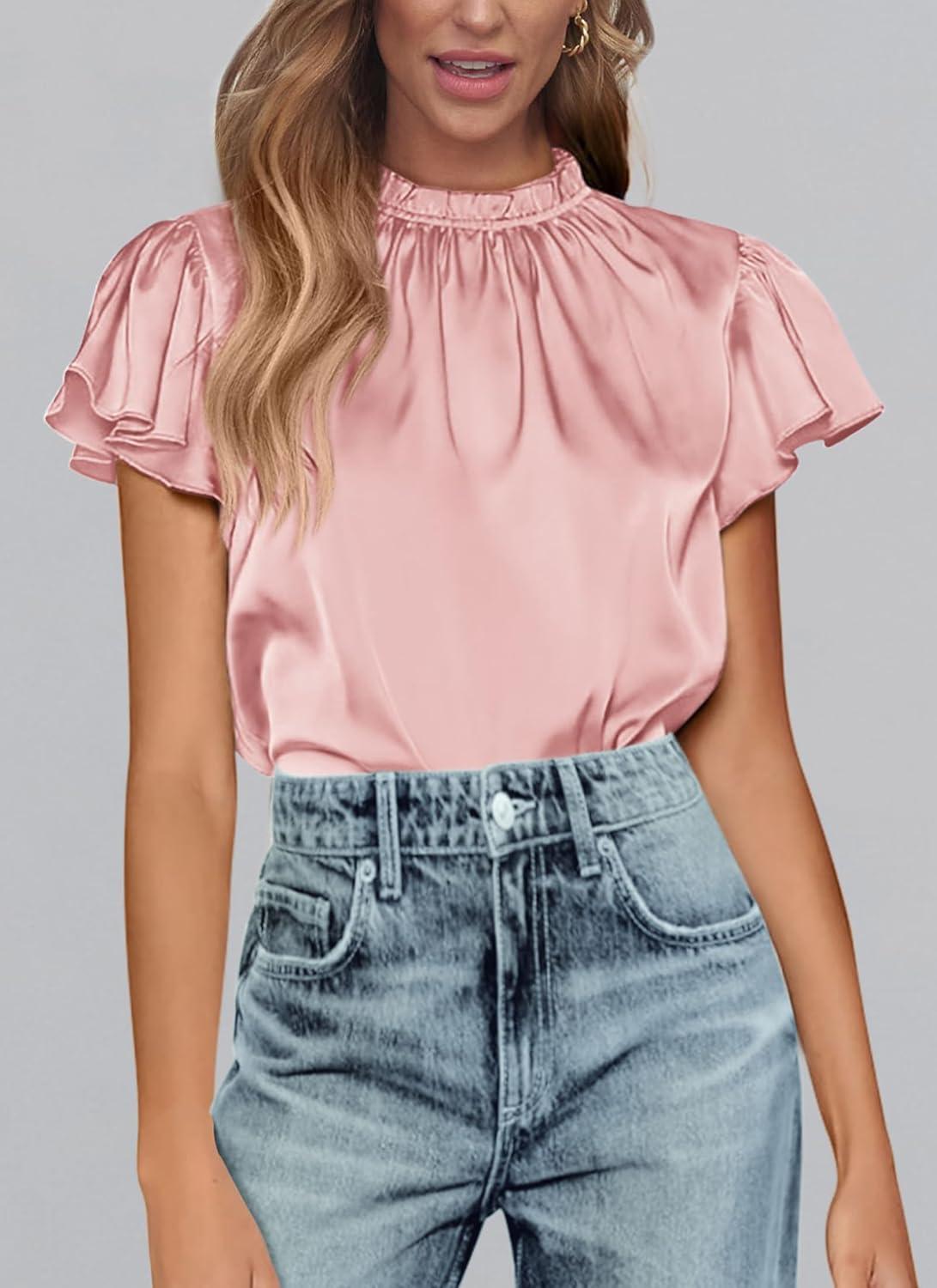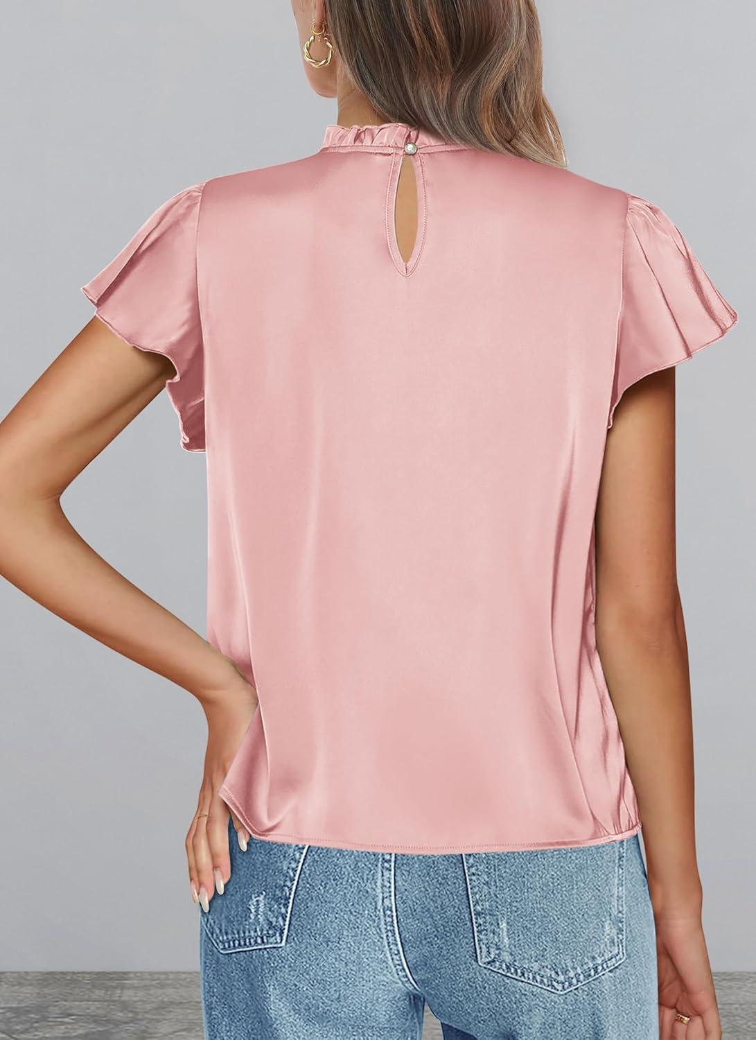 PRETTYGARDEN Business Casual Tops for Women Blouses Dressy 2025 Summer Short Sleeve Ruffle Satin Work Office Attire(Pink)