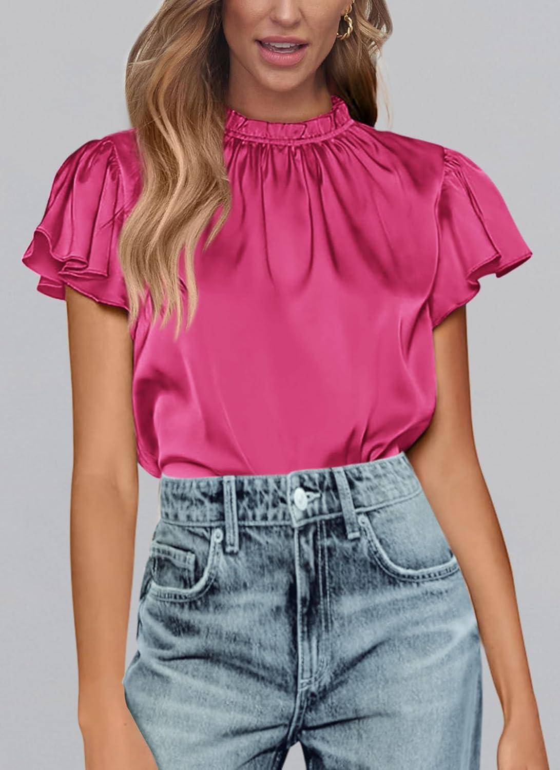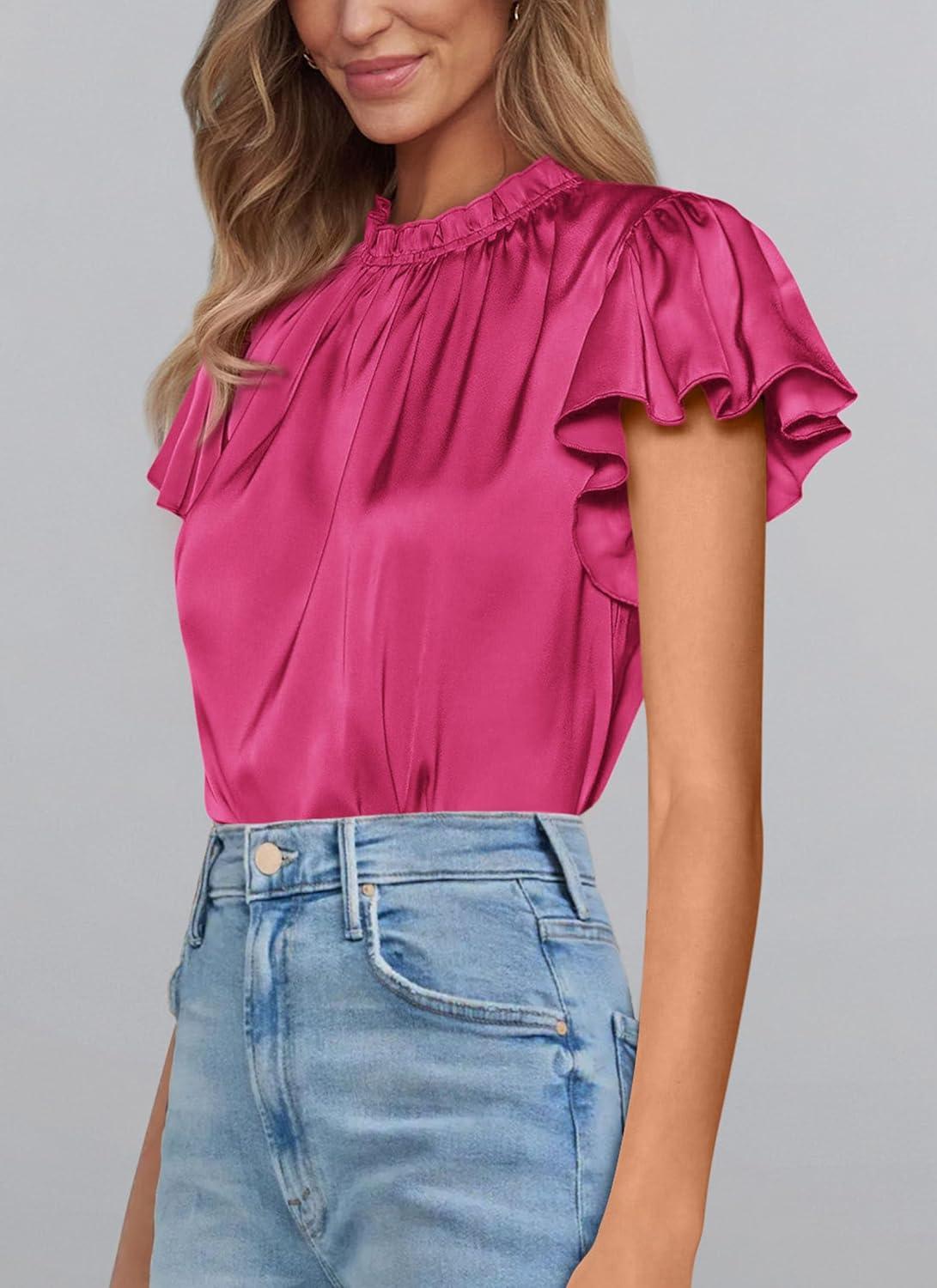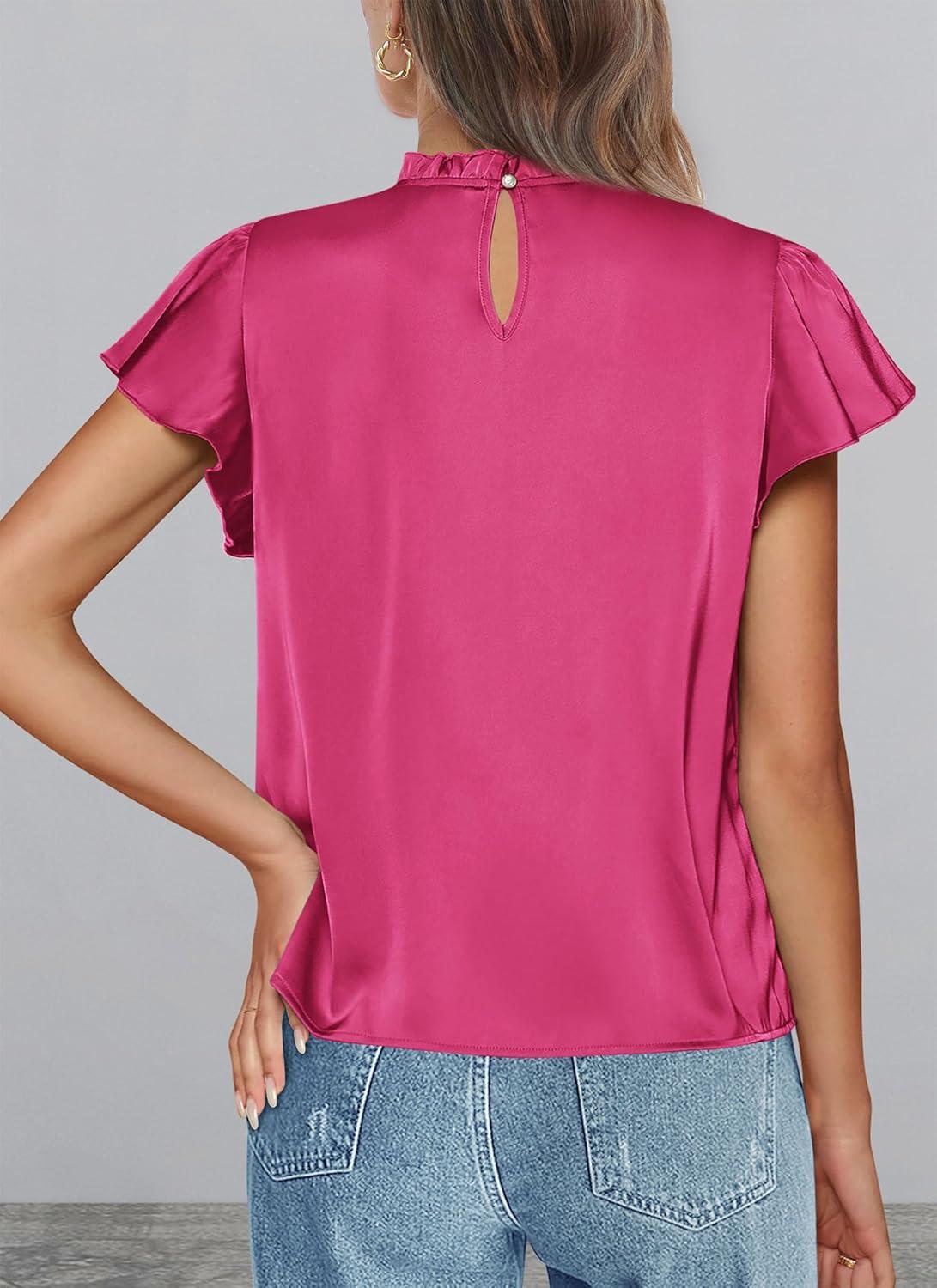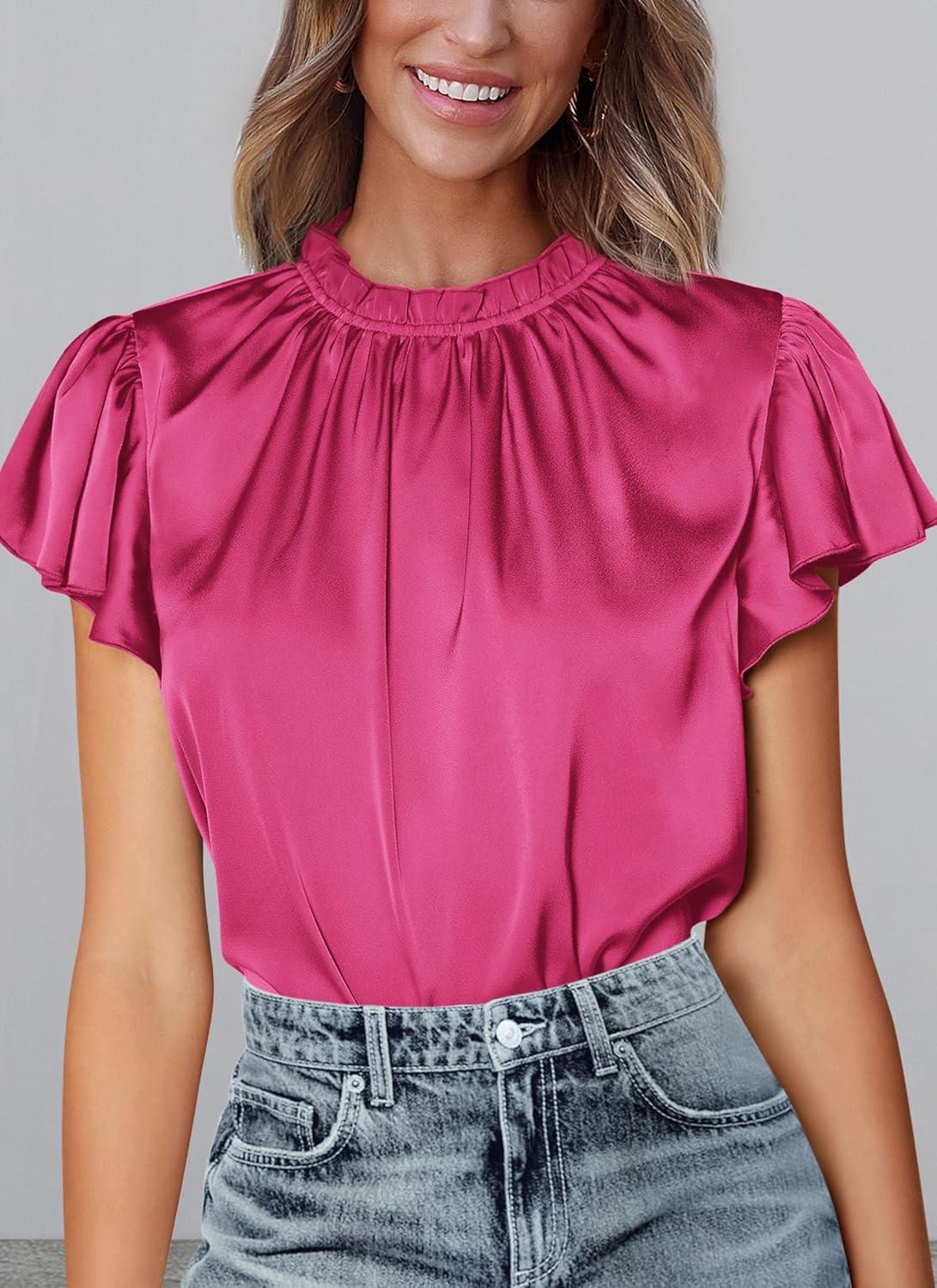 PRETTYGARDEN Business Casual Tops for Women Blouses Dressy 2025 Summer Short Sleeve Ruffle Satin Work Office Attire(Rose Red)