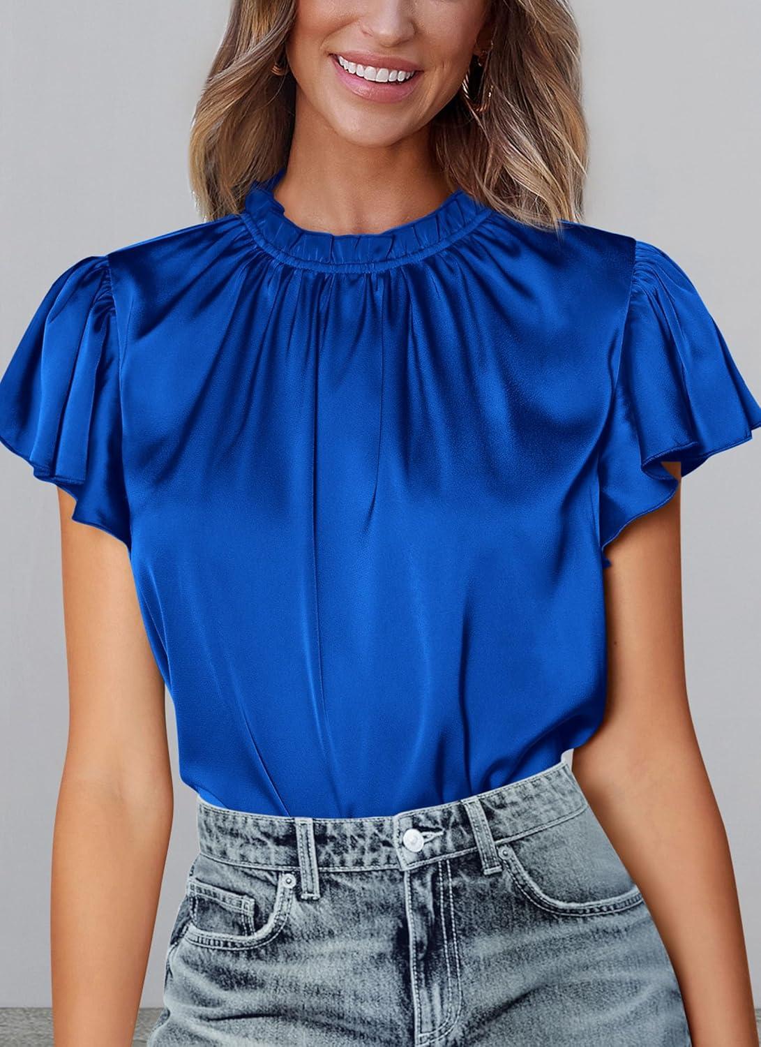 PRETTYGARDEN Business Casual Tops for Women Blouses Dressy 2025 Summer Short Sleeve Ruffle Satin Work Office Attire(Royal Blue)
