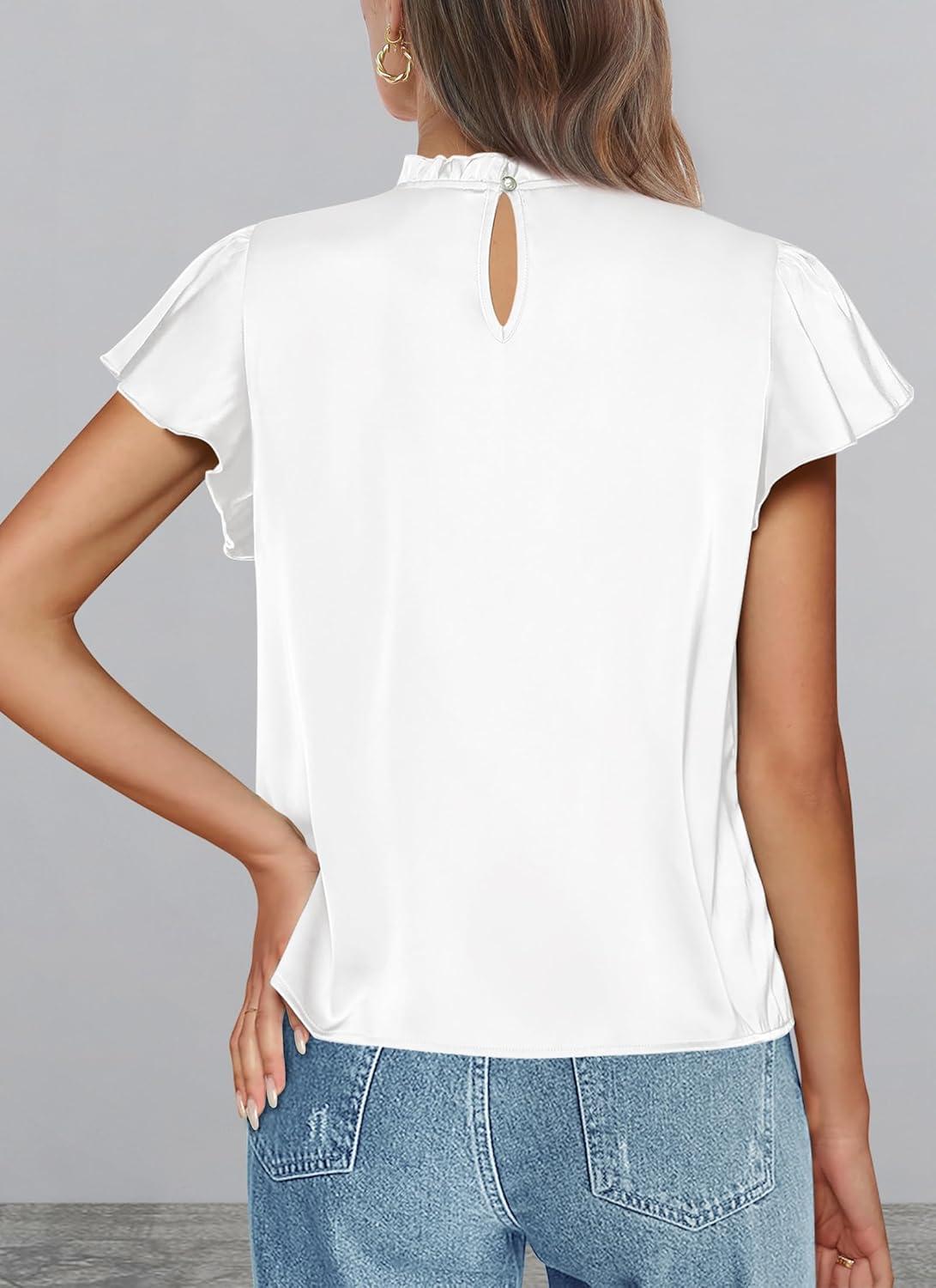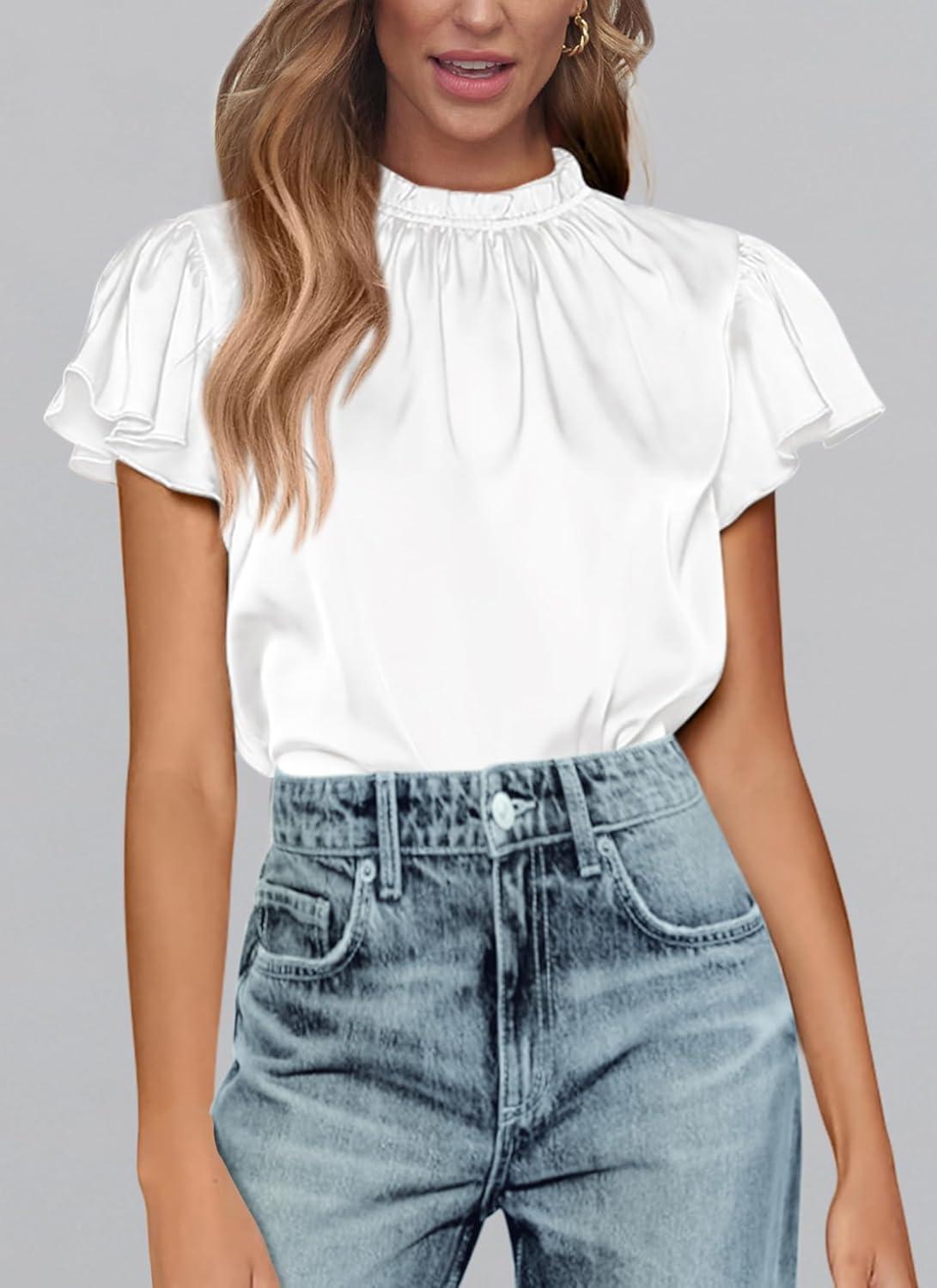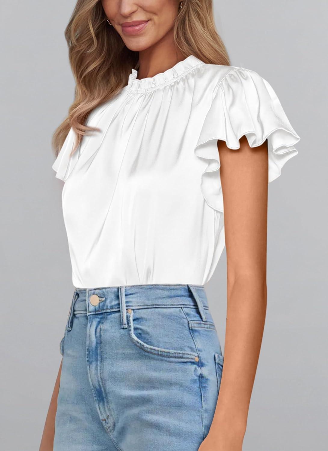 PRETTYGARDEN Business Casual Tops for Women Blouses Dressy 2025 Summer Short Sleeve Ruffle Satin Work Office Attire(White)
