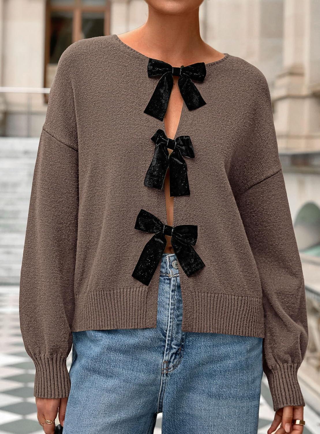 PRETTYGARDEN Cardigan Sweaters for Women Fall Fashion 2025 Bow Tie Front Long Sleeve Knit Sweater Tops Cute Winter Clothes(Coffee)
