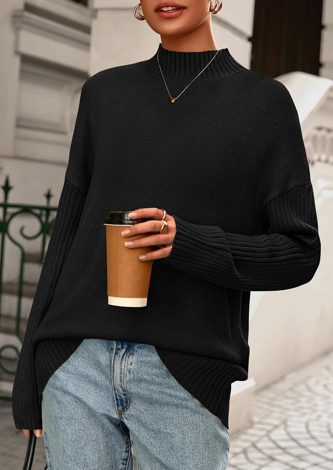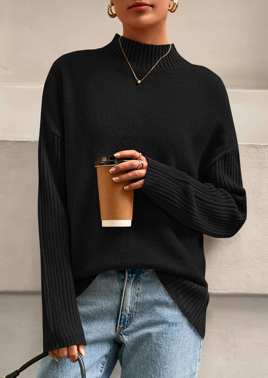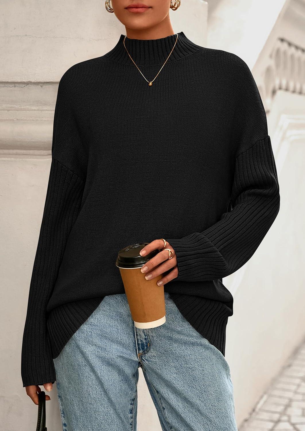 PRETTYGARDEN Casual Long Sleeve Oversized Sweaters for Women 2025 Loose Mock Neck Pullover Sweater Ribbed Knit Fall Clothes(Black)