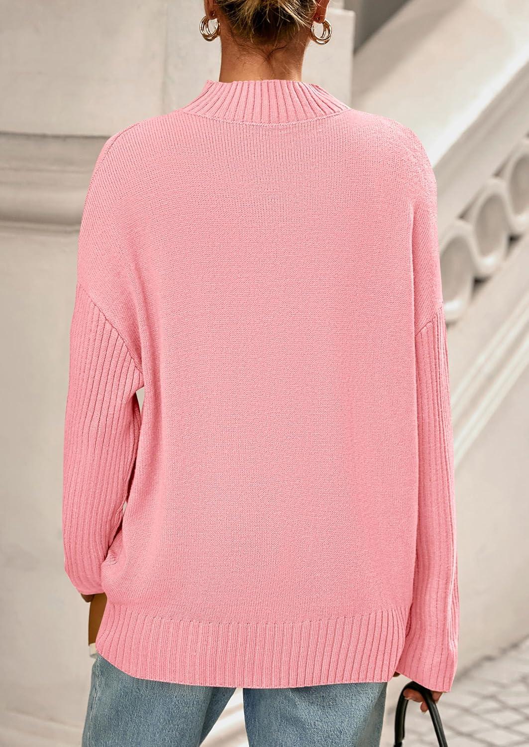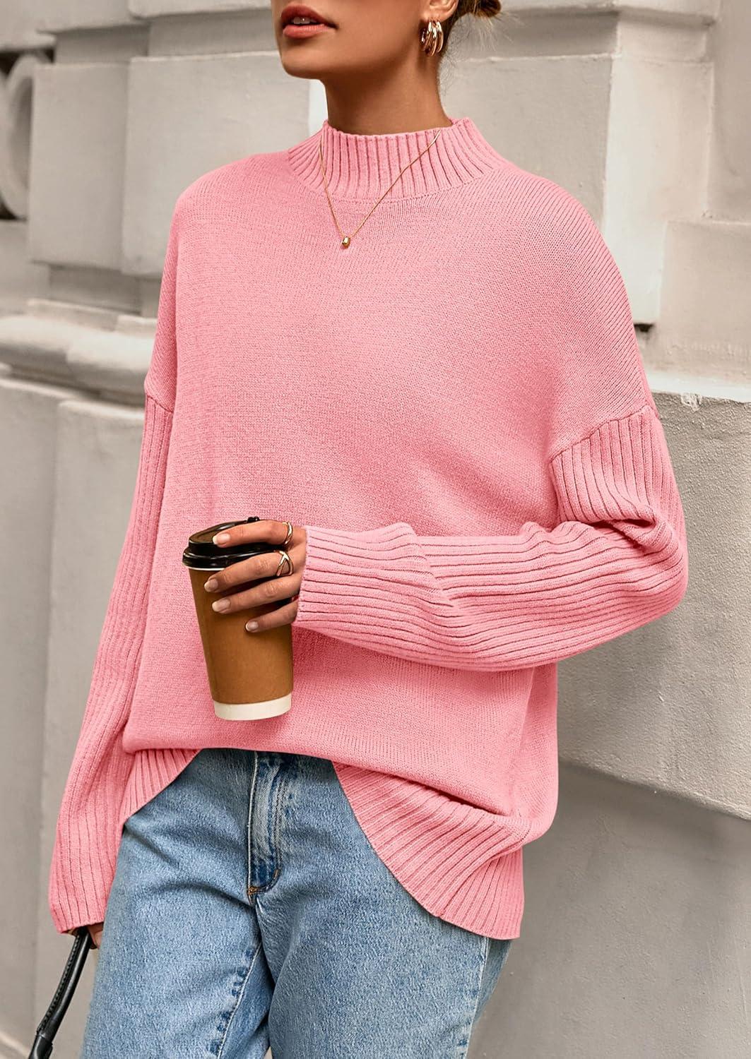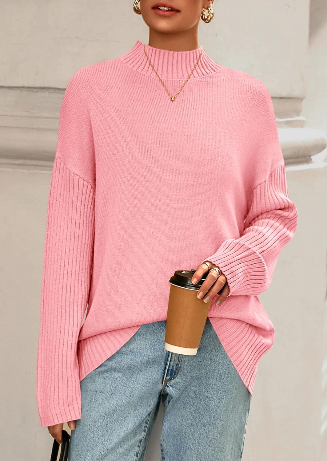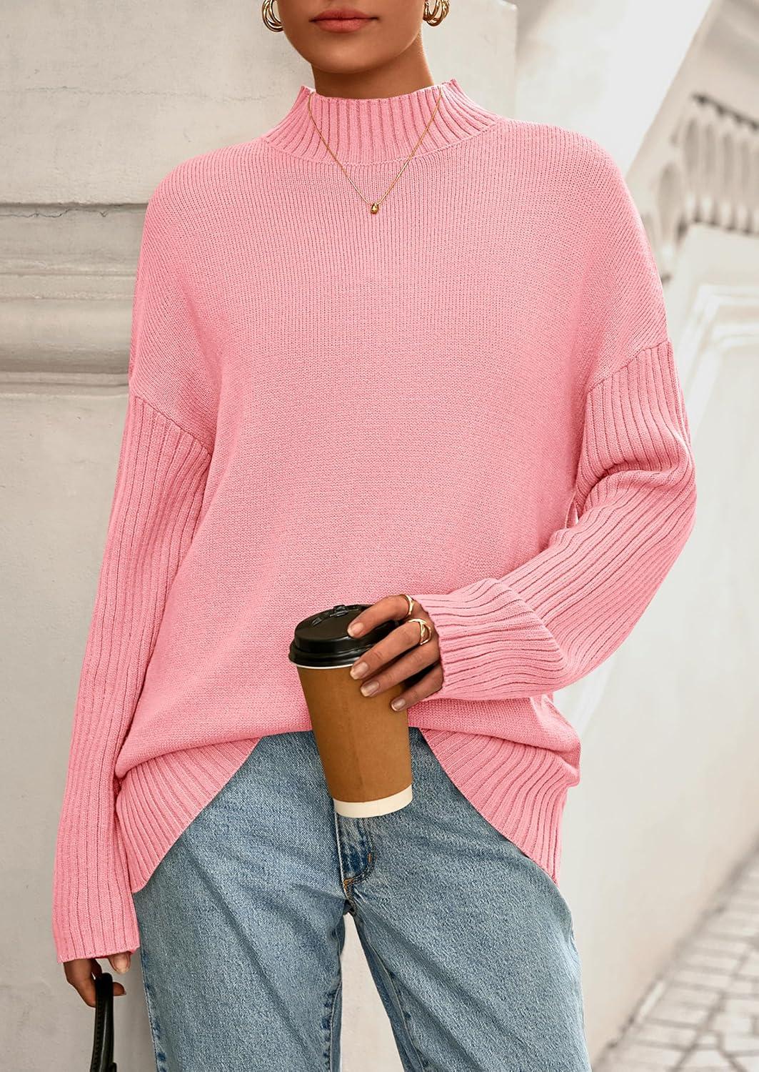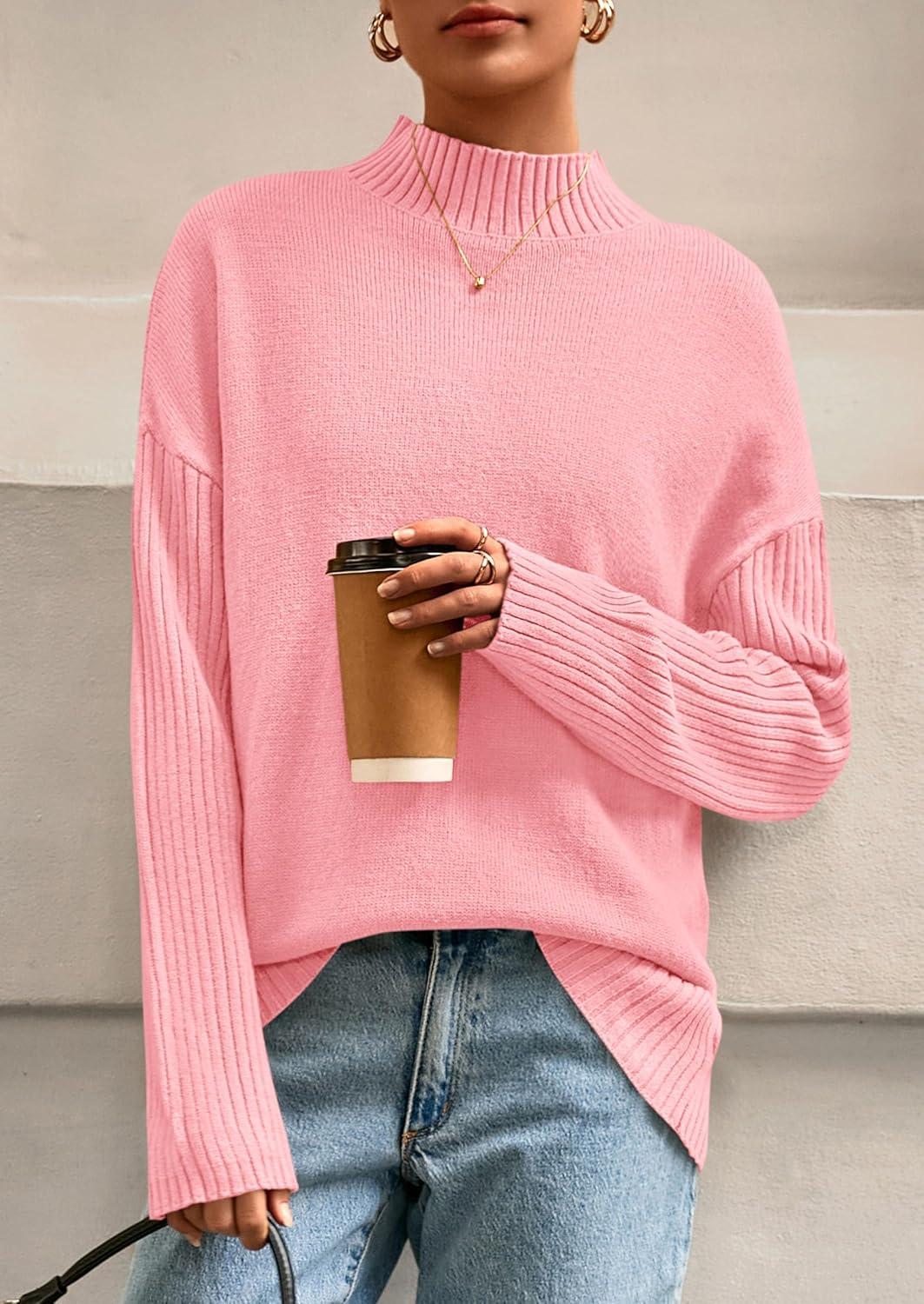 PRETTYGARDEN Casual Long Sleeve Oversized Sweaters for Women 2025 Loose Mock Neck Pullover Sweater Ribbed Knit Fall Clothes(Pink)