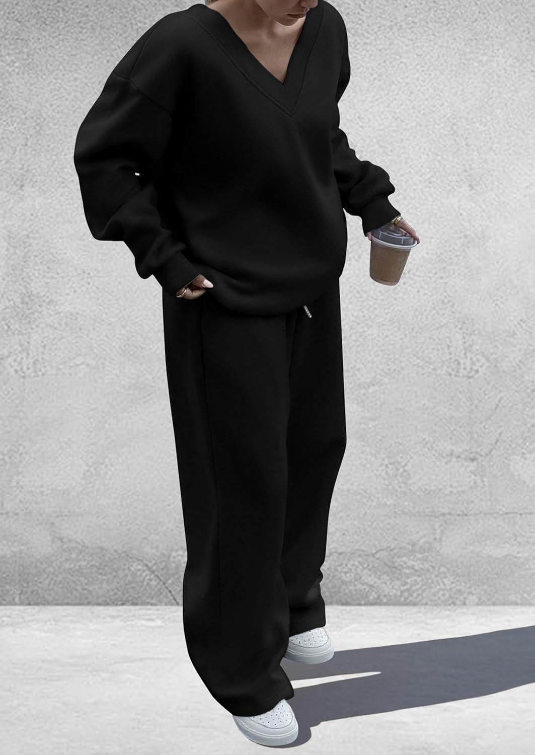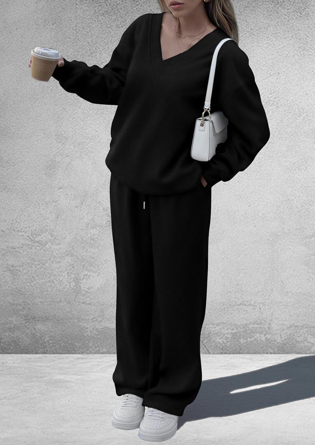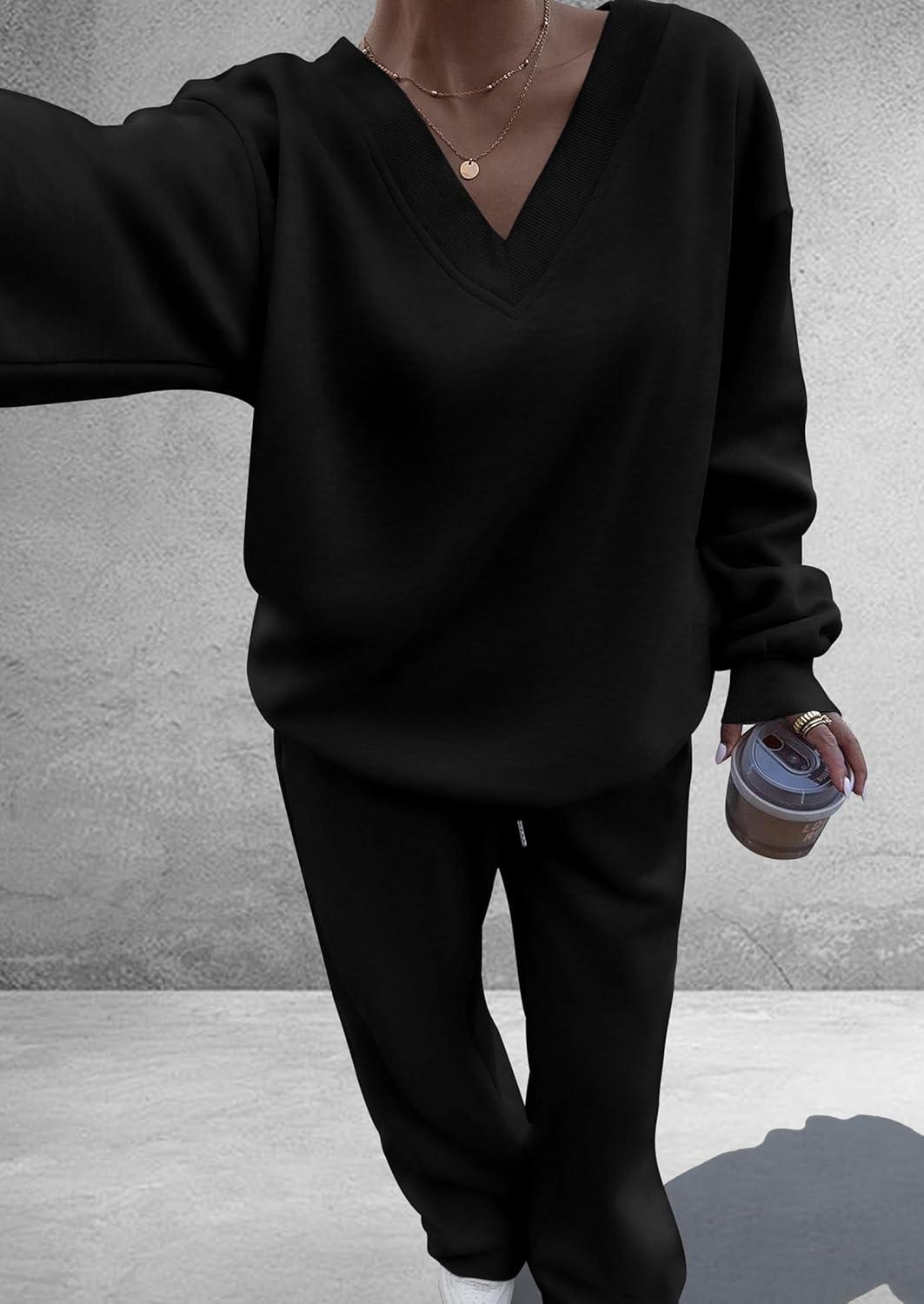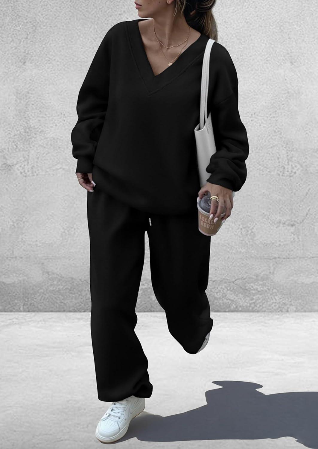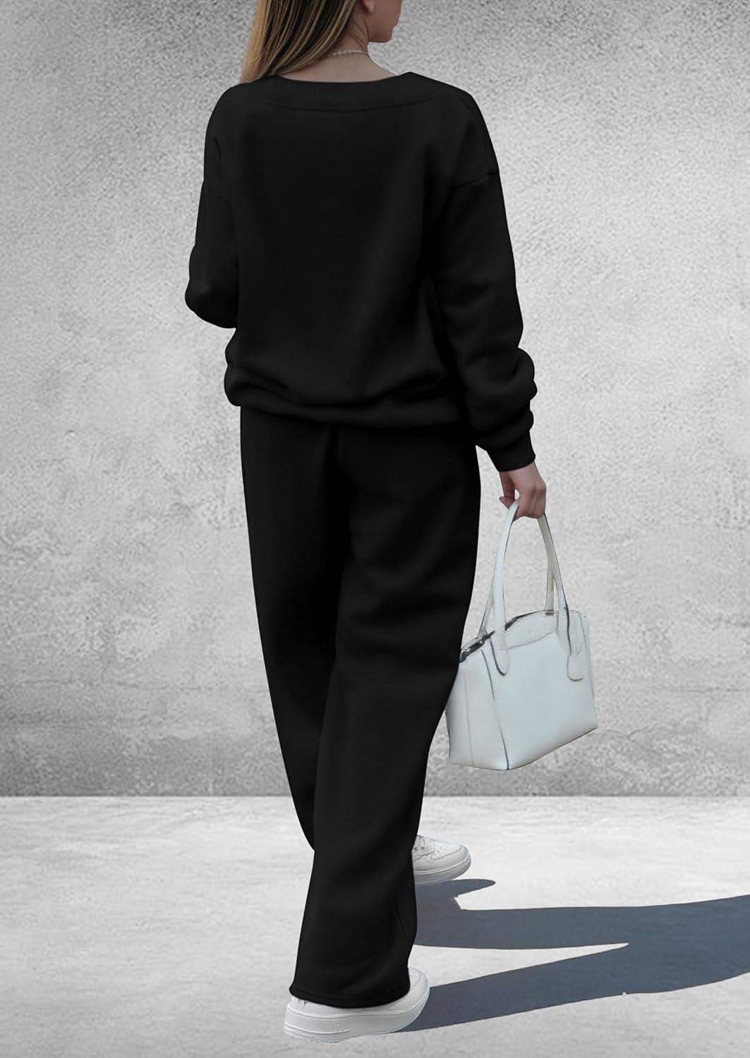 PRETTYGARDEN Casual Winter Two Piece Sets for Women 2025 V Neck Sweatshirt Loose Wide Leg Pants Tracksuit Knit Fall Outfits(Black)