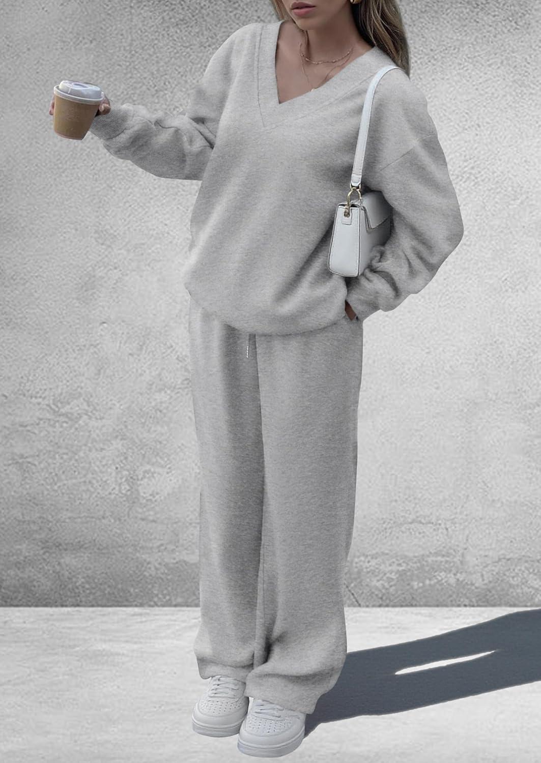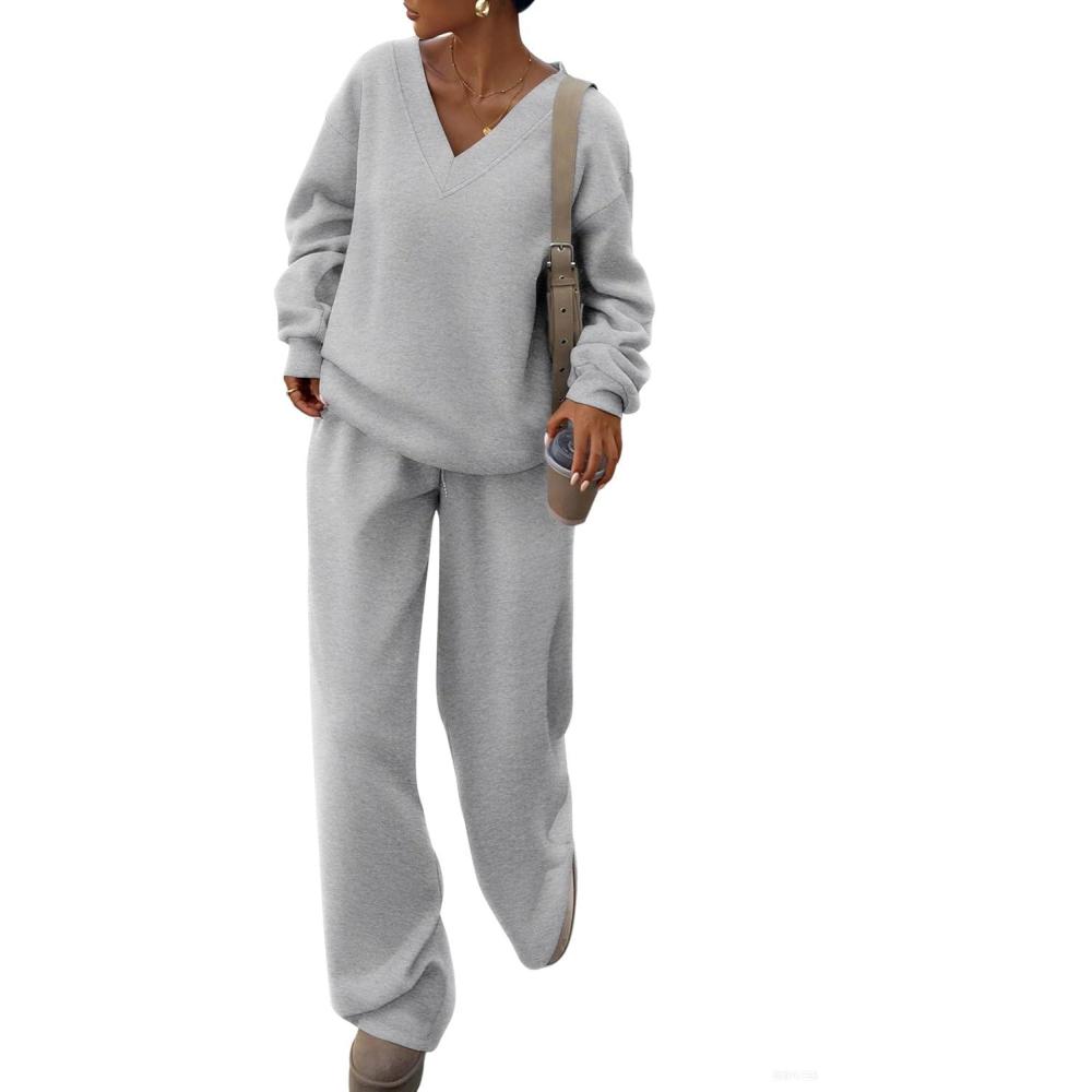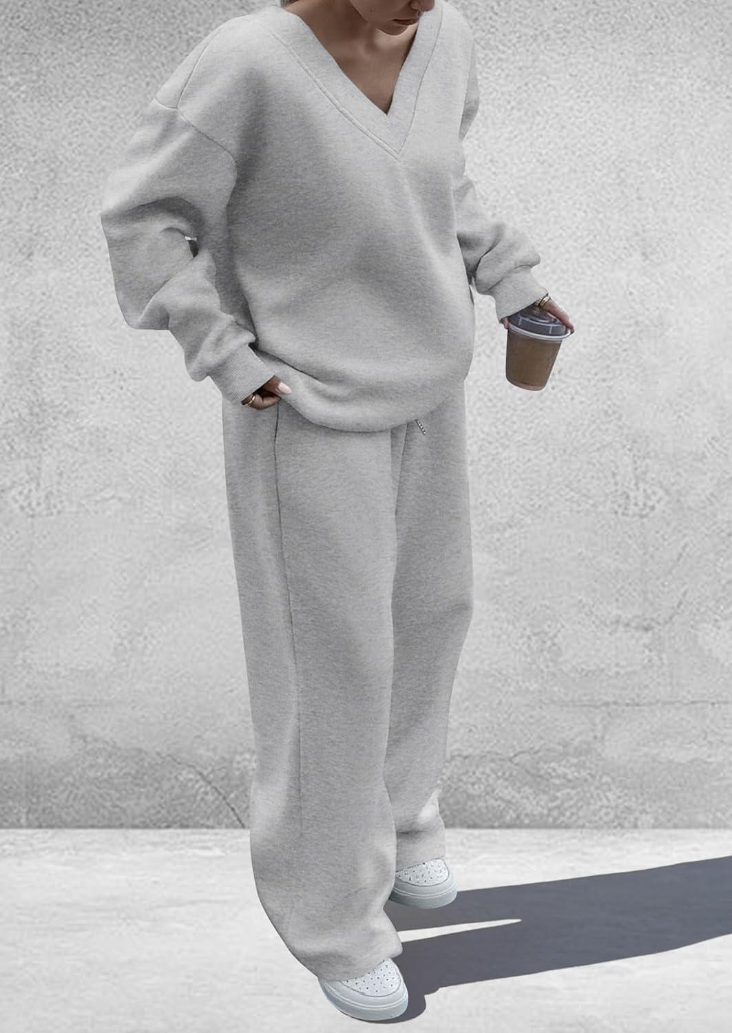 PRETTYGARDEN Casual Winter Two Piece Sets for Women 2025 V Neck Sweatshirt Loose Wide Leg Pants Tracksuit Knit Fall Outfits(Grey)