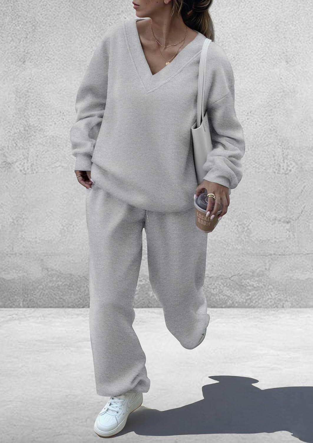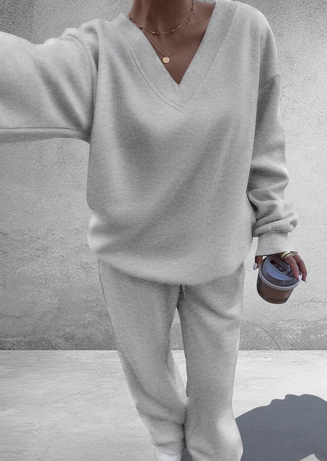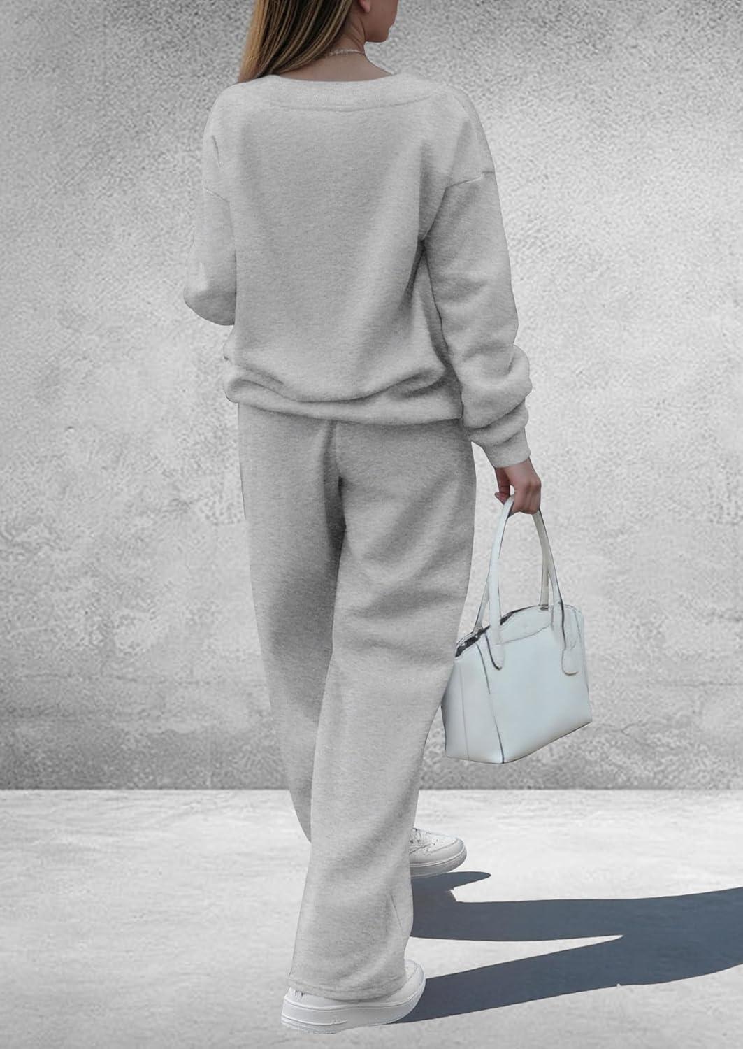 PRETTYGARDEN Casual Winter Two Piece Sets for Women 2025 V Neck Sweatshirt Loose Wide Leg Pants Tracksuit Knit Fall Outfits(Grey)