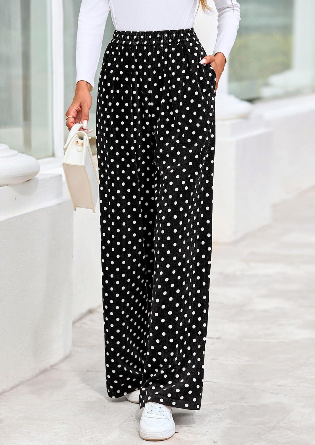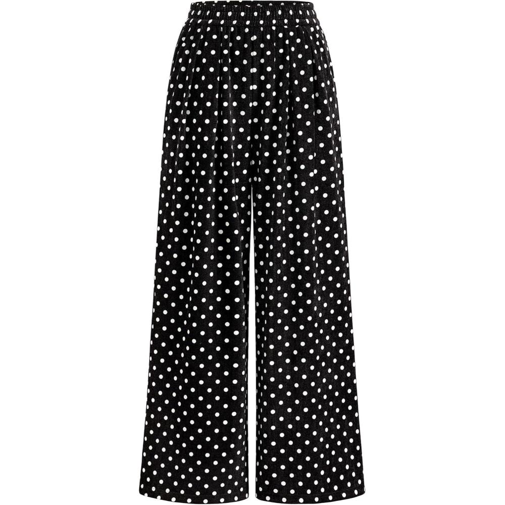 PRETTYGARDEN Casual Women’s Pants 2025 Elastic Waist Palazzo Long Stretchy Wide Leg Trousers Knit Fall Outfits with Pockets(Dot Black White)
