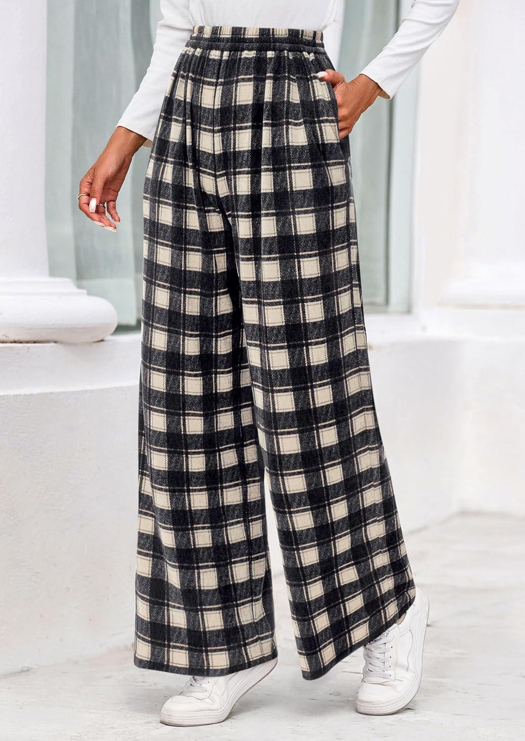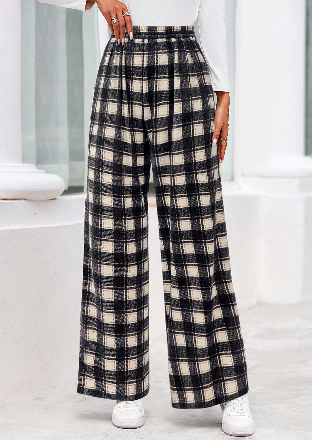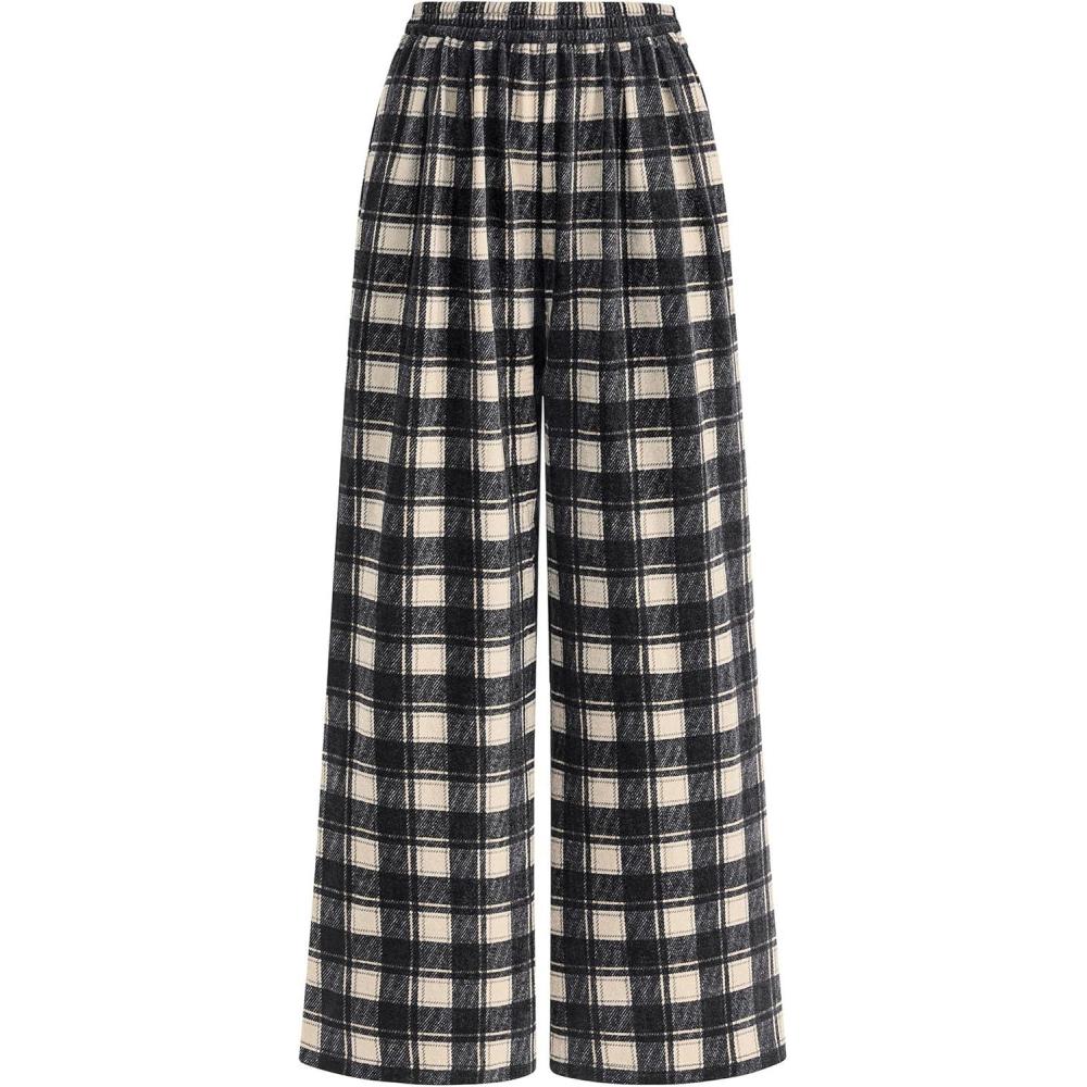 PRETTYGARDEN Casual Women's Pants 2025 Elastic Waist Palazzo Long Stretchy Wide Leg Trousers Knit Fall Outfits with Pockets(Plaid Black)