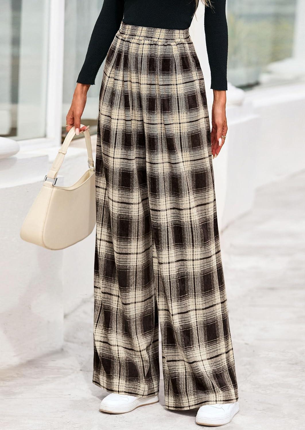 PRETTYGARDEN Casual Women's Pants 2025 Elastic Waist Palazzo Long Stretchy Wide Leg Trousers Knit Fall Outfits with Pockets(Plaid Brown Apricot)