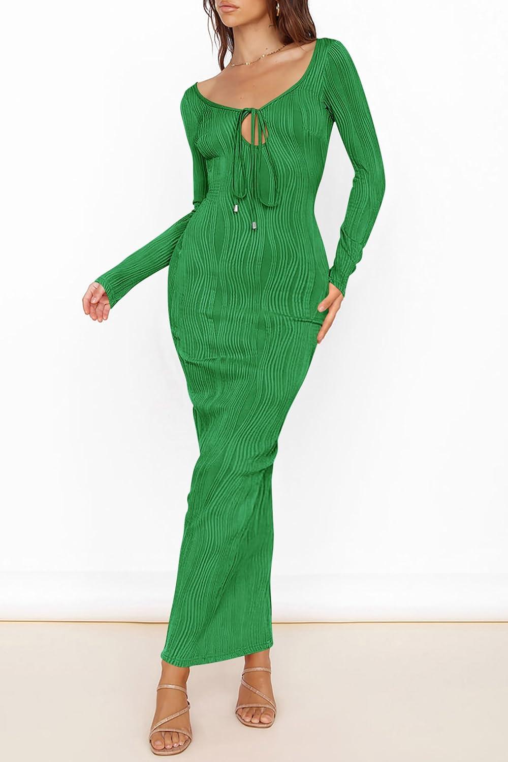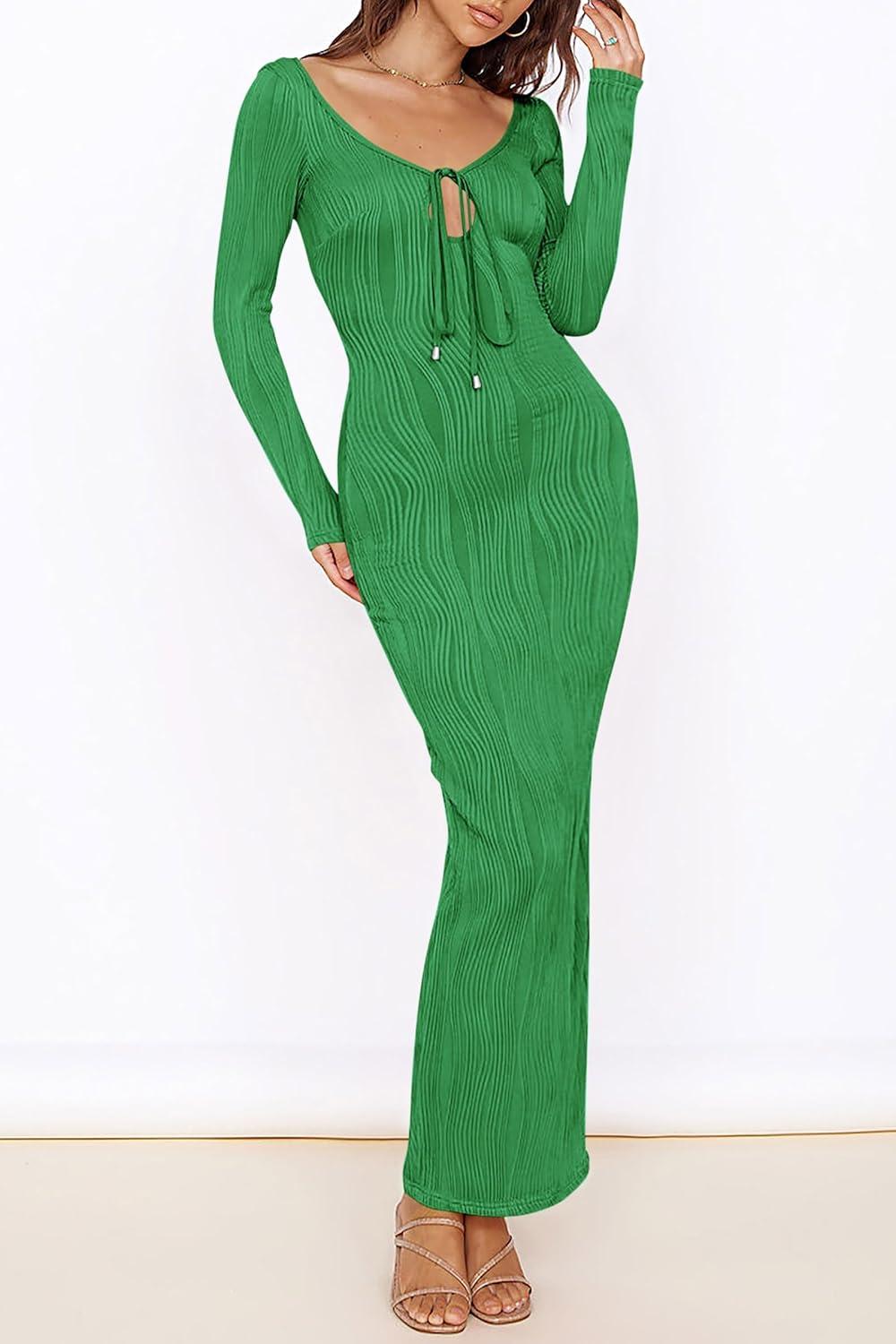 PRETTYGARDEN Cocktail Dresses for Women 2024 Fall Long Sleeve Tie Front Cut Out Bodycon Sexy Club Party Maxi Dress(Green)