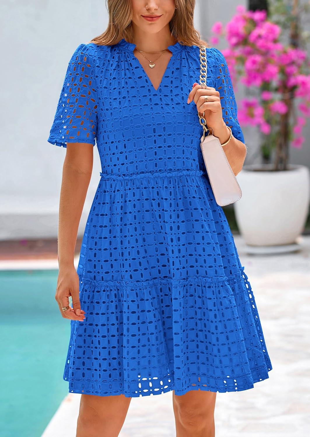 PRETTYGARDEN Eyelet Dresses for Women 2025 Summer Short Sleeve V Neck Hollow Out Ruffle A Line Boho Beach Vacation Mini Dress(Blue)