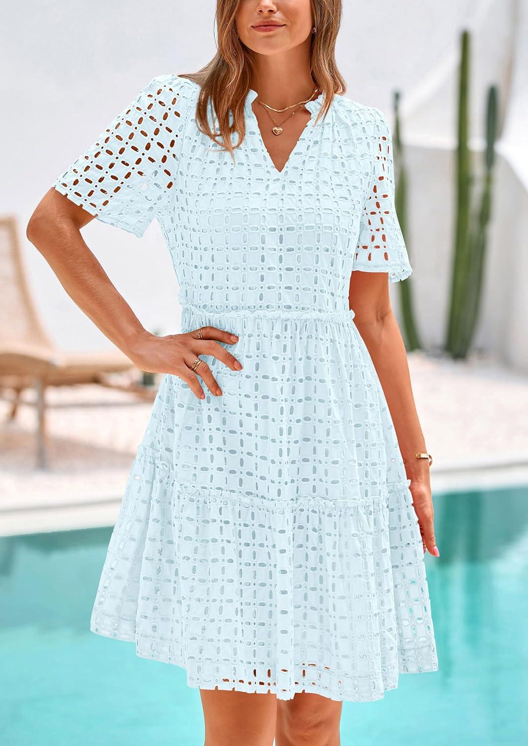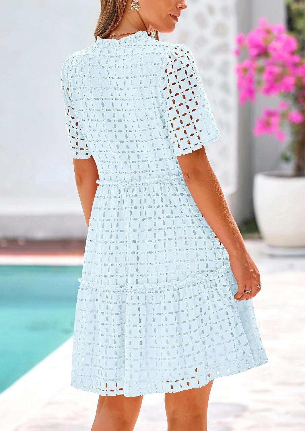 PRETTYGARDEN Eyelet Dresses for Women 2025 Summer Short Sleeve V Neck Hollow Out Ruffle A Line Boho Beach Vacation Mini Dress(Light Blue)