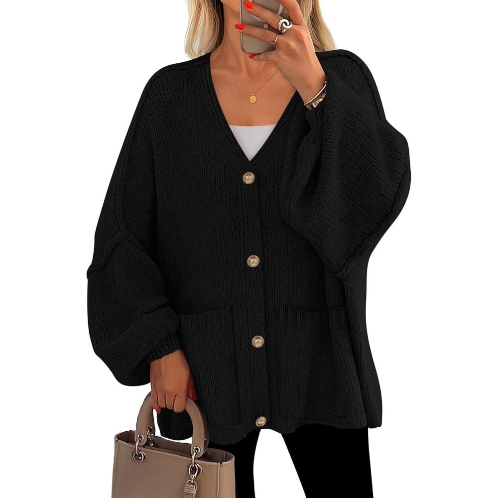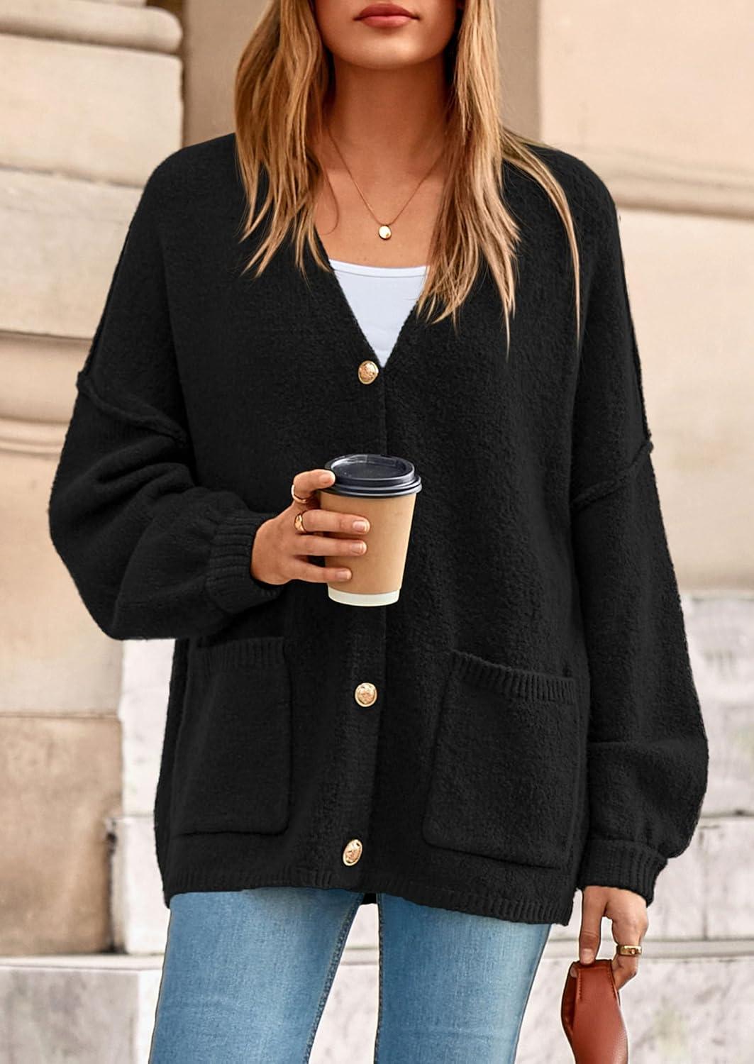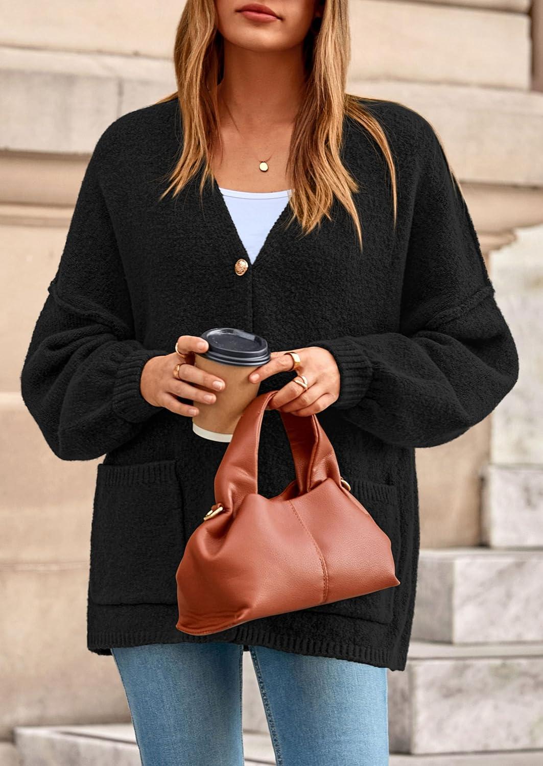 PRETTYGARDEN Fall Chunky Cardigan Sweaters for Women 2025 Button Lantern Sleeve Knit Oversized Sweater Coats with Pockets(Black)