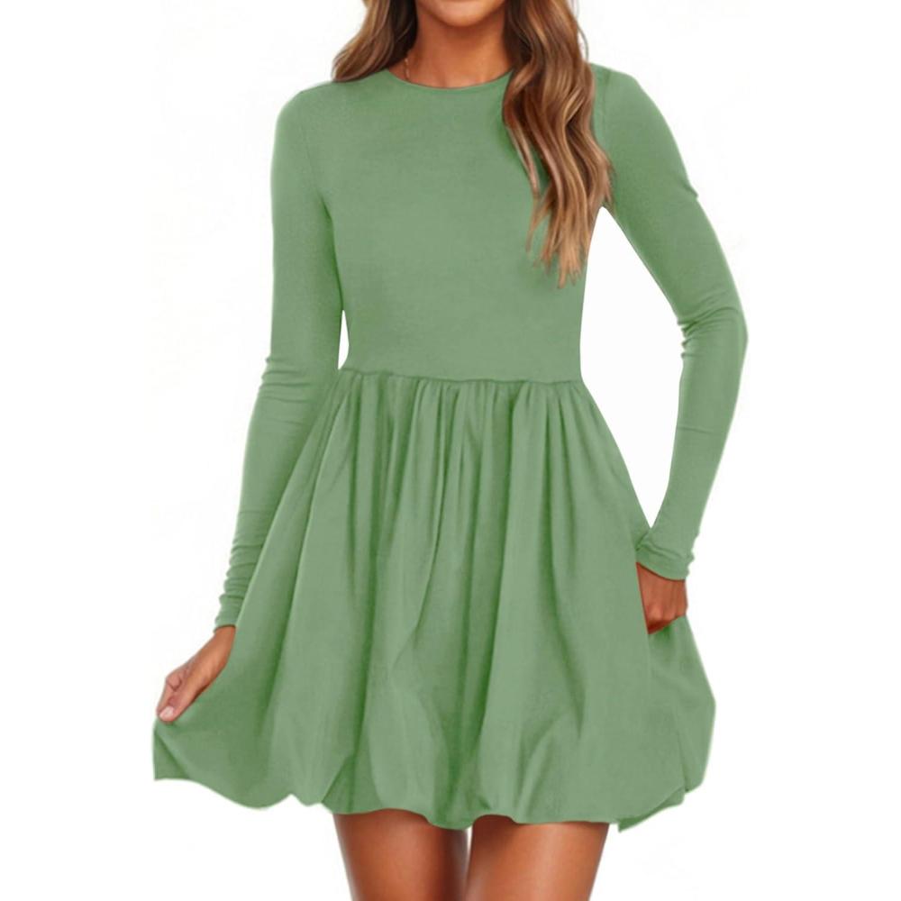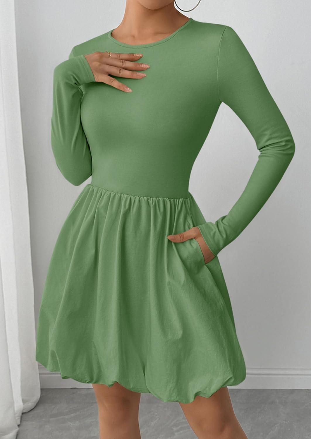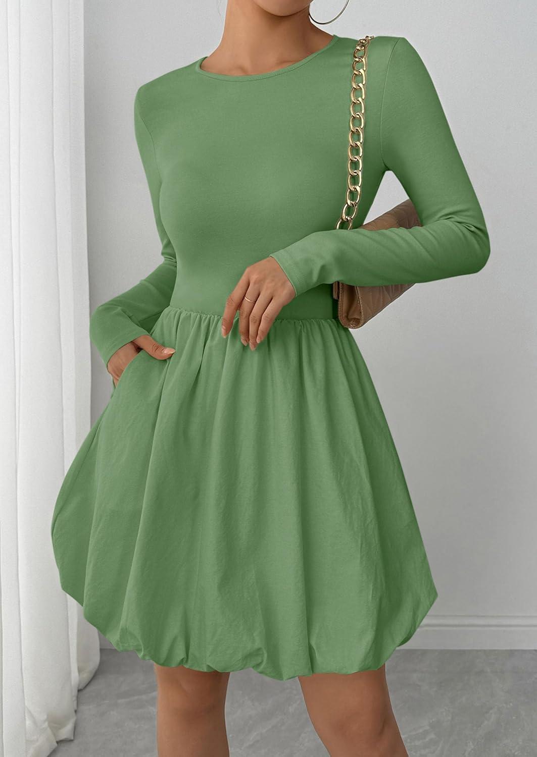 PRETTYGARDEN Fall Dresses for Women 2025 Casual Long Sleeve Bubble Cute Crew Neck A Line Mini Short Dress with Pockets(Light Green)