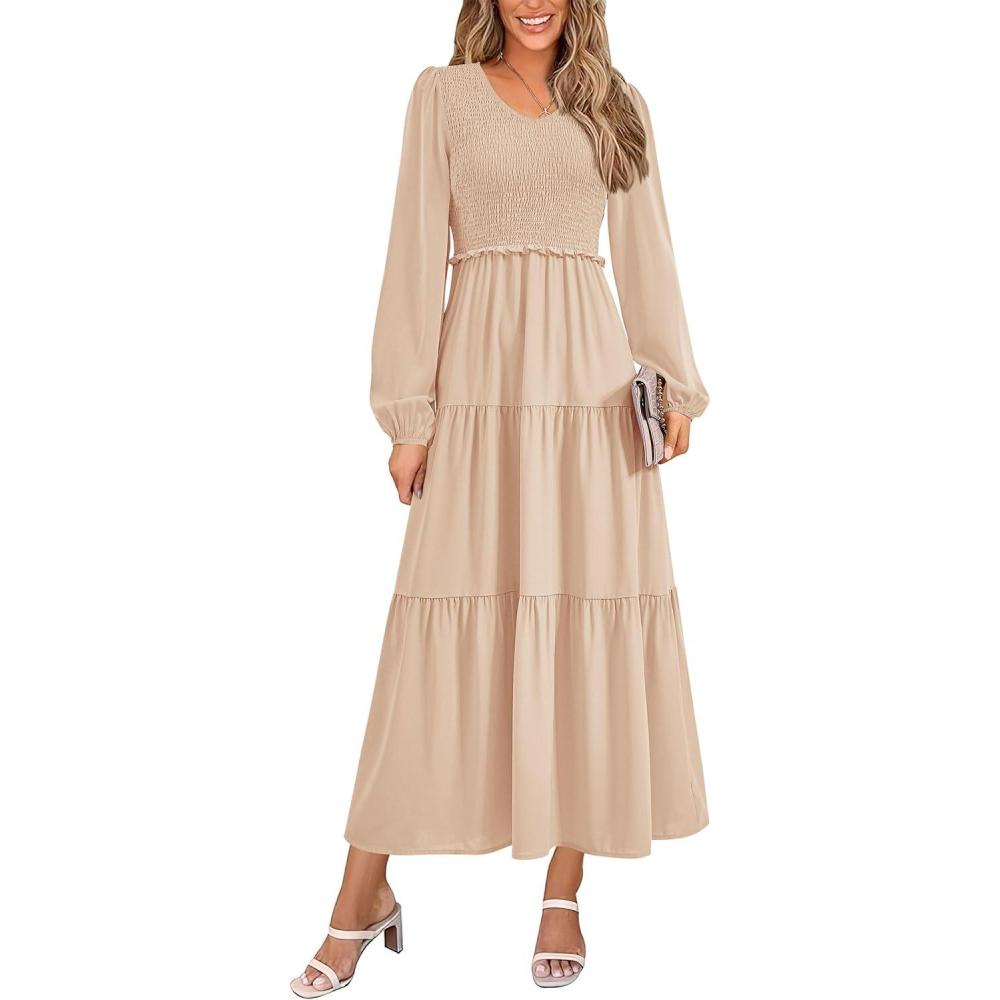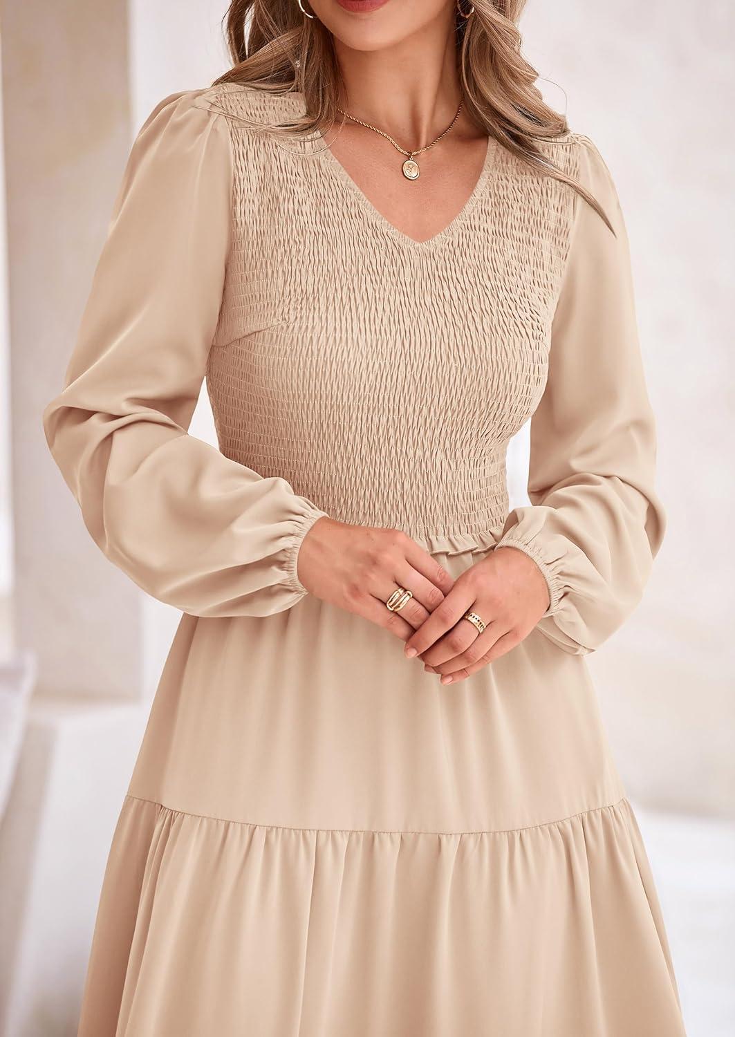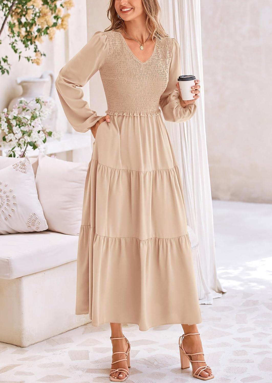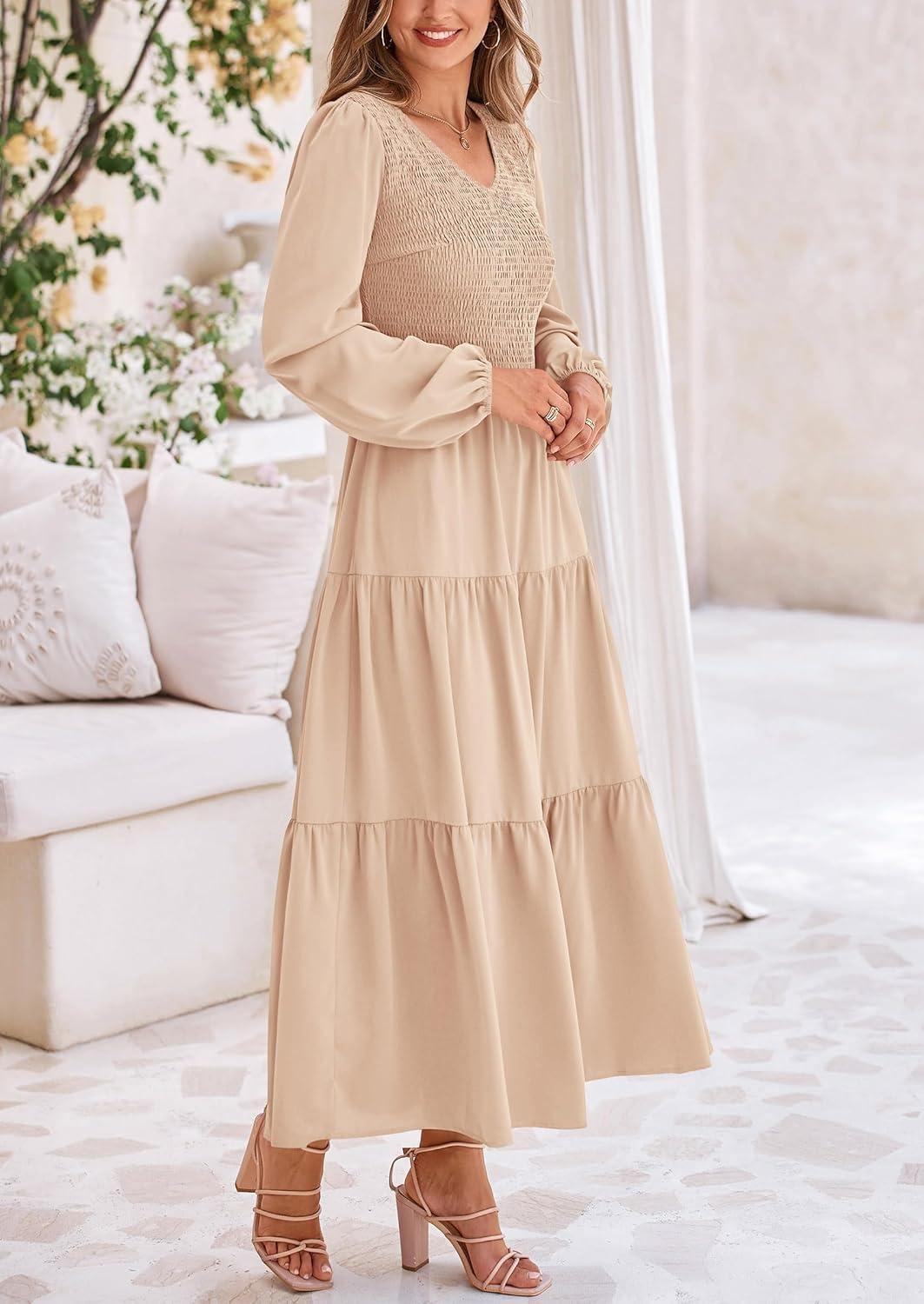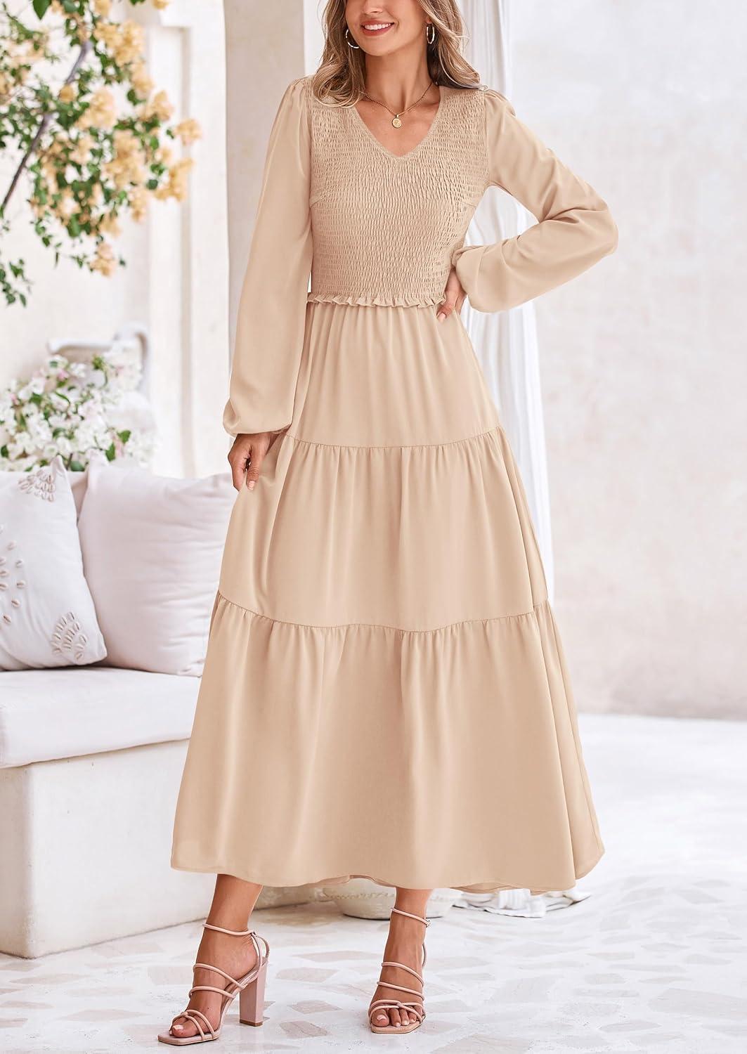 PRETTYGARDEN Fall Dresses for Women 2025 Casual Long Sleeve V Neck Smocked A Line Long Flowy Wedding Guest Dress(Apricot)