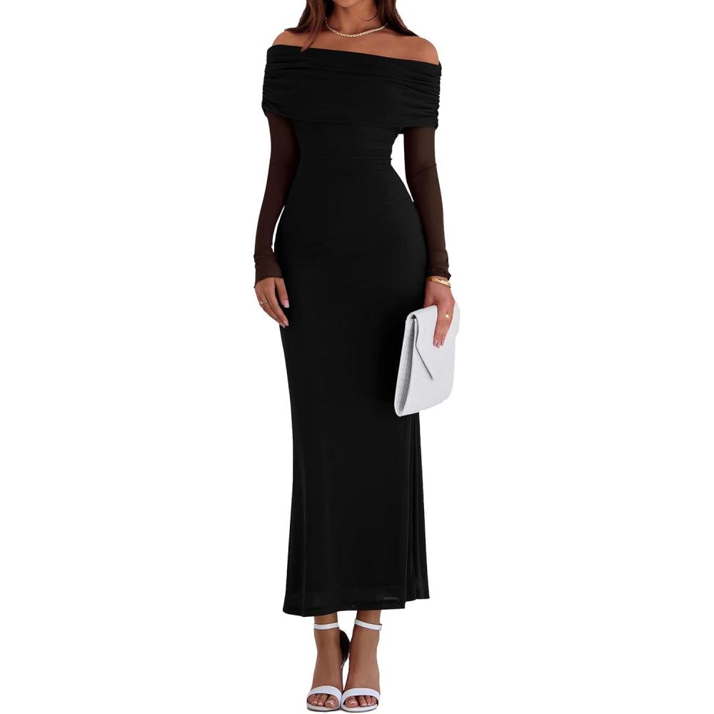 PRETTYGARDEN Fall Dresses for Women 2025 Elegant Off The Shoulder Long Sleeve Formal Wedding Guest Bodycon Maxi Dress(Black)